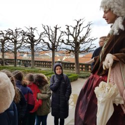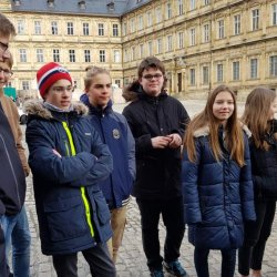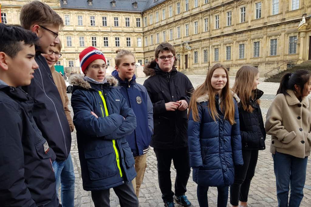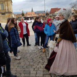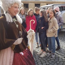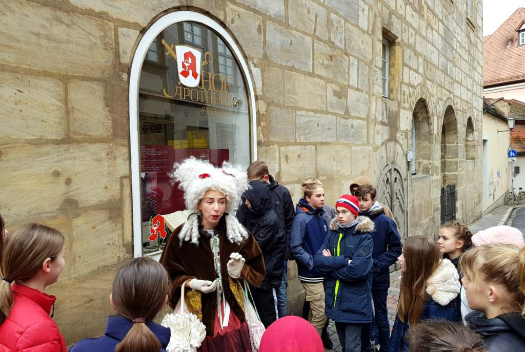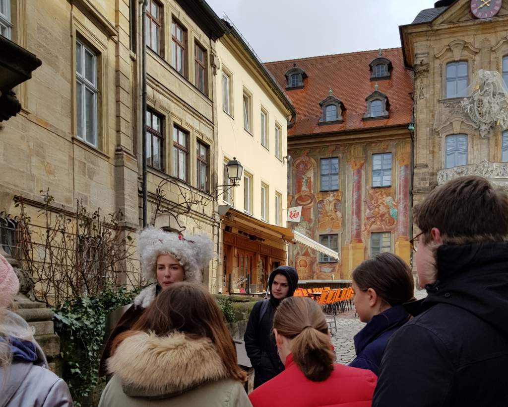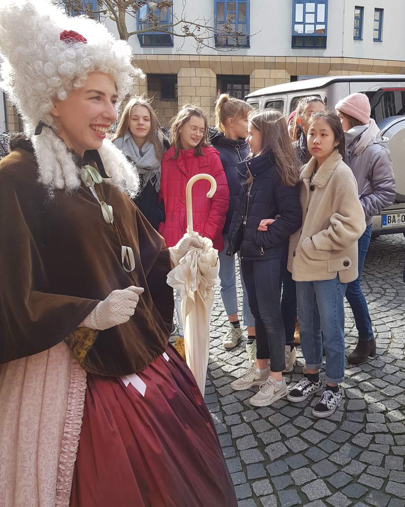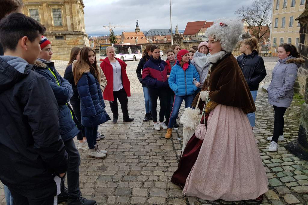 Es ist Montagmorgen, die Schülerinnen und Schüler der Klasse 8a des E.T.A. Hoffmann-Gymnasiums stehen in einem Halbkreis und hören gespannt einer Führerin zu. Diese trägt extravagante Kleidung: sie hat ein Kleid, das aus Seide ist, dieses Gewand hat viele Verzierungen, außerdem ist es ab der Hüfte bis auf den Boden weit ausgestellt. Auch ihr Haar ist bemerkenswert, sie trägt eine weiße Perücke, die lockig und in die Höhe gesteckt ist. „Ich bin Mariya Zoryk und komme aus dem Barock…“ beginnt sie. Die Schüler mustern sie dabei fragwürdig und erstaunt.