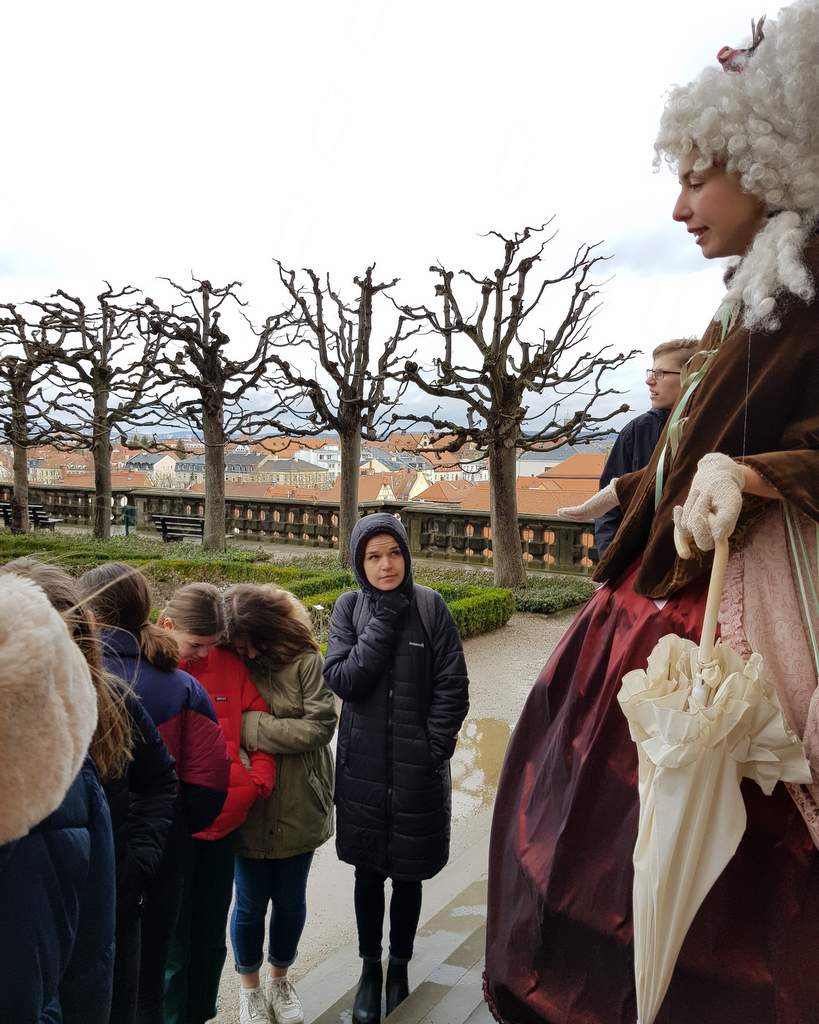 Der Rundgang führte die Schüler zu verschiedenen, gut bekannten Gebäuden, die nun unter diesem Blickwinkel ganz neu und wohl auch intensiver wahrgenommen wurden. Neben dem barocken Baustil, der den barocken Lebensstil deutlich vor Augen führte, waren für die Schüler aber immer wieder informative, aber reizvolle Details von noch größerem Interesse.