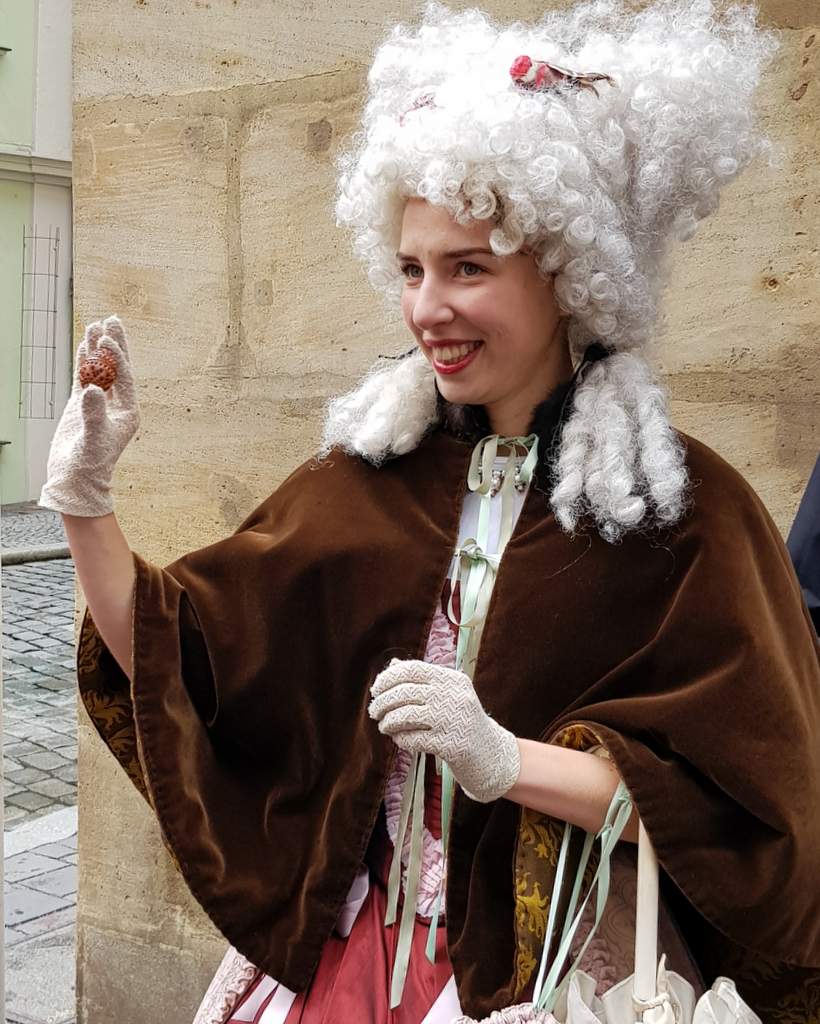 Nach den ersten Stopps am Dom und an der Neuen Residenz wurde auch der Rosengarten besichtigt. Damals war dieser ein Teebaumgarten, denn in der Zeit des Barock war es in Mode, Heißgetränke wie Tee zu trinken. Das nächste barocke Gebäude war die Hofapotheke. Diese hatte für den barocken Menschen weit mehr zu bieten als nur Medikamente. So konnten die Bürger hier Drogen erwerben oder auch Parfum oder Puder.