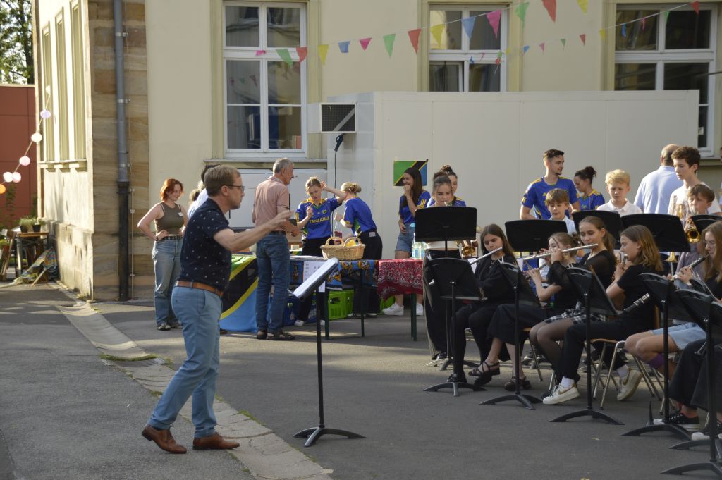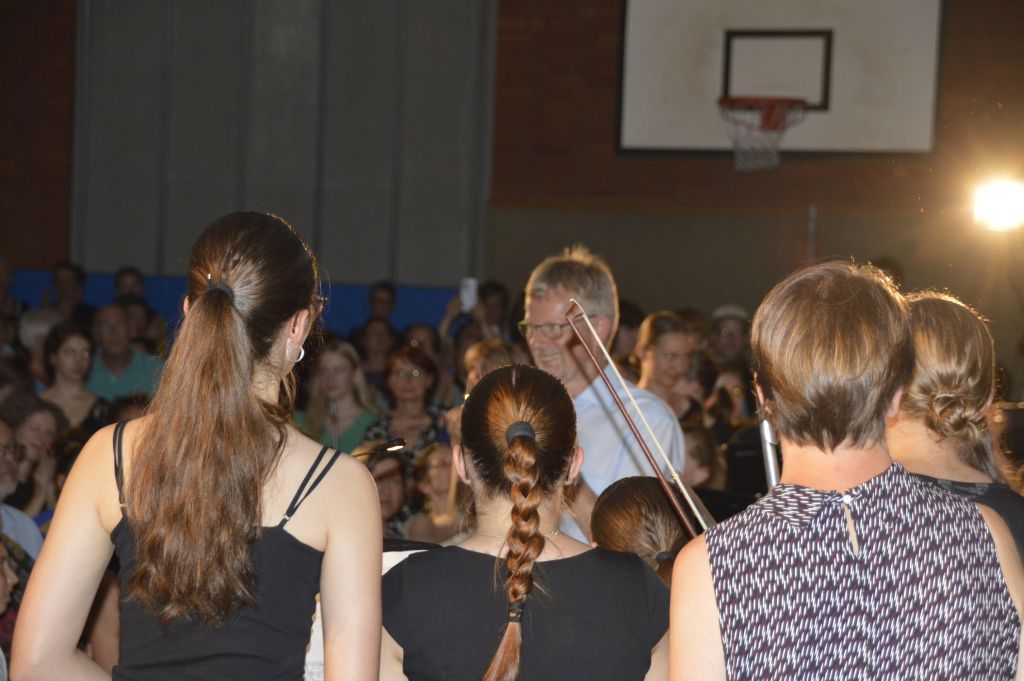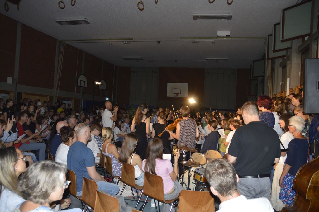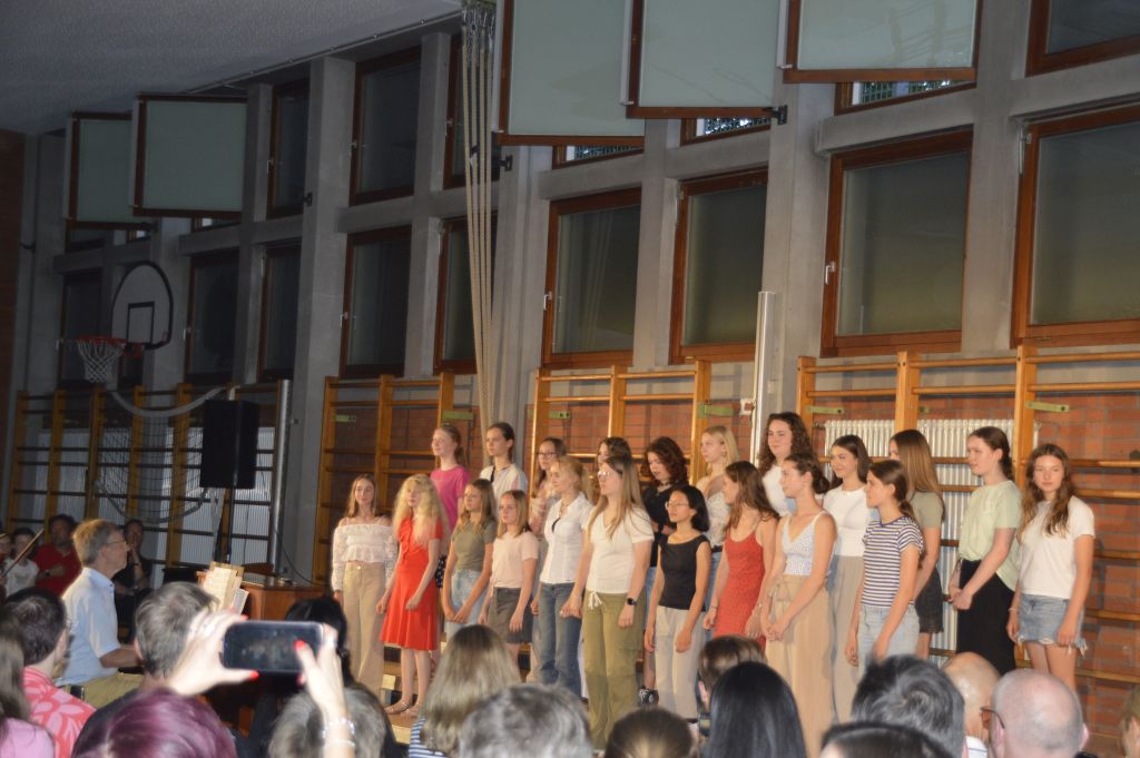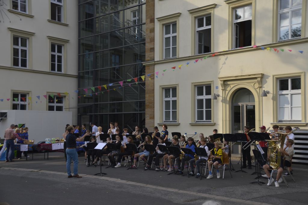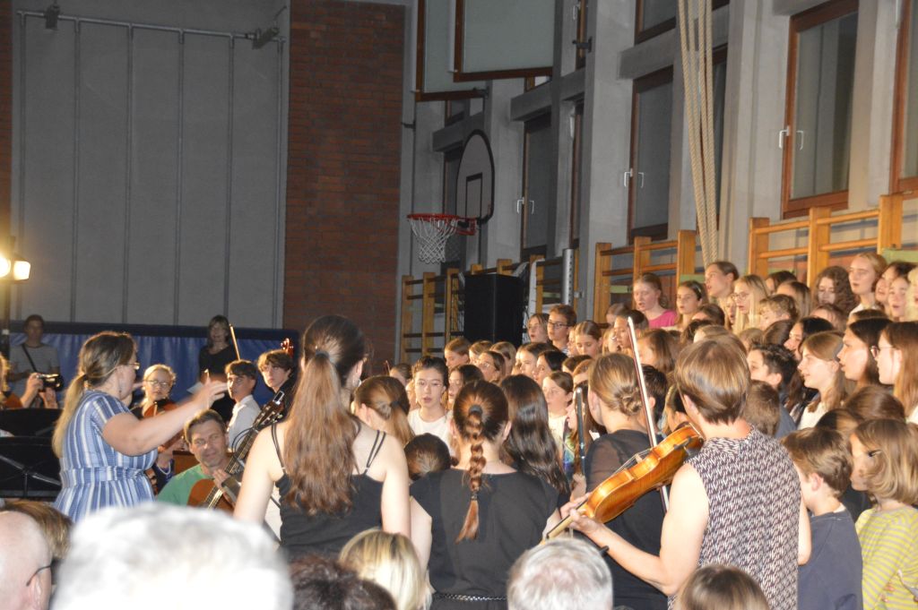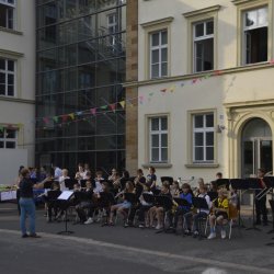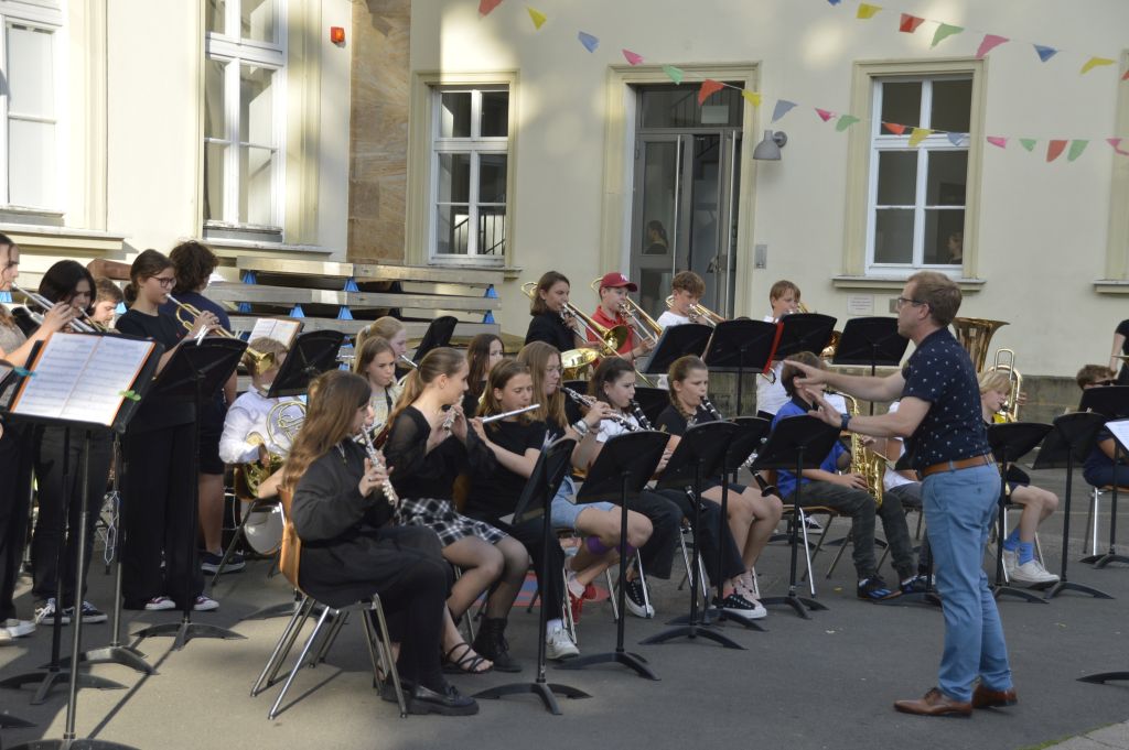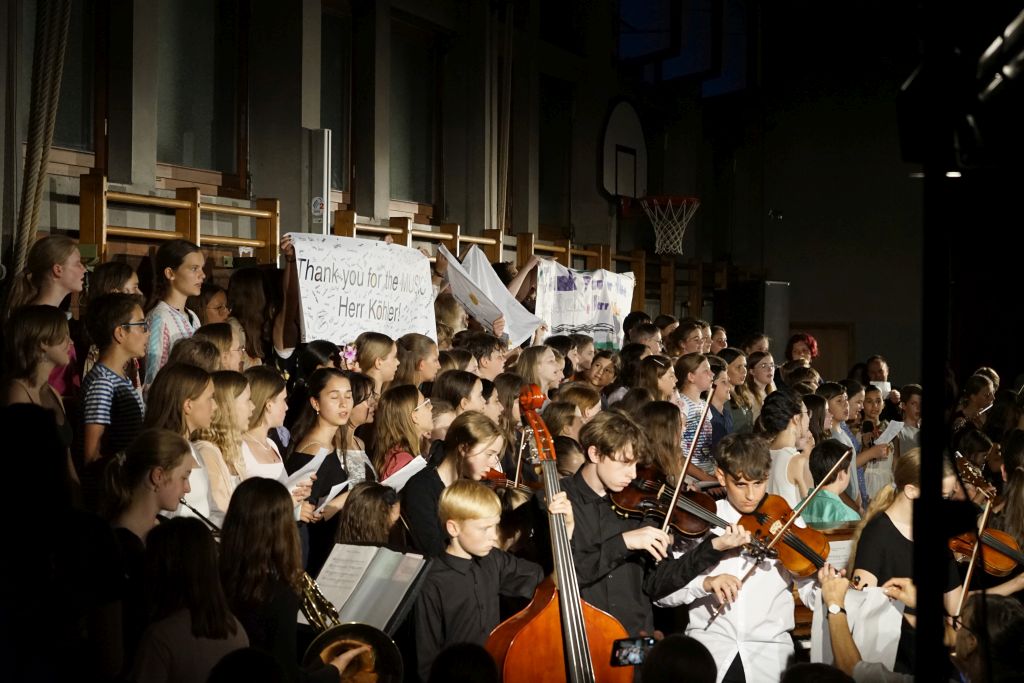 Bereits seit vielen Jahren ist das Wandelkonzert am E.T.A.-Hoffmann-Gymnasium in der vorletzten Woche des Schuljahres Tradition. Wieder einmal hatte die Fachschaft Musik ein fulminantes Mammut-Programm aus den zahlreichen und vielfältigen Beiträgen, die die Instrumentallehrkräfte sowie Leiter und Leiterinnen von Chören, Orchestern und Ensembles in Zusammenarbeit mit den Schülern und Schülerinnen erarbeitet haben, auf die Beine gestellt. Zwischen 20minütigen Blocks konnten die Besucher und Besucherinnen von Raum zu Raum lustwandeln, um die musikalischen Kostbarkeiten, exzellent von spielfreudigen Schülern und Schülerinnen aller Altersgruppen musiziert, zu erleben. Den Auftakt bildete bei schönem Wetter Klaus Wangorsch mit seinem „Wangorchester“ im Schulhof mit Hits aus Film-und Popmusik, bevor Musizierende und Gäste sich auf den Weg zu den einzelnen Spielstätten (Untere Turnhalle, beide Musiksäle, Mensa und Kapelle) machten. Die vollbesetzten Räume zeigten das große Interesse der Zuhörerschaft an den musikalischen Darbietungen, die von Kompositionen für Streicher über Holzbläser, Blechbläser, Gitarren, Percussion bis hin zu Klavier reichten, sowohl solistisch als auch im Ensemble gekonnt interpretiert. Auch Gesang erfreute das Publikum, sei es als Solo- oder Chorlied, mitreißend vorgetragen. Eine Kostprobe ihrer Virtuosität boten Bundespreisträger Jugend Musiziert. Am Ende des Abends ehrten die Chöre der Unter-und Mittelstufe, Orchester und Wangorchester und Kolleginnen und Kollegen unter der Leitung von Elisabeth Pagan Norbert Köhler, der sich nach 30 Jahren unermüdlichen Wirkens in den wohlverdienten Ruhestand verabschiedet, mit dem leidenschaftlich gesungenen ABBA-Song „Thank you for the music“. Darauf folgte tosender Applaus. Norbert Köhler bedankte sich sichtlich bewegt für das „beste Geschenk“, das man ihm habe machen können.