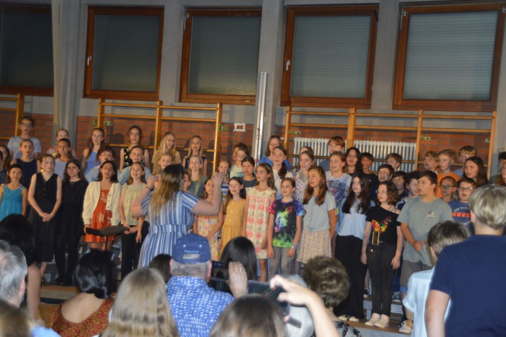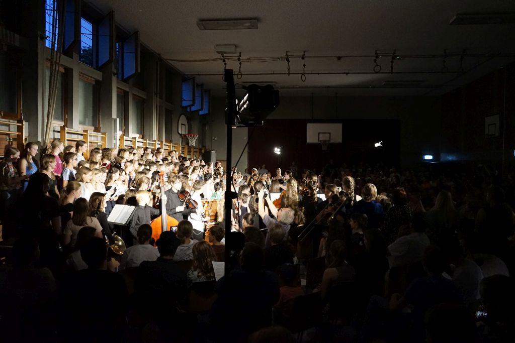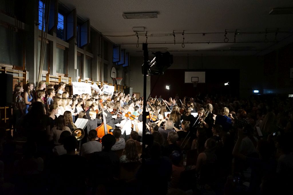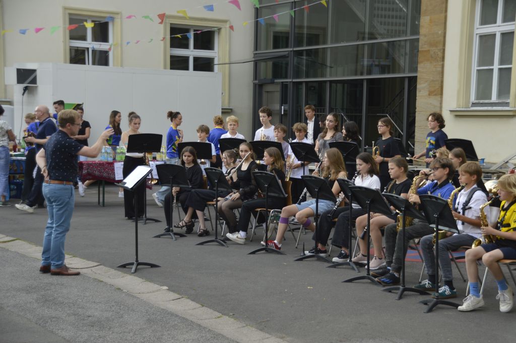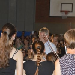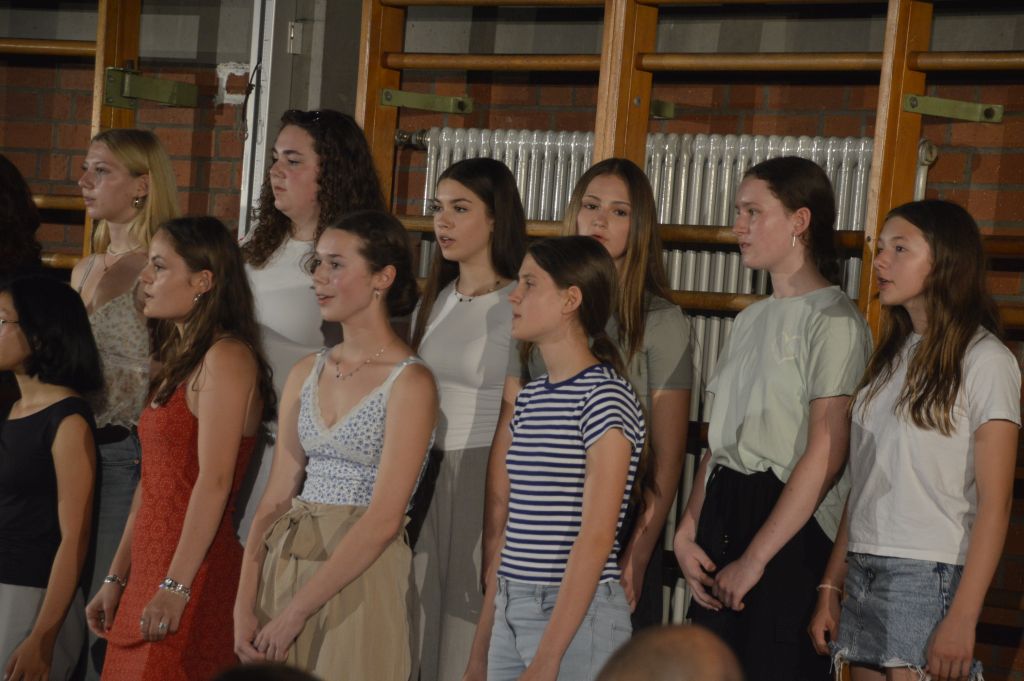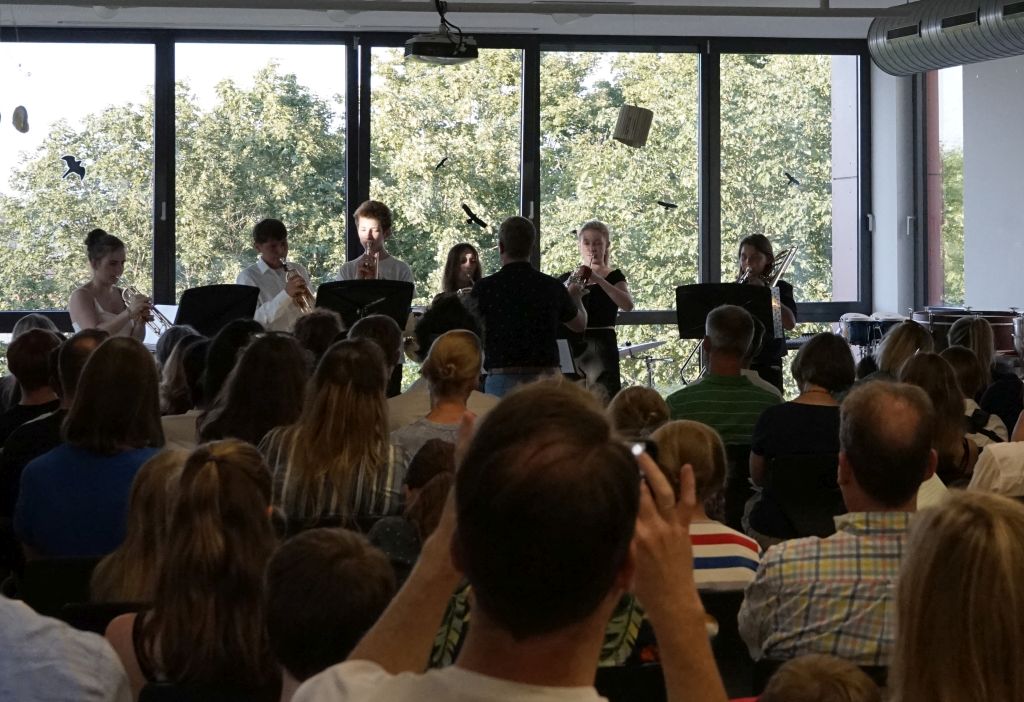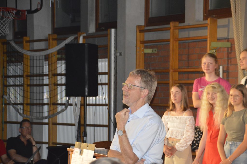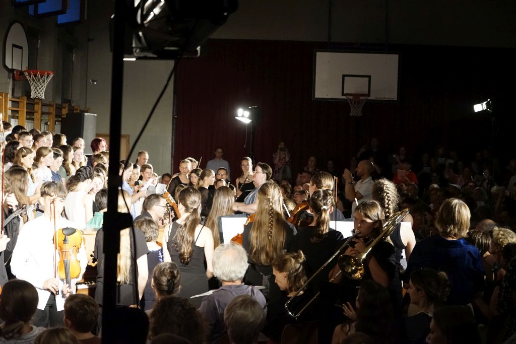Bereits seit vielen Jahren ist das Wandelkonzert am E.T.A.-Hoffmann-Gymnasium in der vorletzten Woche des Schuljahres Tradition. Wieder einmal hatte die Fachschaft Musik ein fulminantes Mammut-Programm aus den zahlreichen und vielfältigen Beiträgen, die die Instrumentallehrkräfte sowie Leiter und Leiterinnen von Chören, Orchestern und Ensembles in Zusammenarbeit mit den Schülern und Schülerinnen erarbeitet haben, auf die Beine gestellt. Zwischen 20minütigen Blocks konnten die Besucher und Besucherinnen von Raum zu Raum lustwandeln, um die musikalischen Kostbarkeiten, exzellent von spielfreudigen Schülern und Schülerinnen aller Altersgruppen musiziert, zu erleben. Den Auftakt bildete bei schönem Wetter Klaus Wangorsch mit seinem „Wangorchester“ im Schulhof mit Hits aus Film-und Popmusik, bevor Musizierende und Gäste sich auf den Weg zu den einzelnen Spielstätten (Untere Turnhalle, beide Musiksäle, Mensa und Kapelle) machten. Die vollbesetzten Räume zeigten das große Interesse der Zuhörerschaft an den musikalischen Darbietungen, die von Kompositionen für Streicher über Holzbläser, Blechbläser, Gitarren, Percussion bis hin zu Klavier reichten, sowohl solistisch als auch im Ensemble gekonnt interpretiert. Auch Gesang erfreute das Publikum, sei es als Solo- oder Chorlied, mitreißend vorgetragen. Eine Kostprobe ihrer Virtuosität boten Bundespreisträger Jugend Musiziert. Am Ende des Abends ehrten die Chöre der Unter-und Mittelstufe, Orchester und Wangorchester und Kolleginnen und Kollegen unter der Leitung von Elisabeth Pagan Norbert Köhler, der sich nach 30 Jahren unermüdlichen Wirkens in den wohlverdienten Ruhestand verabschiedet, mit dem leidenschaftlich gesungenen ABBA-Song „Thank you for the music“. Darauf folgte tosender Applaus. Norbert Köhler bedankte sich sichtlich bewegt für das „beste Geschenk“, das man ihm habe machen können.