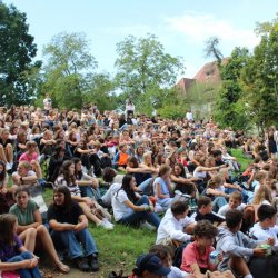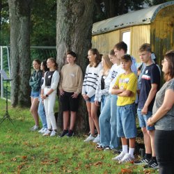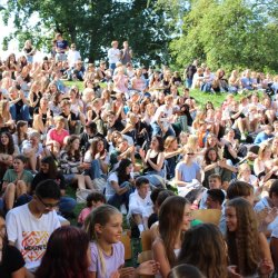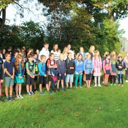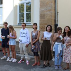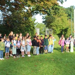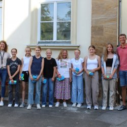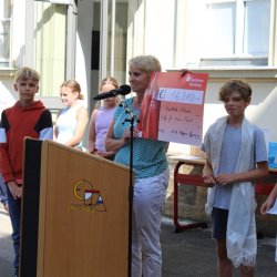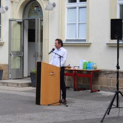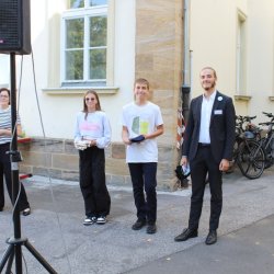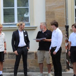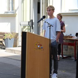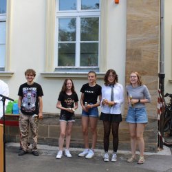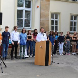Später ging es dann noch einmal nach draußen, diesmal aber für alle Alteingesessenen. Der letzte Schultag des vergangenen Schuljahres war so regnerisch und kalt gewesen, dass die traditionellen Ehrungen im Schulhof nicht stattfinden konnten. Diese wurden nun bei bestem Wetter nachgeholt. Neben den Tutor/innen, den Sanitäter/innen, den Schülerlots/innen und den Technikern wurden auch herausragende schulische, sportliche und musikalische Leistungen geehrt. Besondere Erfolge beim "Stadtradeln" kamen ebenso zur Sprache wie die Teilnahme an Begabtenkursen oder der Schülerzeitung. Am Ende wurden die fleißigsten Teilnehmer/innen am Nepallauf vorgestellt und schließlich das herausragende Ergebnis der Nepal-Sammelaktion durch den Lauf verkündet. Alle Geehrten wurden mit lautem Applaus der Schulfamilie bedacht.