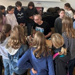 „Wisst ihr, wer Luzifer ist?“, fragte Jochen Till und erhielt postwendend die korrekte Antwort. „Und wer ist dann Luzifer Junior?“, wollte er von unseren Schülerinnen und Schülern der 5. und 6. Jahrgangsstufe wissen, die an der äußerst amüsanten Lesung teilnehmen durften. Dass es sich dabei um den Sohn des Teufels handelt, der mit seinem Papa immer wieder aneinander gerät, weil er zu „lieb“ ist, war schnell herausgefunden. Aber so super mächtig wie gedacht, ist der Teufel dann doch nicht. Überraschender Weise hat dieser nämlich Angst vor dem CEO des Himmels, der alles sieht und hört und offensichtlich keine Heavy-Metal-Musik mag. Weil Luzifer Junior aber die Insassen des Heavy-Metal-Traktes in der Hölle mit Metallica, statt wie vom CEO verordnet mit Volksmusik, beschallt, wird er zur Strafe vom Teufel in einen Fußball verwandelt und entsprechend durch die Gänge geschossen. Lustig wurde es, als Jochen Till den Sympathieträger Cornibus, einen kleinen Dämon, den Teilnehmern vorstellte, der statt „Teammeeting“ von „Teamvermittlung“ sprach und bei „Luzi“ für viel Verwirrung sorgte. Mit verstellen Stimmen und szenischen Darbietungen wurde das Vorlesen zum absoluten Ohrenschmaus. Darüber hinaus performte Jochen Till, der eigentlich einmal Rockstar werden wollte, zum „Luzifer-Song“ und schmetterte ordentlich auf der Luft-Gitarre, obwohl er in Wirklichkeit ein Schlagzeuger ist.
