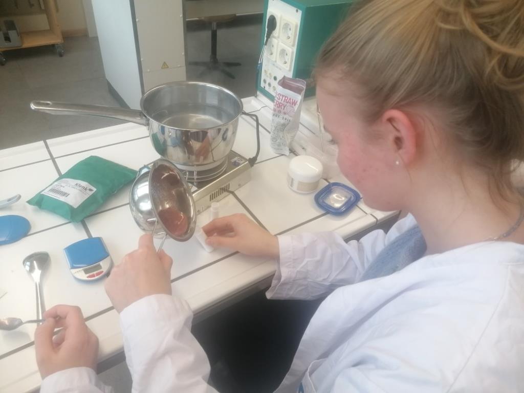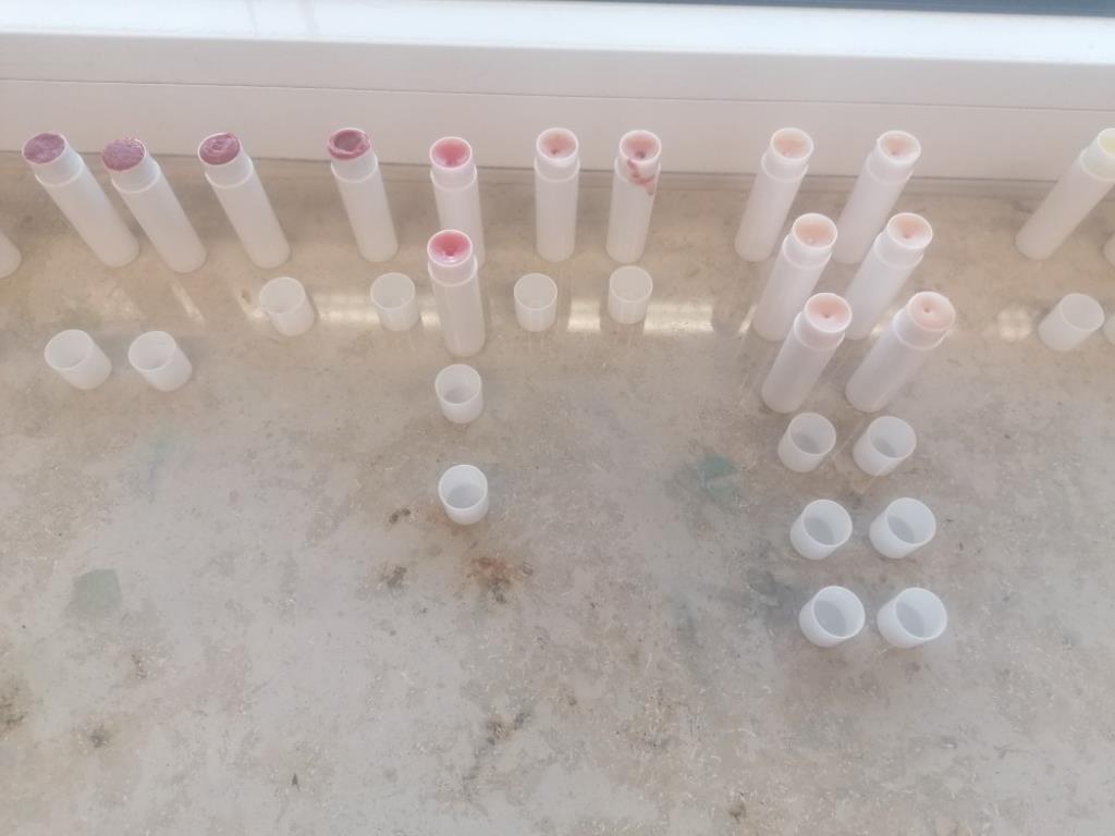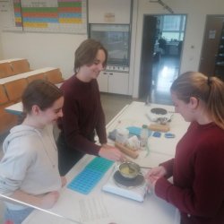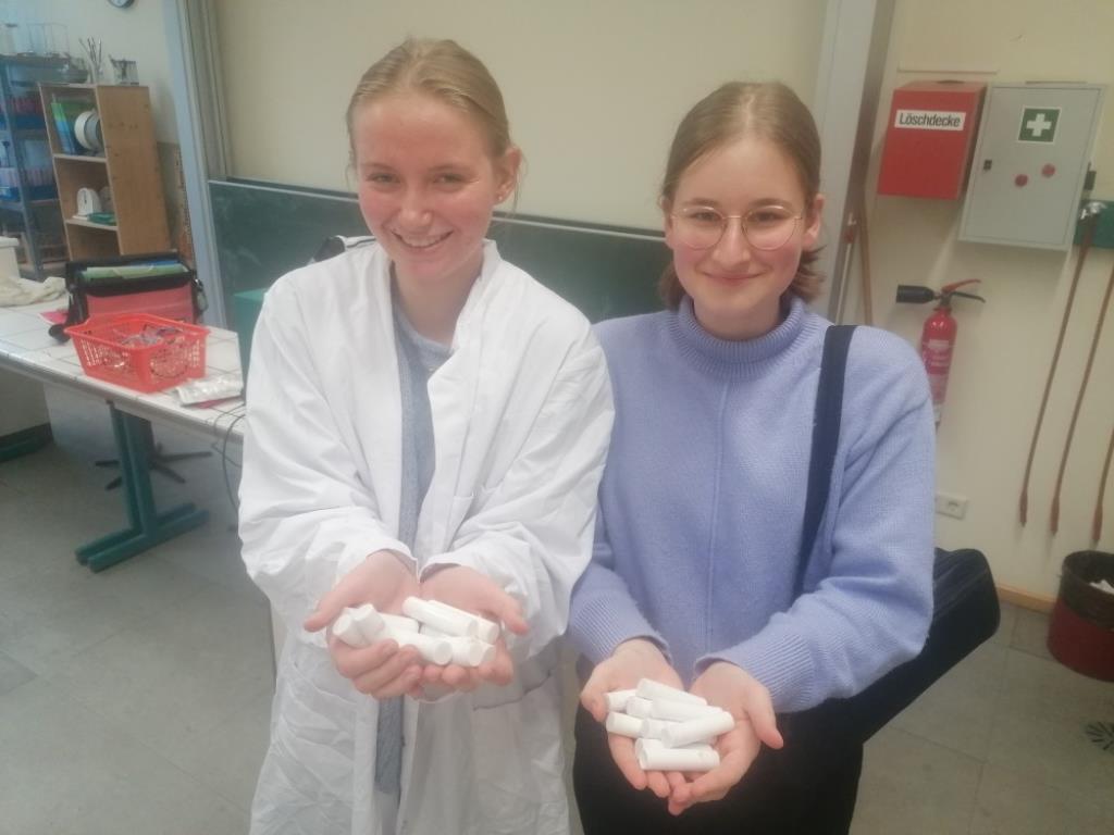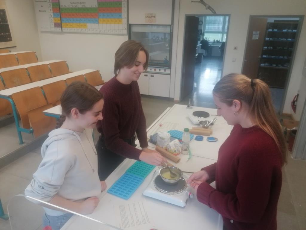 Von Schoko-Crossies bis zum Lippenstift (beides in verschiedenen Farbvarianten): Die Schülerinnen und Schüler des Wahlkurses Chemie zeigen sich kreativ. Ganz wichtig dabei: Glitzer!