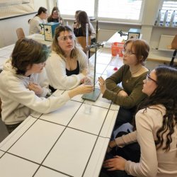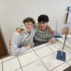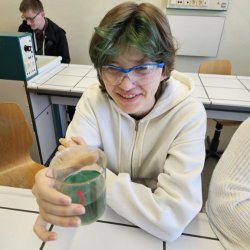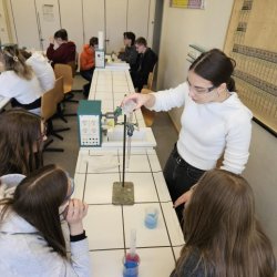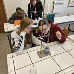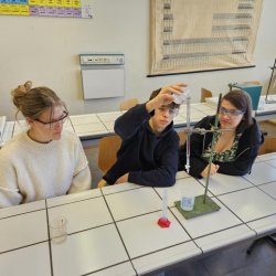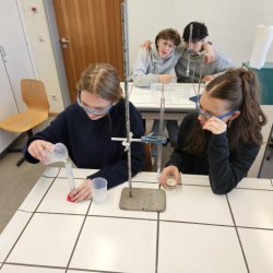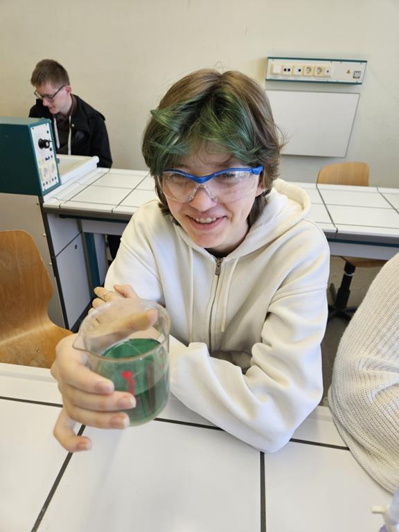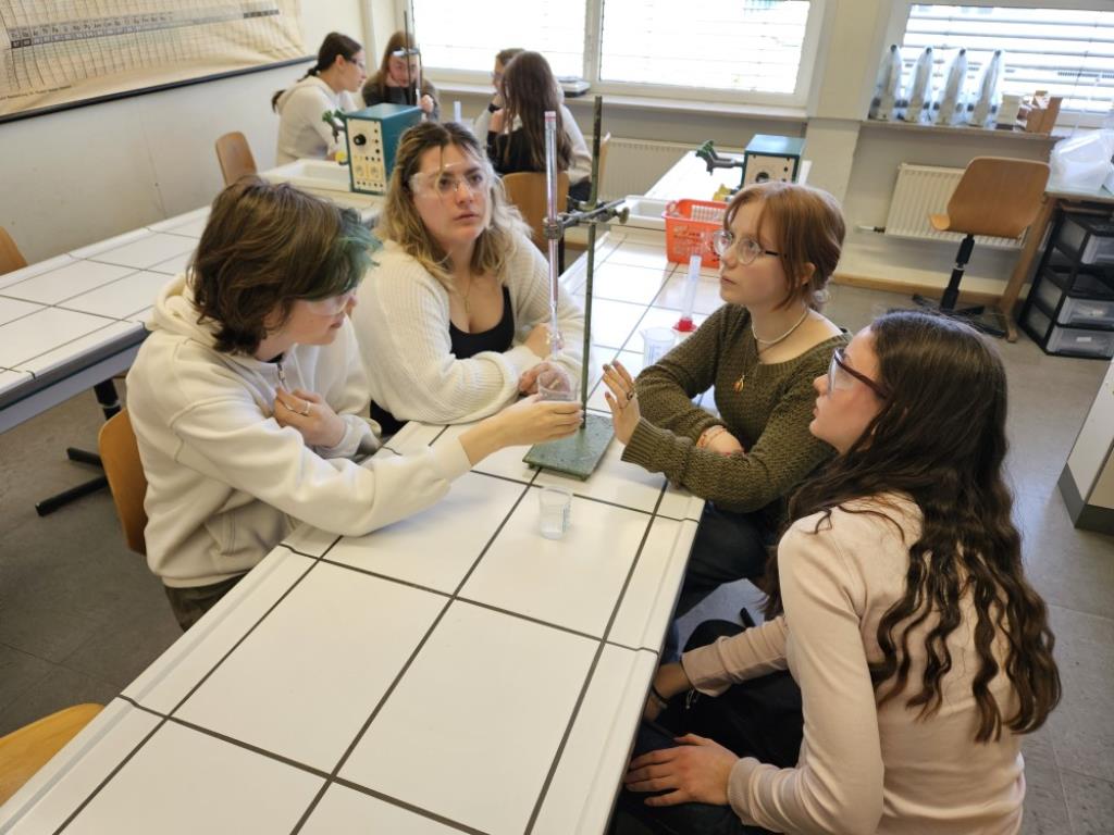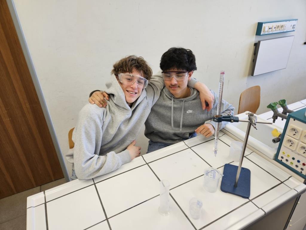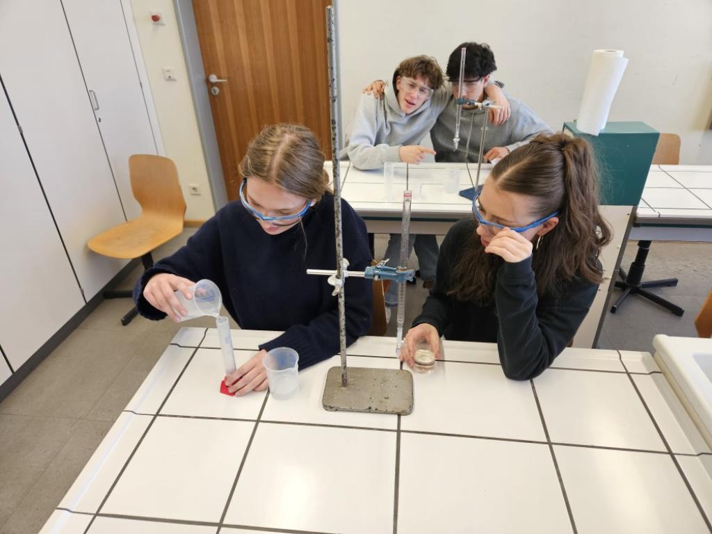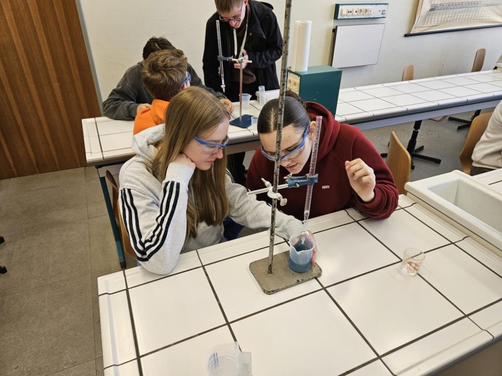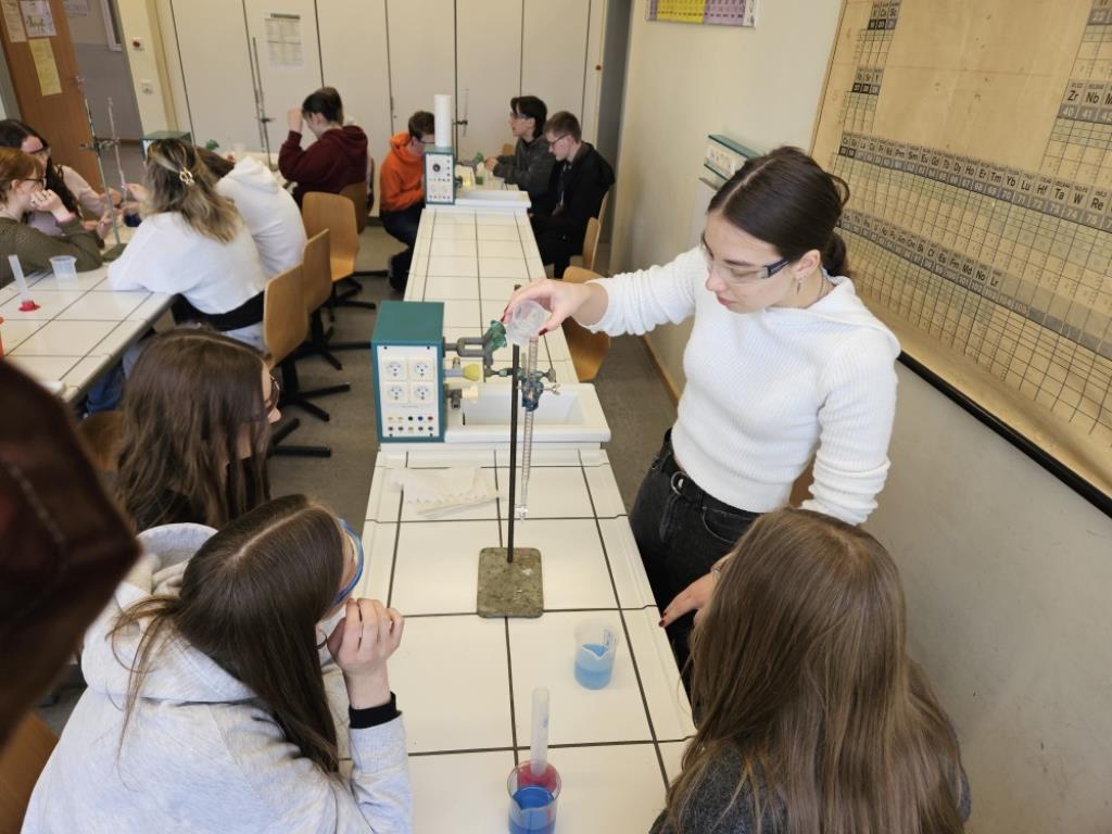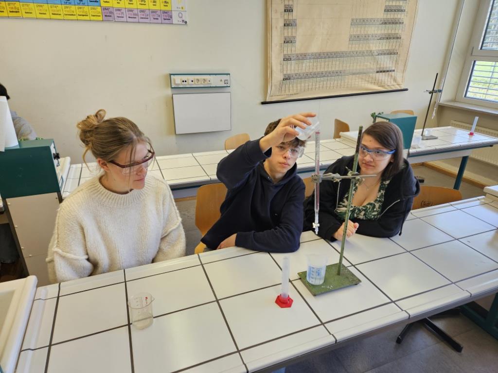 Von der Theorie zur Praxis: Die Klasse 10a lernt, mit entsprechender Apparatur und passenden Chemikalien den Gehalt einer basischen Lösung zu bestimmen.