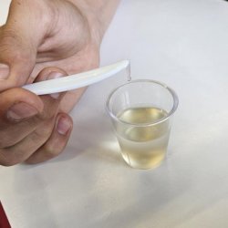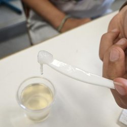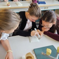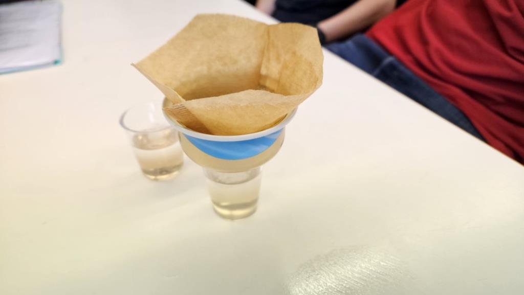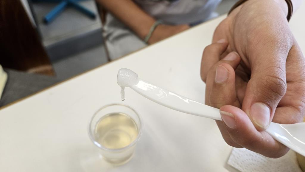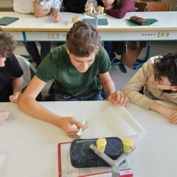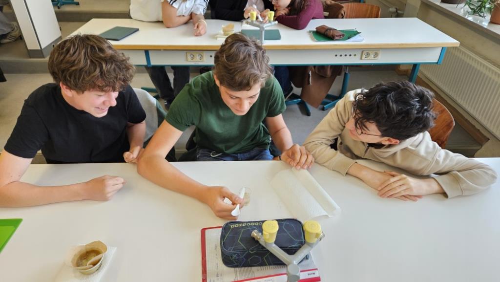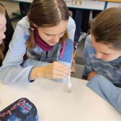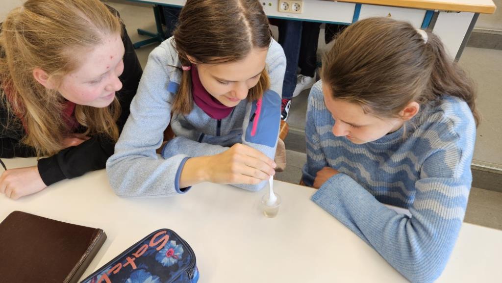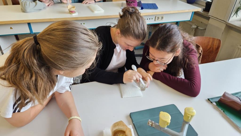Von der Theorie zur Praxis: Die Klasse 9d extrahiert mit einefachen Haushalts-Chemikalien die DNA aus einer Banane.