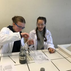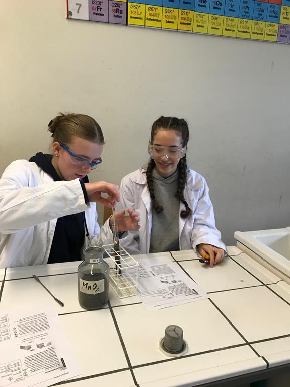 Beim Praktikum in der Klasse 9b konnten Wasserstoff, CO2 und Sauerstoff nachgewiesen werden. Besonders die Glimmspanprobe, der Nachweis von Sauerstoff hatte es der Klasse angetan. Bei der Reaktion von Mangandioxid und Wasserstoffperoxid gab es tolle Ergebnisse und eine Ahnung, warum wir als ChemikerInnen und Chemiker den Werbespruch auch auf unsere Weise verstehen bzw. deuten können. Tsc