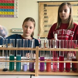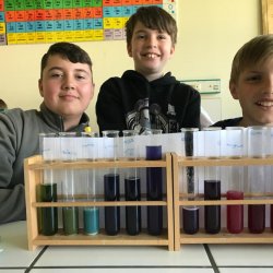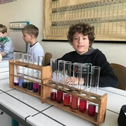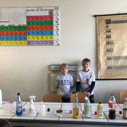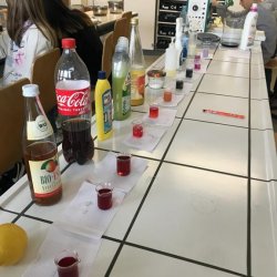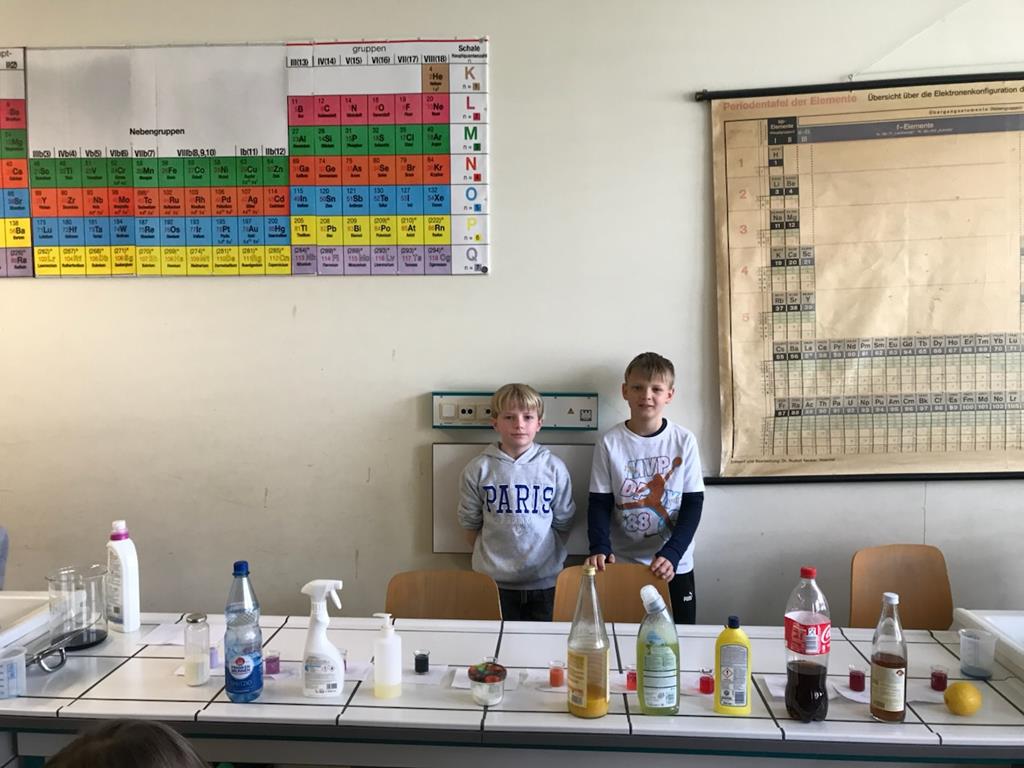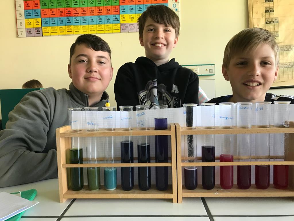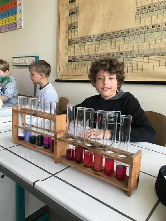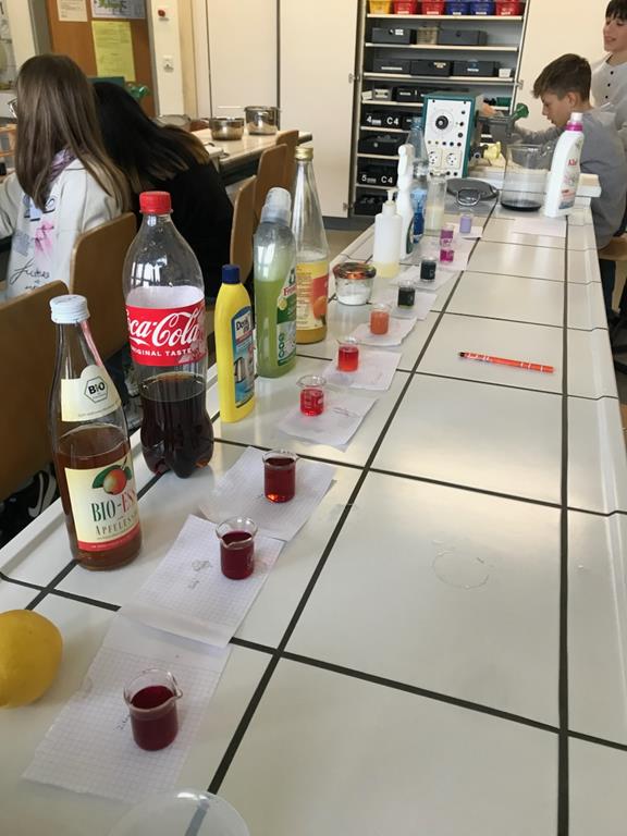 In der Klasse 5d wurden diverse Haushaltsmittel auf ihren Säuregehalt überprüft mit Hilfe des natürlichen Indikators Blaukraut. Dabei entstanden tolle Farbverlaufreihen von basisch zu sauer. Denn die Anthocyane (die Farbstoffe im Blaukraut) ändern ihre Farbe, je nachdem ob sie mit sauren (Zitronensaft, Essig, Limonade) oder seifigen (Backpulver, Natron, Reinigungsmittel) Flüssigkeiten gemischt werden. Am Ende klärte sich dabei dann auch die Frage, warum man in Norddeutschland Rotkohl sagt!