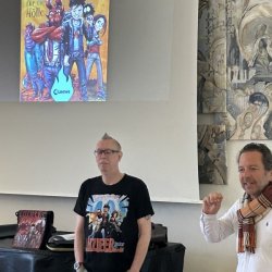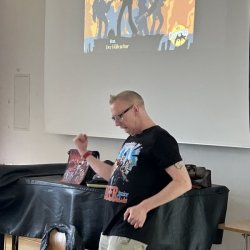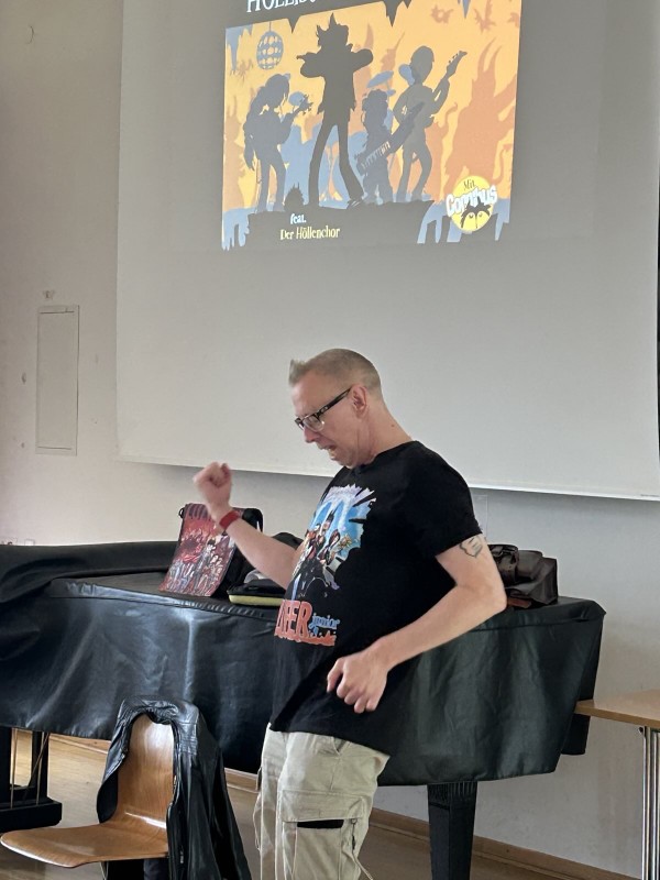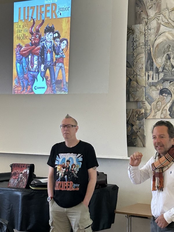 „Wisst ihr, wer Luzifer ist?“, fragte Jochen Till und erhielt postwendend die korrekte Antwort. „Und wer ist dann Luzifer Junior?“, wollte er von unseren Schülerinnen und Schülern der 5. und 6. Jahrgangsstufe wissen, die an der äußerst amüsanten Lesung teilnehmen durften. Dass es sich dabei um den Sohn des Teufels handelt, der mit seinem Papa immer wieder aneinander gerät, weil er zu „lieb“ ist, war schnell herausgefunden. Aber so super mächtig wie gedacht, ist der Teufel dann doch nicht. Überraschender Weise hat dieser nämlich Angst vor dem CEO des Himmels, der alles sieht und hört und offensichtlich keine Heavy-Metal-Musik mag. Weil Luzifer Junior aber die Insassen des Heavy-Metal-Traktes in der Hölle mit Metallica, statt wie vom CEO verordnet mit Volksmusik, beschallt, wird er zur Strafe vom Teufel in einen Fußball verwandelt und entsprechend durch die Gänge geschossen. Lustig wurde es, als Jochen Till den Sympathieträger Cornibus, einen kleinen Dämon, den Teilnehmern vorstellte, der statt „Teammeeting“ von „Teamvermittlung“ sprach und bei „Luzi“ für viel Verwirrung sorgte. Mit verstellen Stimmen und szenischen Darbietungen wurde das Vorlesen zum absoluten Ohrenschmaus. Darüber hinaus performte Jochen Till, der eigentlich einmal Rockstar werden wollte, zum „Luzifer-Song“ und schmetterte ordentlich auf der Luft-Gitarre, obwohl er in Wirklichkeit ein Schlagzeuger ist.
