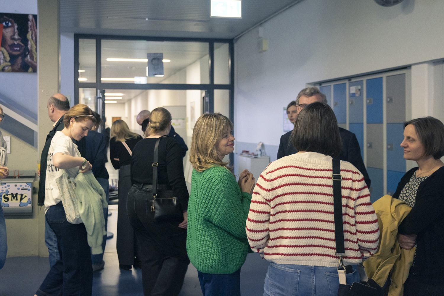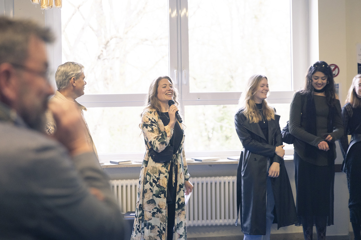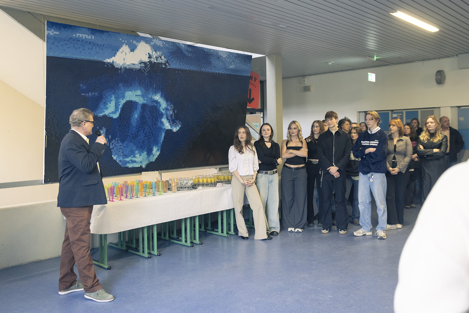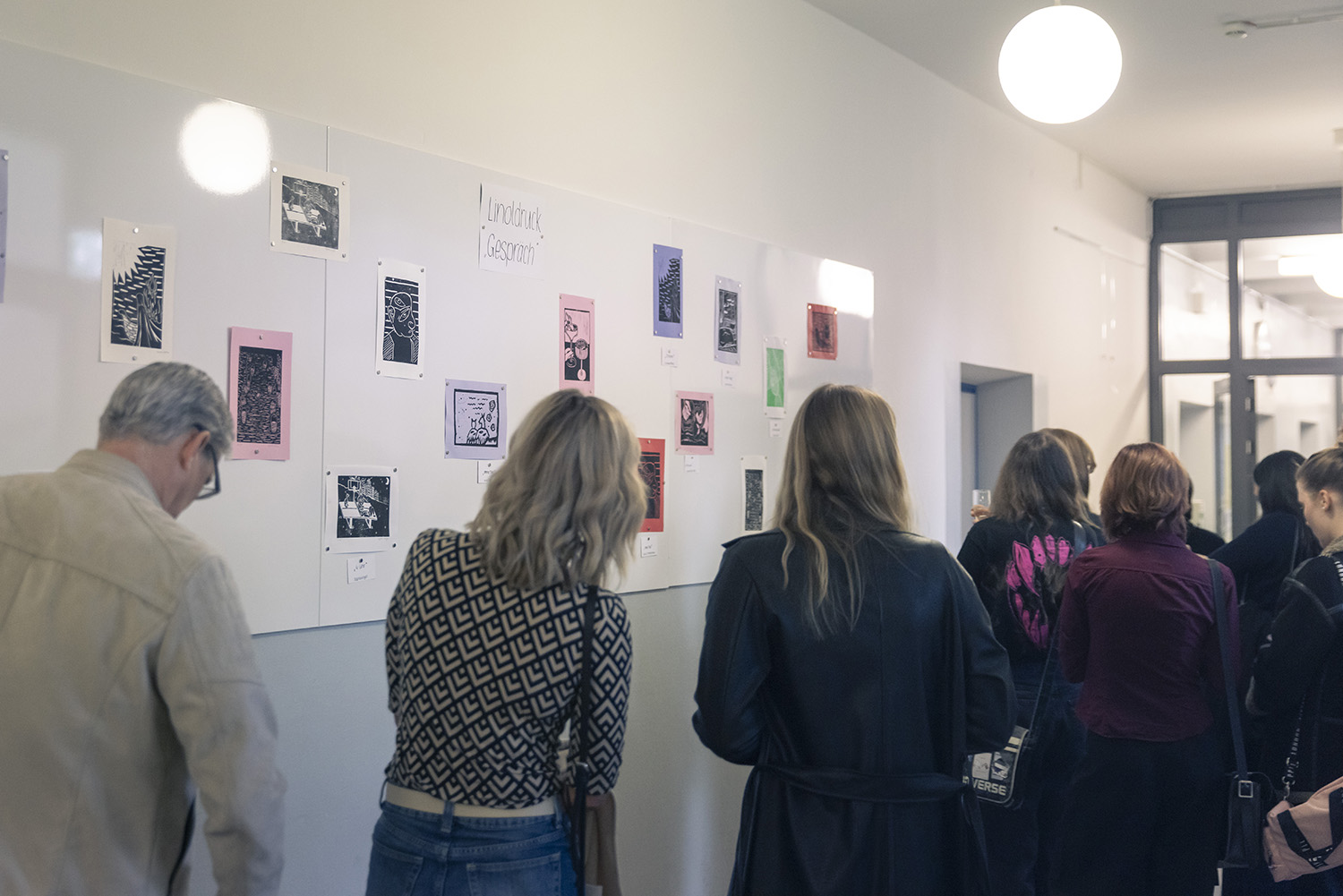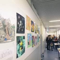 Der Schulleiter Markus Knebel, der Vorstand des Freundeskreises Michael Grimm, der Schülersprecher und Mitausstellende Anton Spörl sowie die Kunstlehrerin des ausstellenden Kurses Miriam Böttcher eröffneten mit kurzen Reden den vielbesuchten Ausstellungsabend, der mit einem Gläschen Sekt dann offiziell beginnen konnte.