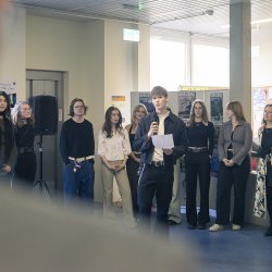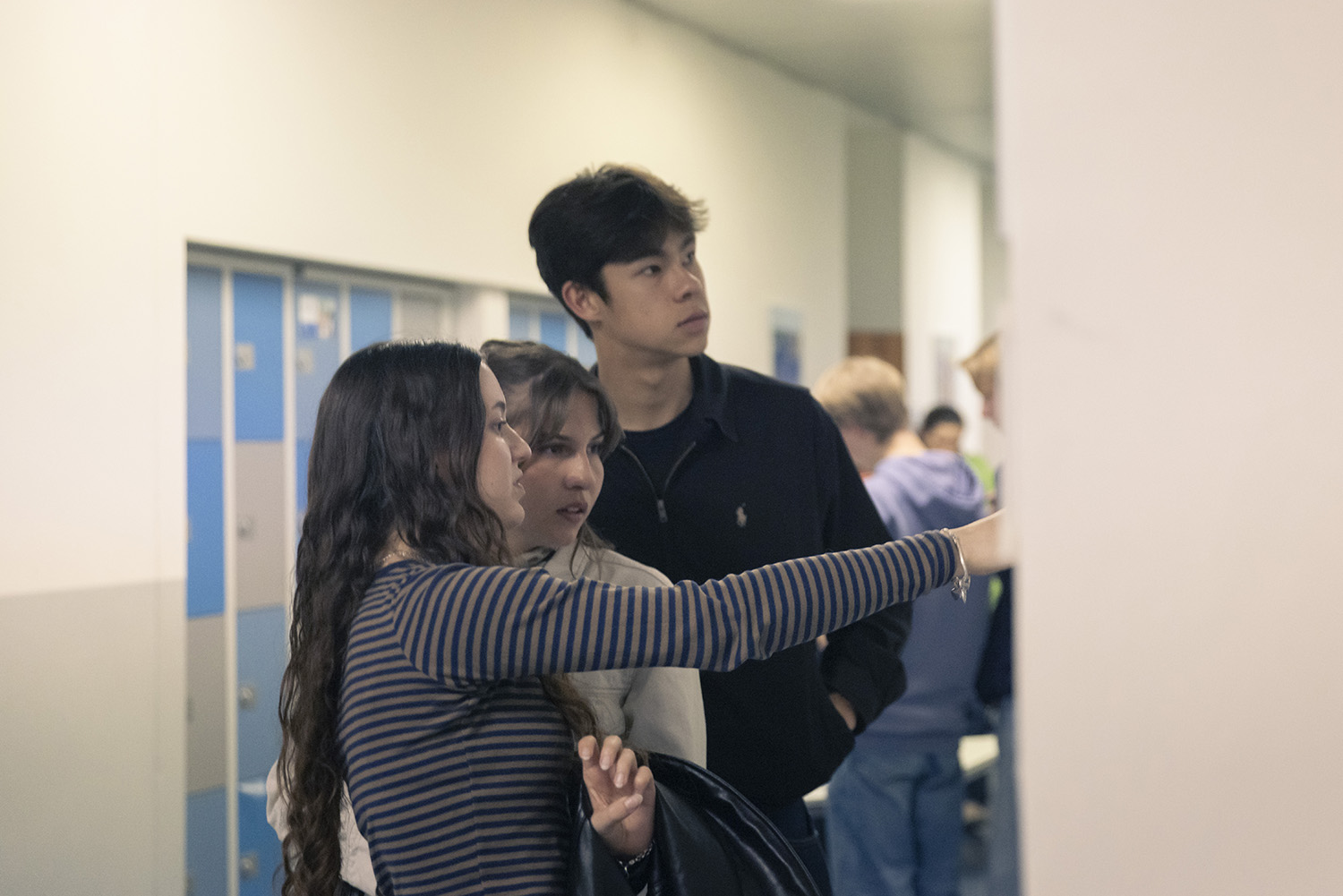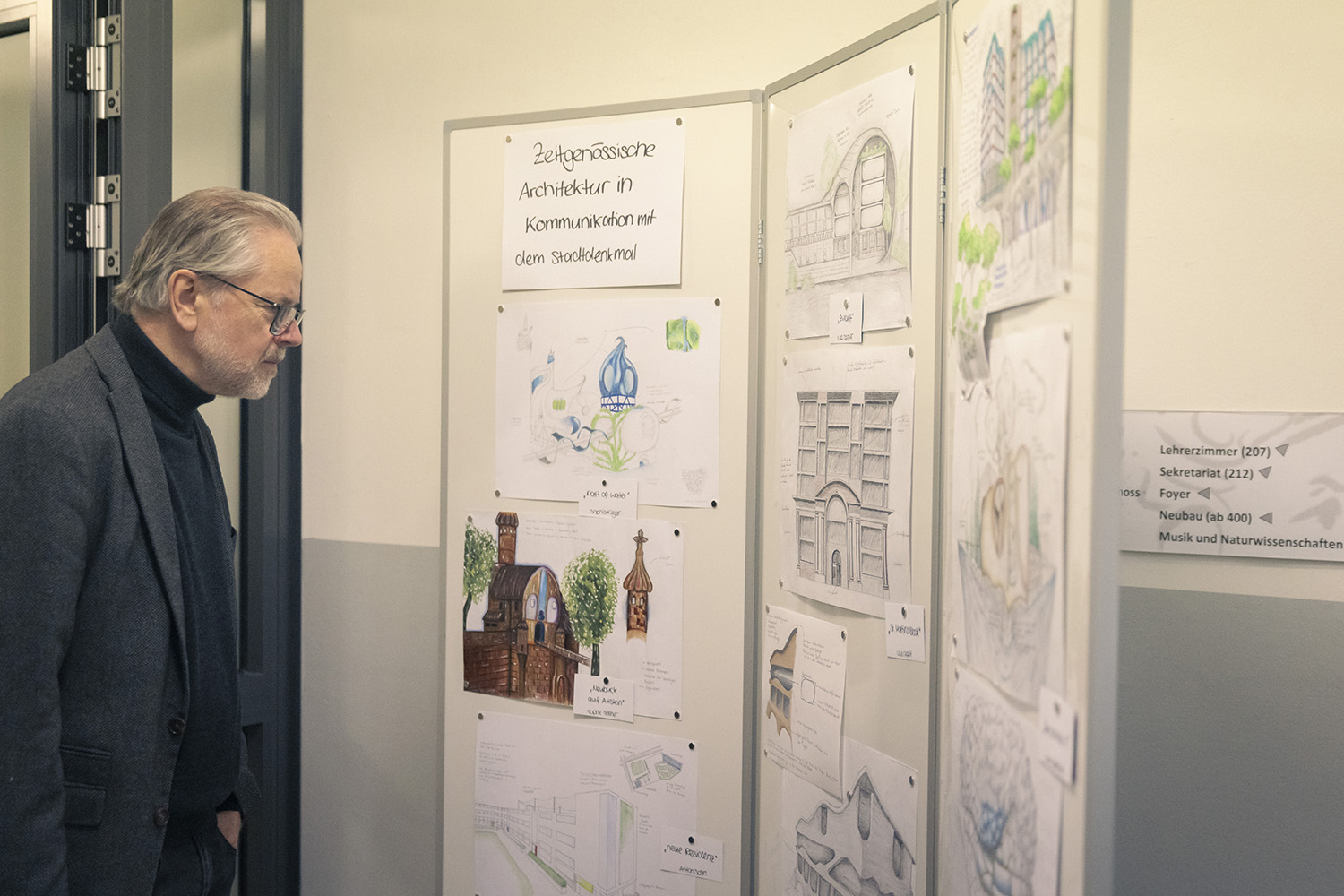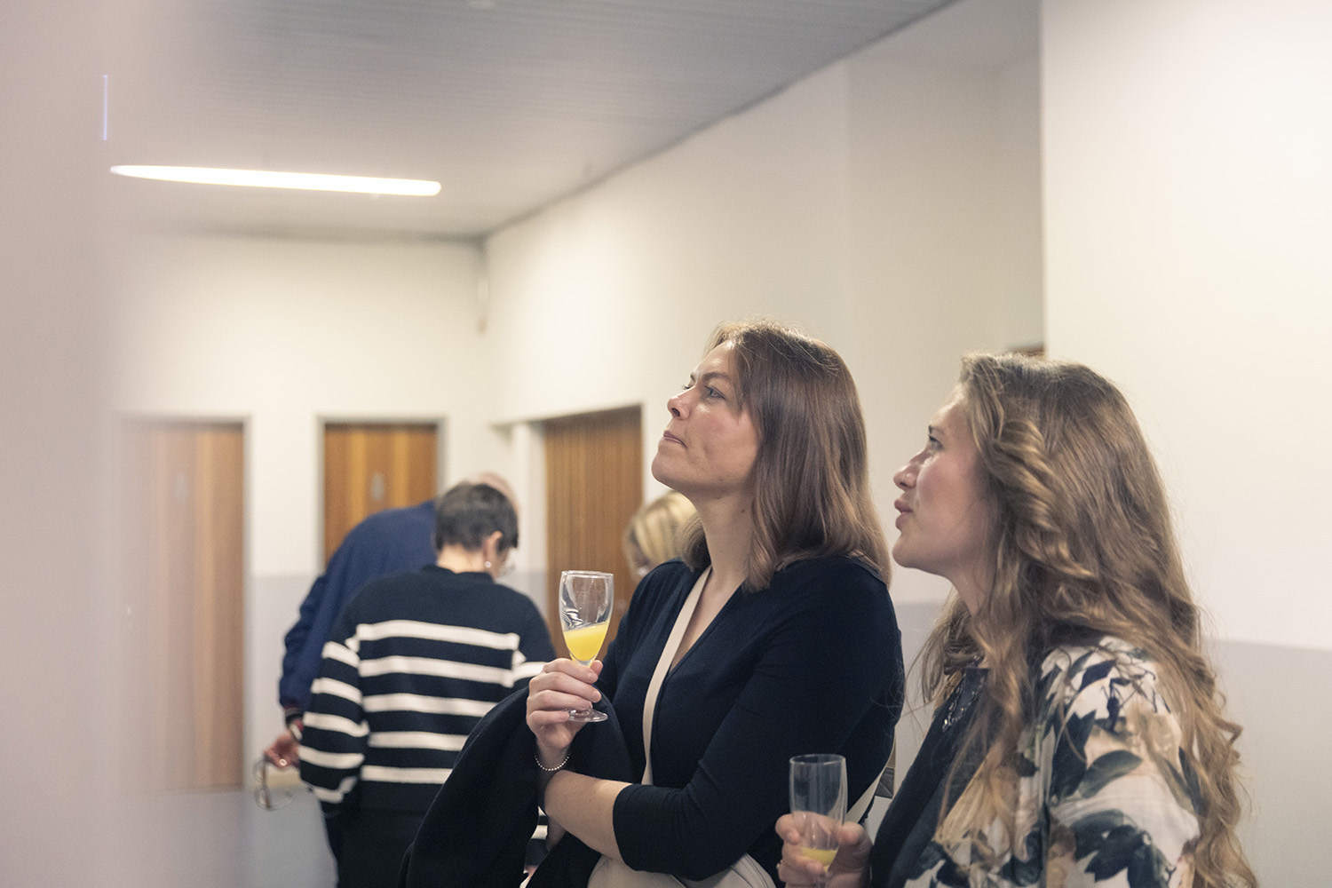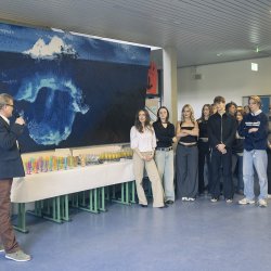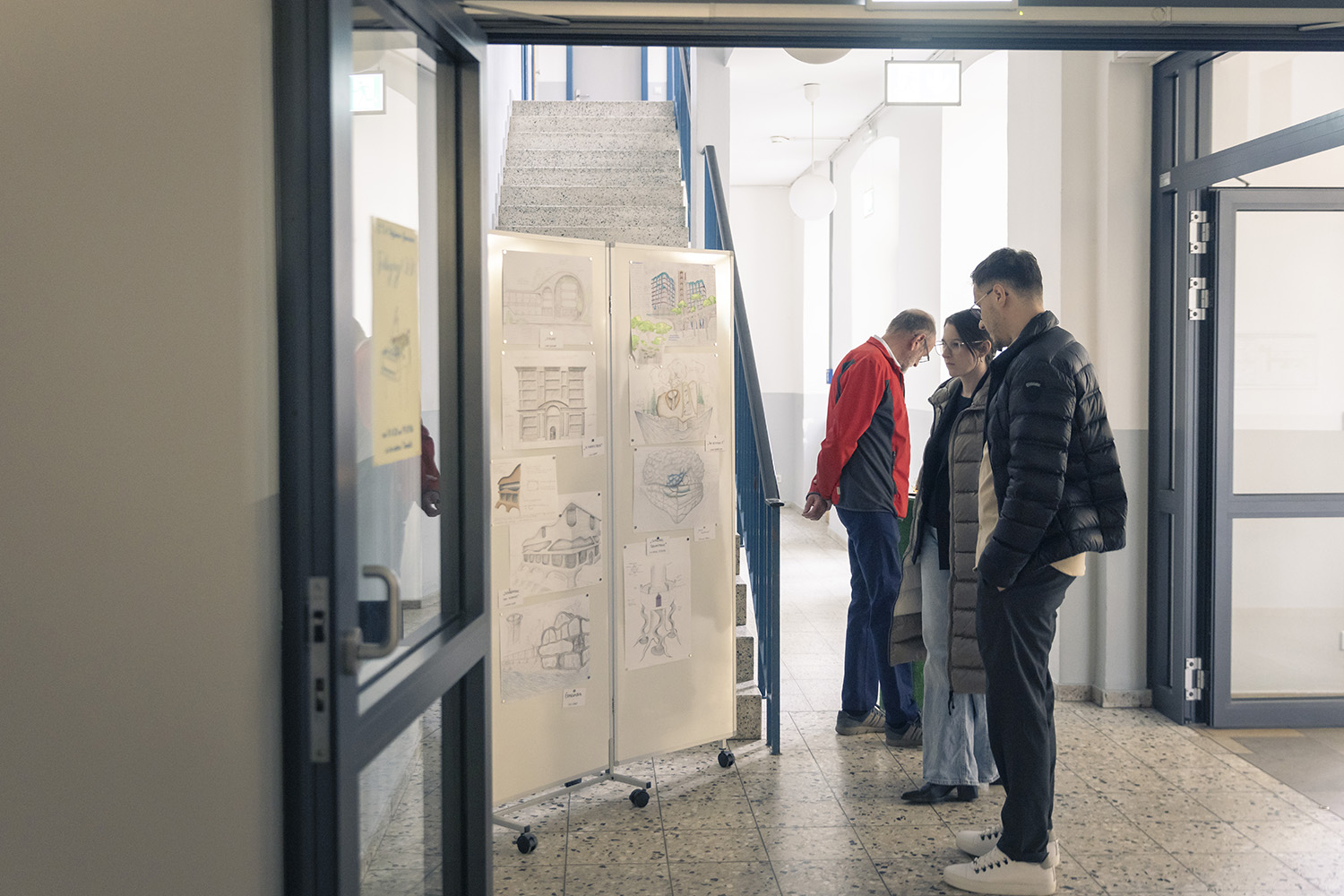 Der Schulleiter Markus Knebel, der Vorstand des Freundeskreises Michael Grimm, der Schülersprecher und Mitausstellende Anton Spörl sowie die Kunstlehrerin des ausstellenden Kurses Miriam Böttcher eröffneten mit kurzen Reden den vielbesuchten Ausstellungsabend, der mit einem Gläschen Sekt dann offiziell beginnen konnte.