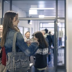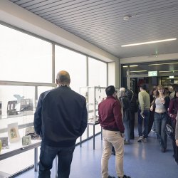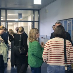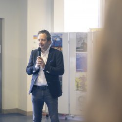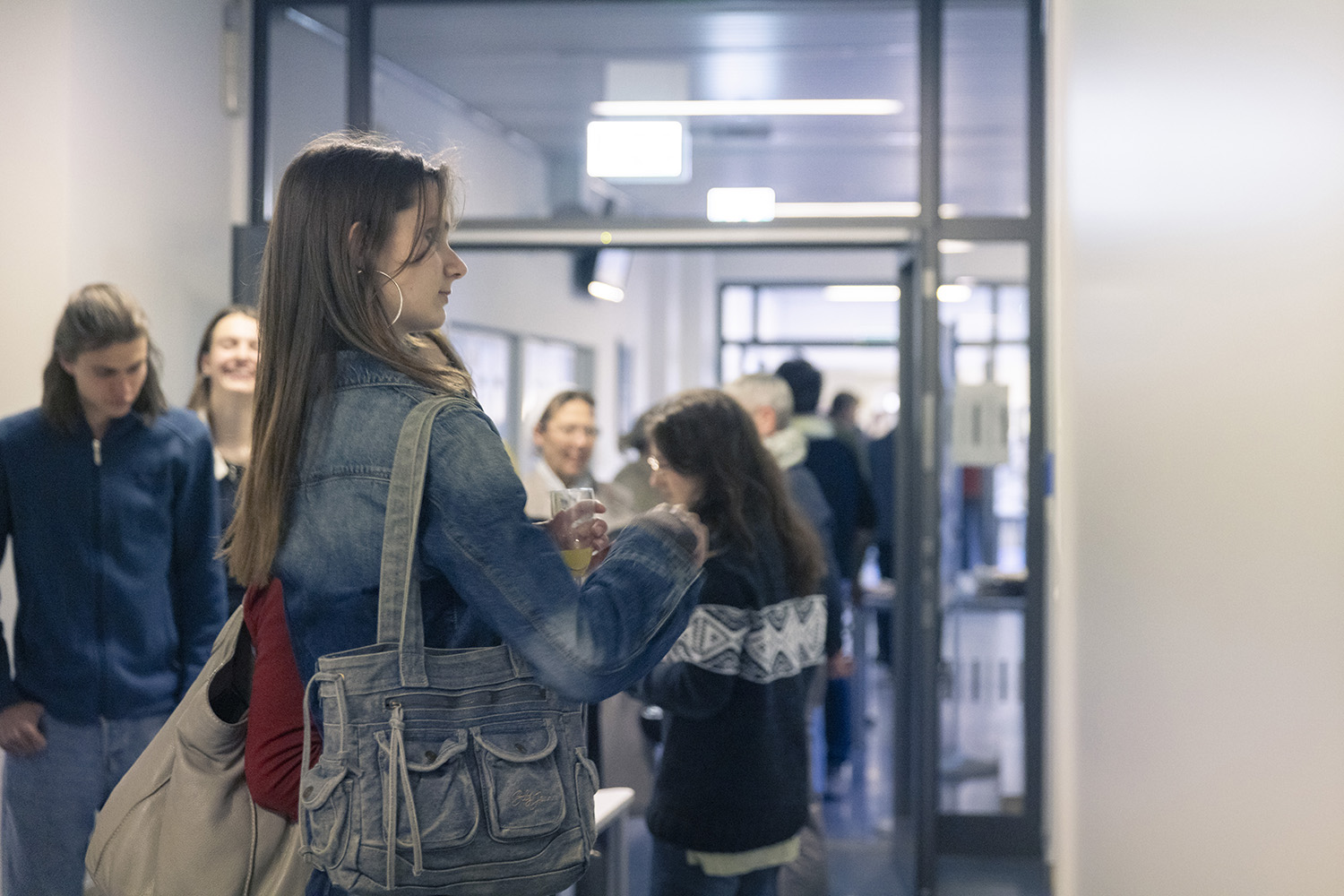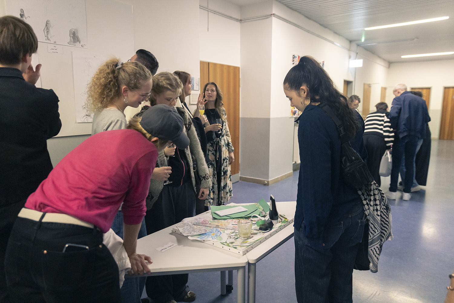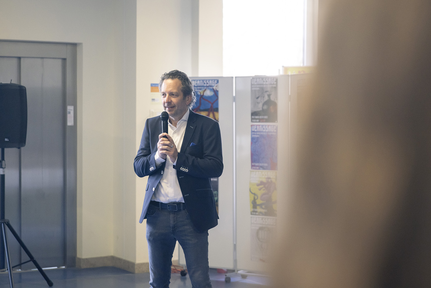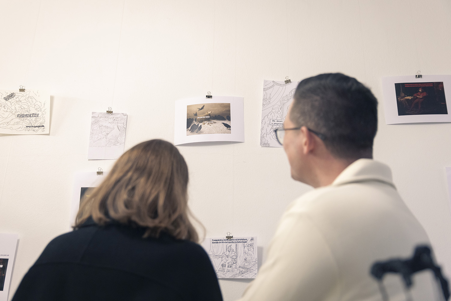 Der Schulleiter Markus Knebel, der Vorstand des Freundeskreises Michael Grimm, der Schülersprecher und Mitausstellende Anton Spörl sowie die Kunstlehrerin des ausstellenden Kurses Miriam Böttcher eröffneten mit kurzen Reden den vielbesuchten Ausstellungsabend, der mit einem Gläschen Sekt dann offiziell beginnen konnte.