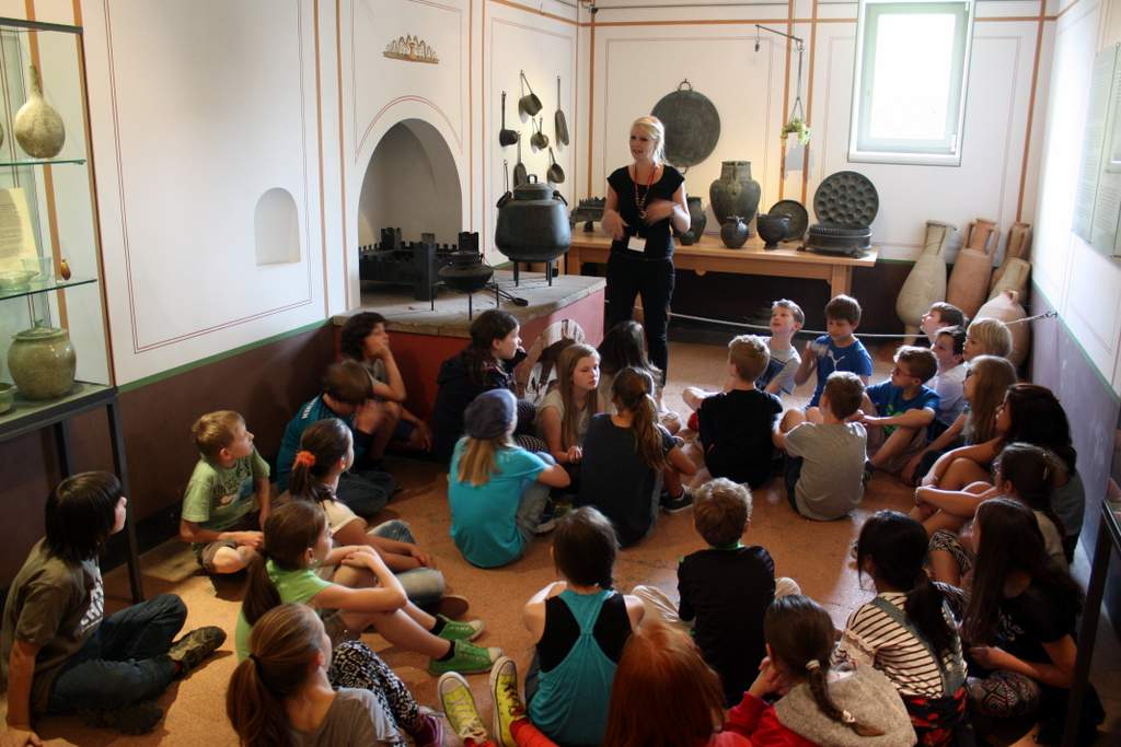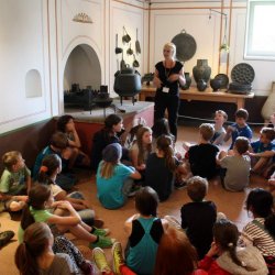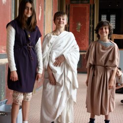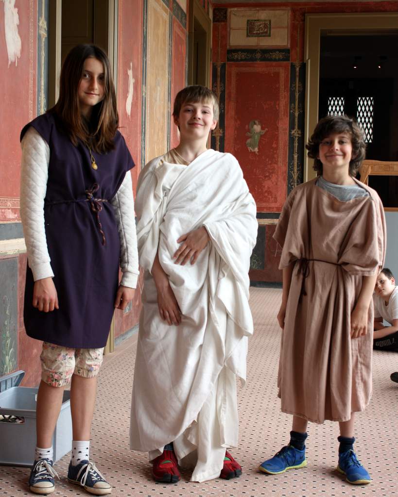 In einer lebendigen Führung durch das Pompejanum wurde den Schülern der Alltag einer römischen Familie näher gebracht. Dabei wurde über die Küchengeheimnisse der Antike geplaudert – sogar am sagenumwobenen garum durfte geschnuppert werden. Als Höhepunkt durften sich dann Schüler eine richtige Toga anlegen lassen, wobei natürlich Sklaven behilflich waren.