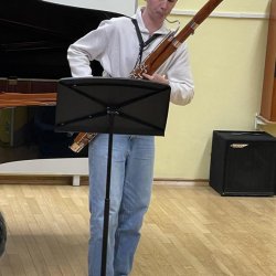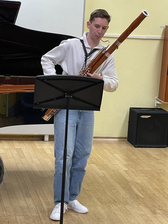 Alexander Martens, Fagott, und Lea Hugel, Klavier, sind ebenfalls ein prämiertes und erprobtes Duo, welches dem gespannten Publikum noch einmal alles darbot, was auf beiden Instrumenten in der Kunst klassischer und moderner Techniken möglich ist. In H. Dutilleux „Sarabande et cortège“ und G. Schrecks „Sonate“op.9 vereinte Alexander alle Vorzüge, die ein schon sehr gut ausgebildeter Fagottist zeigen kann: große warme Tonbilder in allen Lagen, schnelle Doppelzunge und ein überaus variables Vibrato! Lea bestach durch kraftvolles und elegantes Klavierspiel und führte mit großer Souveränität und Leichtigkeit durch die Passagen und Sätze zu einem wunderbaren Gesamtklang auf Augenhöhe! Immer wieder kommunizierten beide direkt und indirekt miteinander, so dass sie die Höchstschwierigkeiten in staunende Leichtigkeit verwandelten! “Fandango“ von A. Kennedy ist hier noch einmal beispielhaft, denn das Werk sieht präpariertes Klavier und neue Spieltechniken für das Fagott vor. Dabei erklangen mit variabel abgedeckten Saiten verfremdete Klavierklänge, gepaart mit dem Wechsel des Fagottisten als versierter Interpret äußerst schwieriger neuer Spielformen als händischer Rhythmusgeber auf den tiefen Saiten des Flügels.