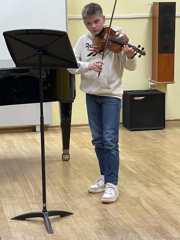 Felix Müller, Violine, stellte im Anschluss mit seiner externen Klavierbegleiterin, Frau Linz, sein Programm vor: „Sonate F-Dur“ von G. F. Händel und „Home sweet home“ von H. Farmer. Zwei wirklich sehr hörenswerte Werke, bei denen Felix ein Feuerwerk schneller Läufe abbrannte, um dann im Kontrast mit großen und langen Kantilenen und ausgesucht schönem Vibrato zu begeistern! Dieser junge Fünftklässler(!) musizierte locker souverän und mit bereits bestechender Variabilität! Bravo! Weiter so!