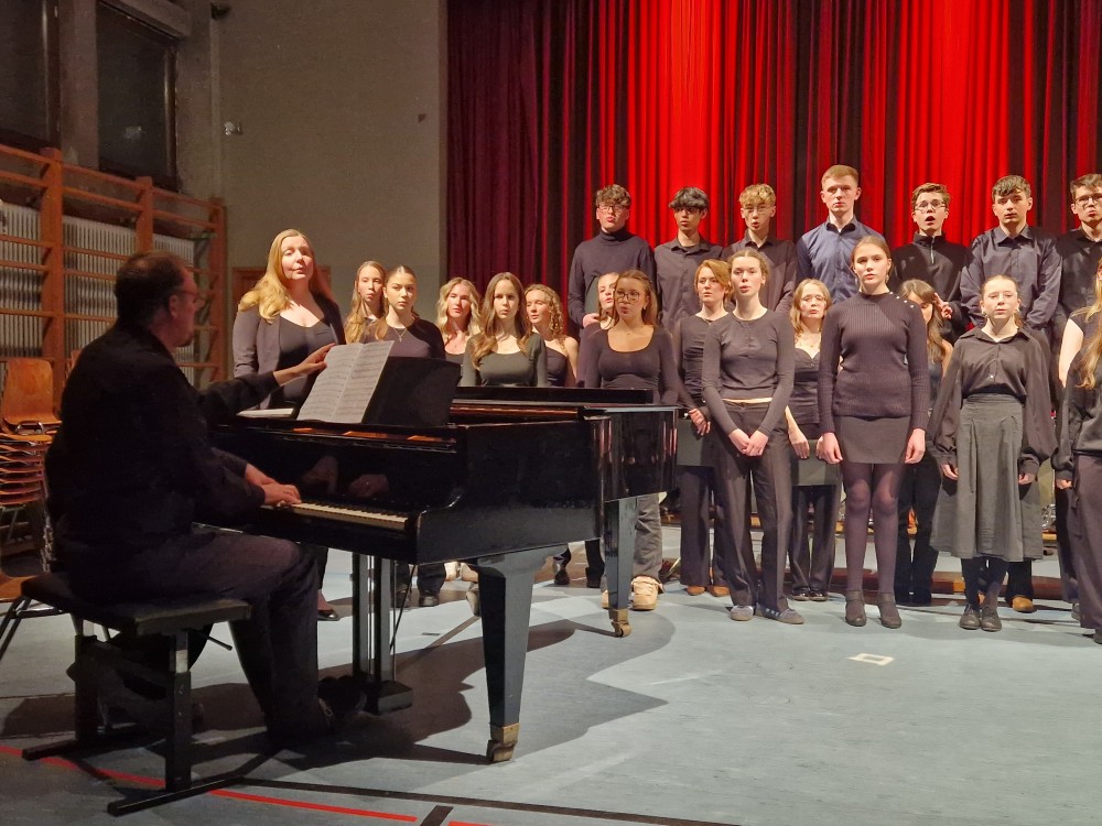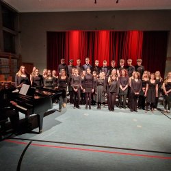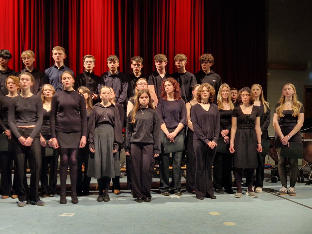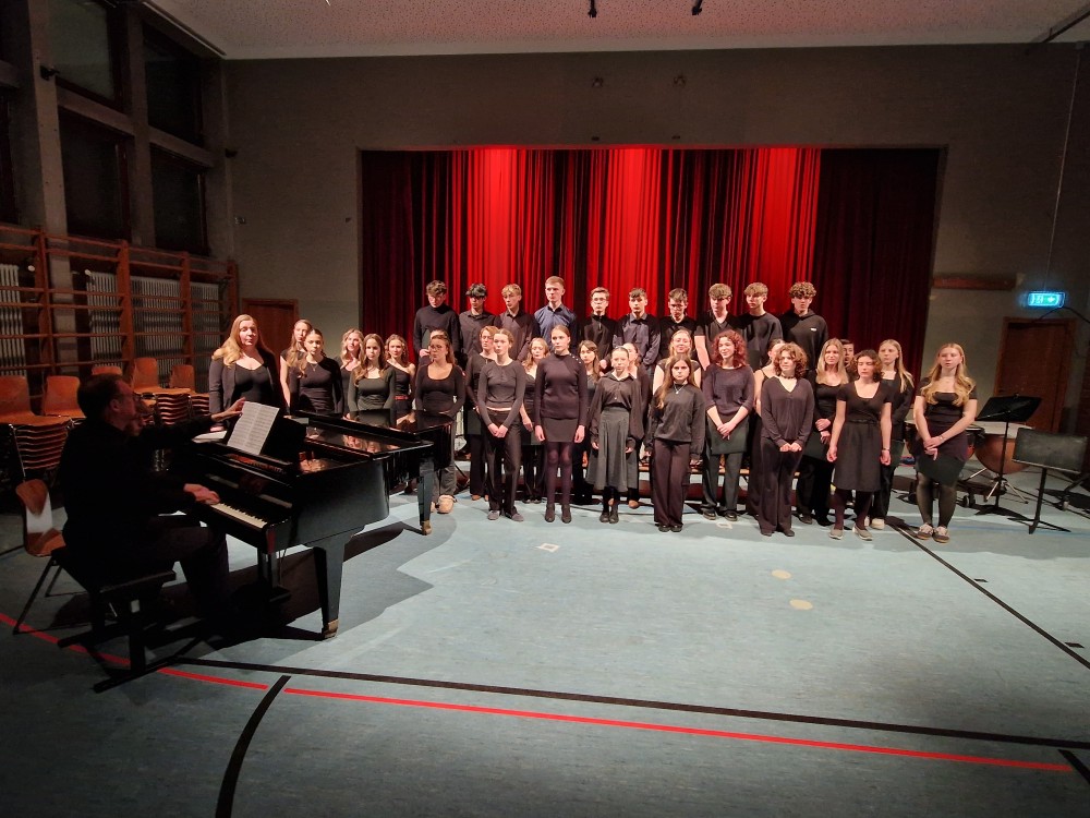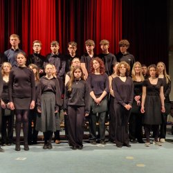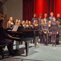Traditionell beendete schließlich der Oberstufenchor (Leitung und Klavierbegleitung: Rainer Seubold) den Konzertabend mit drei Stücken: bei „Top of the World“ und dem Jazzstandard „Puttin‘ on the Ritz“ konnte der Chor seine stimmlich-rhythmische Wendigkeit unter Beweis stellen und agierte selbst als „Bigband-section“ überzeugend. Zu dem letzten Stück „And so it goes“ gesellte sich der Mittelstufenchor mit dazu. Dieses Stück durften die jungen Sängerinnen und Sänger unlängst gemeinsam mit dem weltberühmten Gesangsensemble „The King’s Singers“ im Rahmen eines Workshops erarbeiten. Der „Spirit“ dieser inspirierenden Erfahrung war selbst noch an diesem Abend zu spüren und so fand das diesjährige Frühlingskonzert ein recht emotionales Ende.