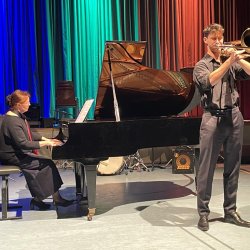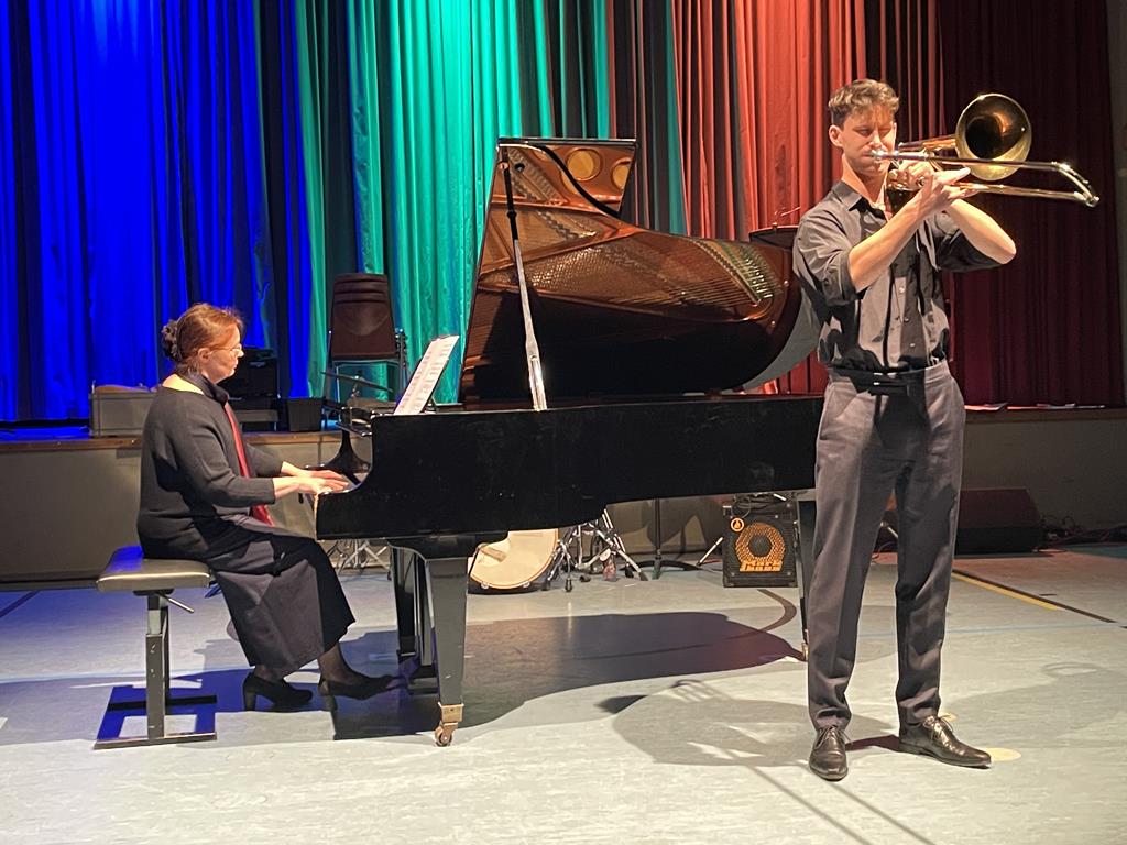 In die Reihe der Solisten des Konzertes gesellte sich nun der Abiturient Sebastian Forstmaier (Q12) mit dem virtuosen „Allegro giusto“-Satz aus dem Posaunenkonzert von Nino Rota (Klavierbegleitung: Natalia Solotych). Von Beginn an zeigte er eine überzeugend-zupackende Interpretation, die einer Jagd durch die klanglichen Register der Posaune glich.