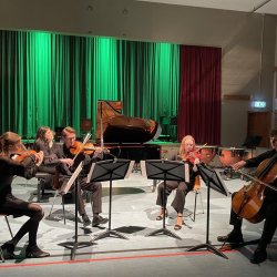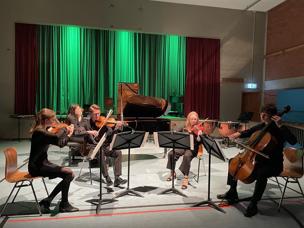 Nach diesen voluminösen Klängen tat die Kammermusikbesetzung des Klavierquintetts durchaus gut. Veronika Kuen K12 und Jonas Appelfeller 11b (Violinen), Antonia Delles K12 (Viola), Laurenz Strätz K12 (Violoncello) und Ella Löffler Q12 (Klavier) wurden von Ruth Ellner und Andrea Paletta auf das Stück „Dumka“ aus dem Klavierquintett A-Dur von Antonin Dvorak bestens vorbereitet. So wechselten intime Dialoge der Instrumente untereinander mit feurig slawischen Klängen im Mittelteil ab. Hierbei zeigten die fünf Akteure ein gehöriges Maß an musikalischer Kommunikationsfähigkeit und somit kammermusikalisches Gespür.