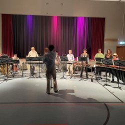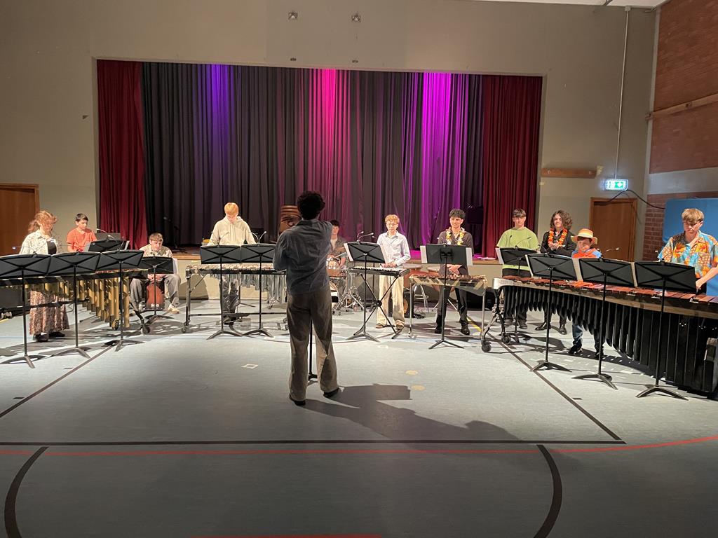 Zu Beginn des diesjährigen Frühlingskonzertes wurden die Gäste in der vollbesetzten Turnhalle auf eine Reise an die valencianische Mittelmeerküste entführt. Das ETA-Percussion-Ensemble (Einstudierung: Johannes Klehr) brachte, gut aufeinander abgestimmt, das Stück "Valencia" mit allerlei Mallet-Instrumentarium unter dem souveränen Dirigat von Yannik Söldner (K12) zu Gehör.
