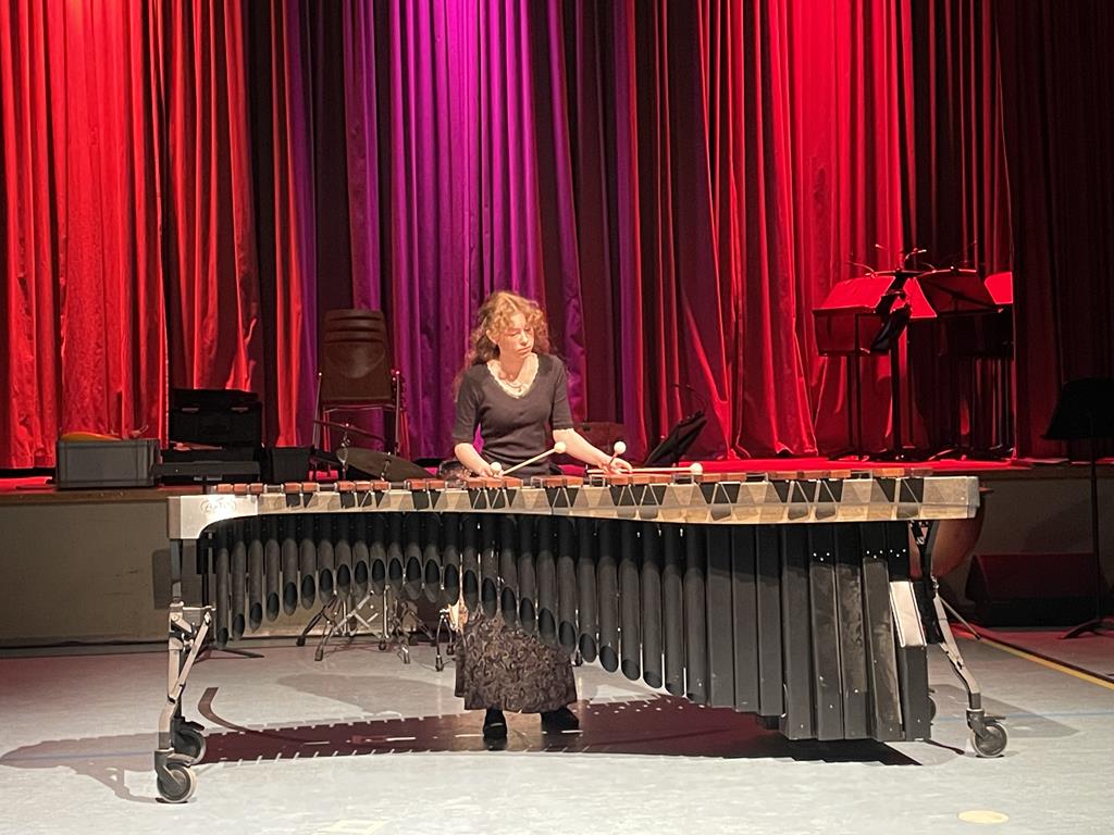 Mit dem größten Instrument dieser Gruppe, dem Marimbaphon, übernahm Katharina Görz (10c) das musikalische Ruder und entlockte ihm mit dem Stück „Piacer d’amor“ sehr fein differenzierte Klänge– mal erdig-warm und weich, mal vollklingend als mehrstimmige Akkorde.