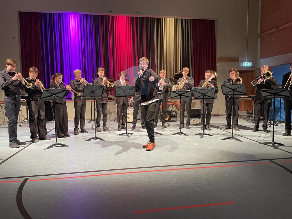 Das rhythmisch stabile Fundament des Blechbläser-Ensembles (Leitung: Frank Werner) nutzte Lasse Rother (9a) sehr souverän, um als Sänger (Einstudierung: Lisa Pagan) des „Mambo No.5“ das Publikum mitzureißen und seine Qualität als Entertainer unter Beweis zu stellen.