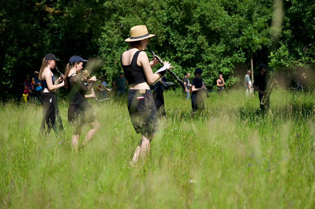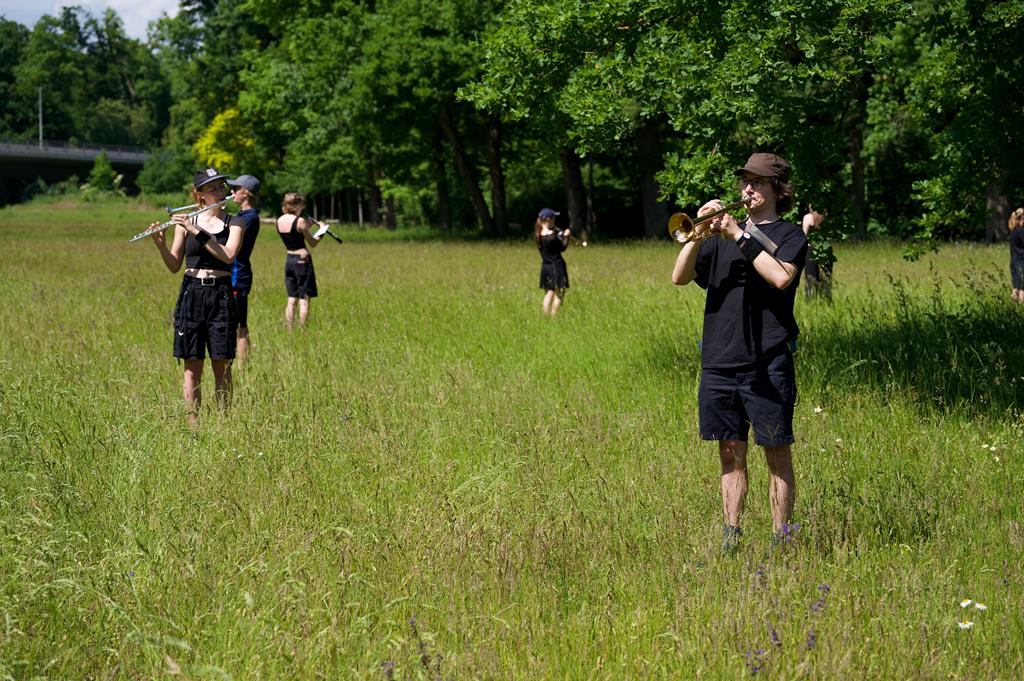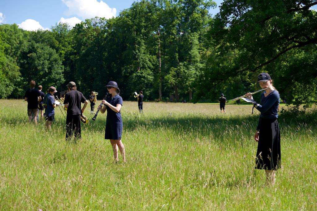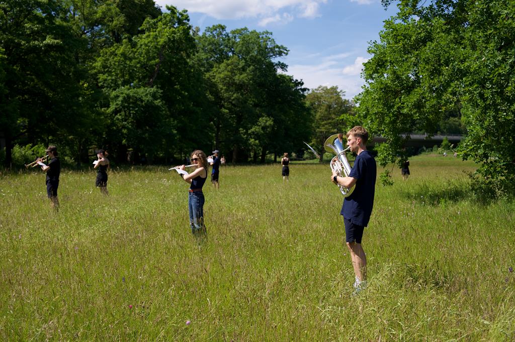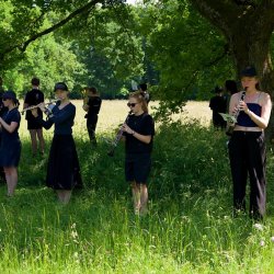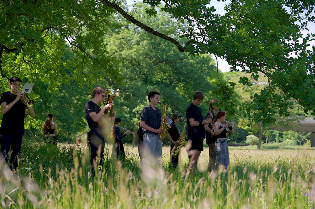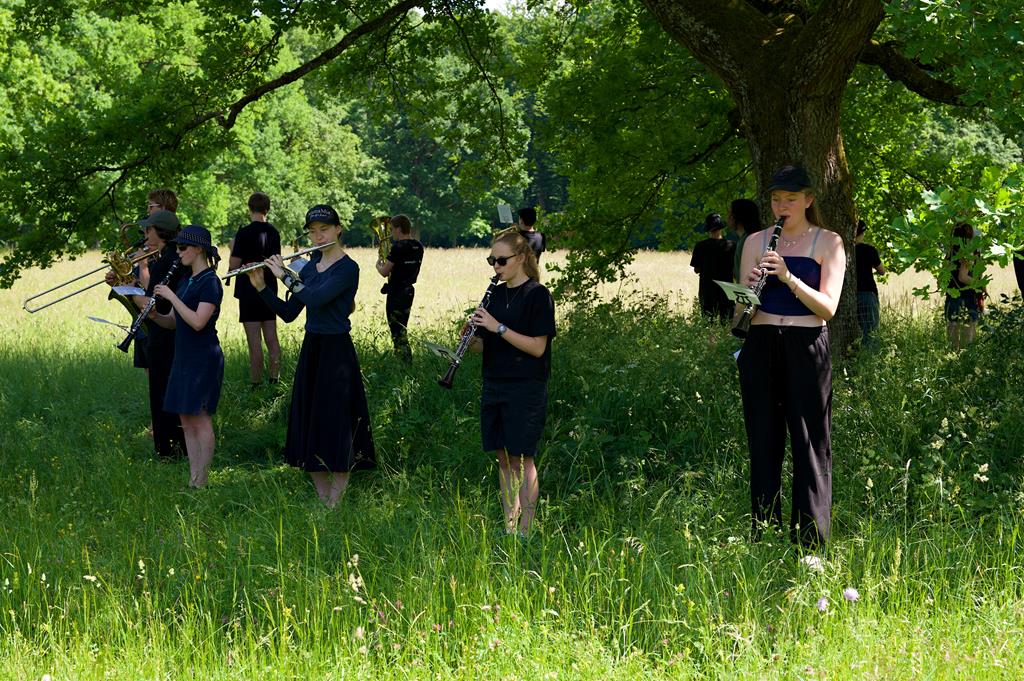 Am Samstag, den 31. Mai 2025, fand auf der Schillerwiese im Hain ein besonderes Konzert des Blasorchesters unserer Schule statt. Zwischen 15 und 17 Uhr erklang bei strahlendem Sonnenschein mehrfach die Uraufführung eines neuen Werkes des Komponisten Jochen Neurath, der das Stück auch persönlich mit dem Orchester einstudiert hatte. Die Komposition zeichnete sich durch dissonante Klänge, flächige Strukturen und lange ausgehaltene Töne aus, die die Weite und Stille der Wiese eindrucksvoll musikalisch aufgriffen. Die Zuhörer erlebten ein ungewöhnliches Hörerlebnis, bei dem sich Musik und Natur zu einem kontemplativen Ganzen verbanden. Das Konzert war Teil eines offenen Formats, das Spaziergänger und Interessierte gleichermaßen zum Verweilen einlud.