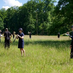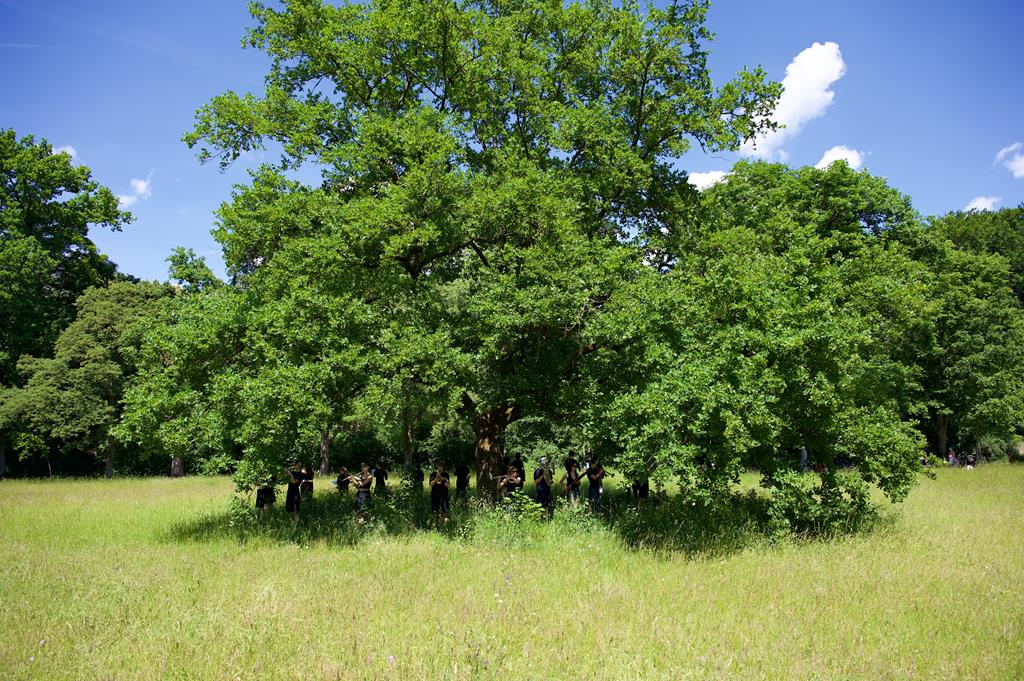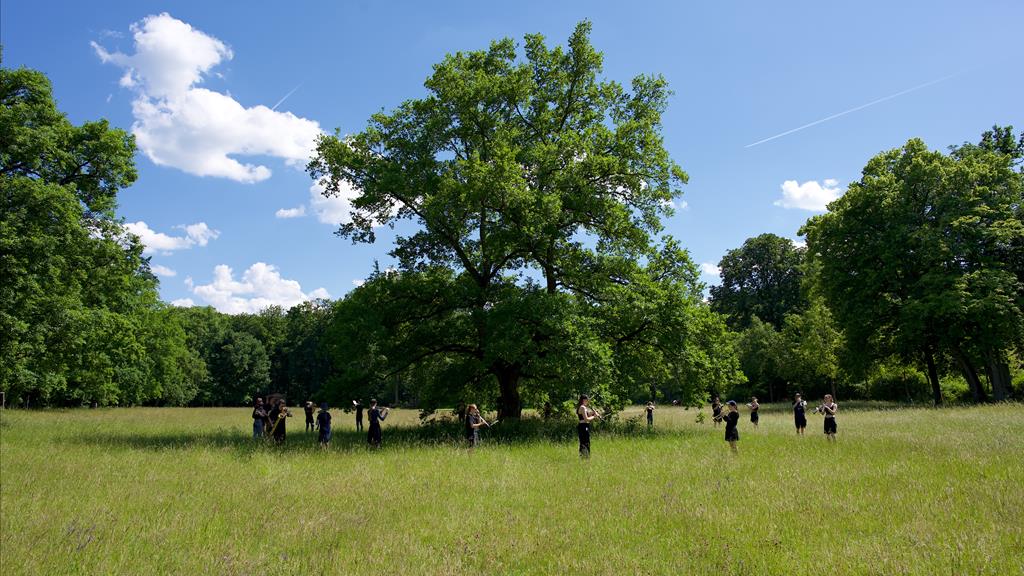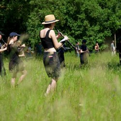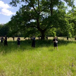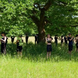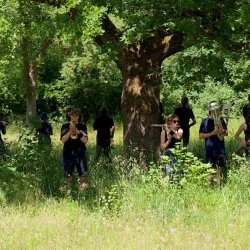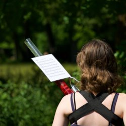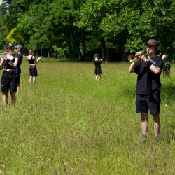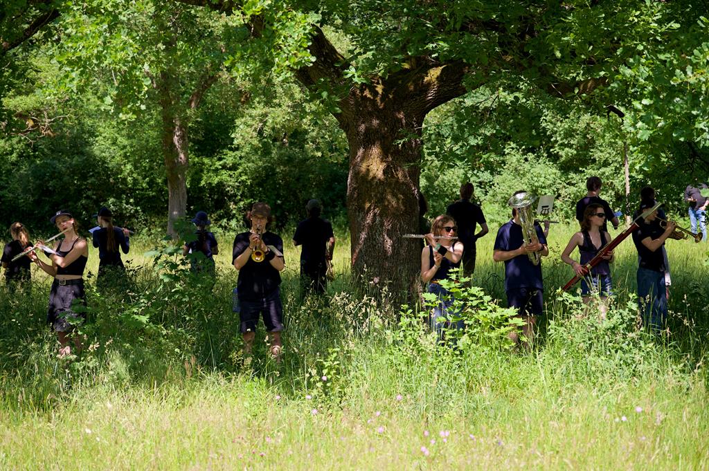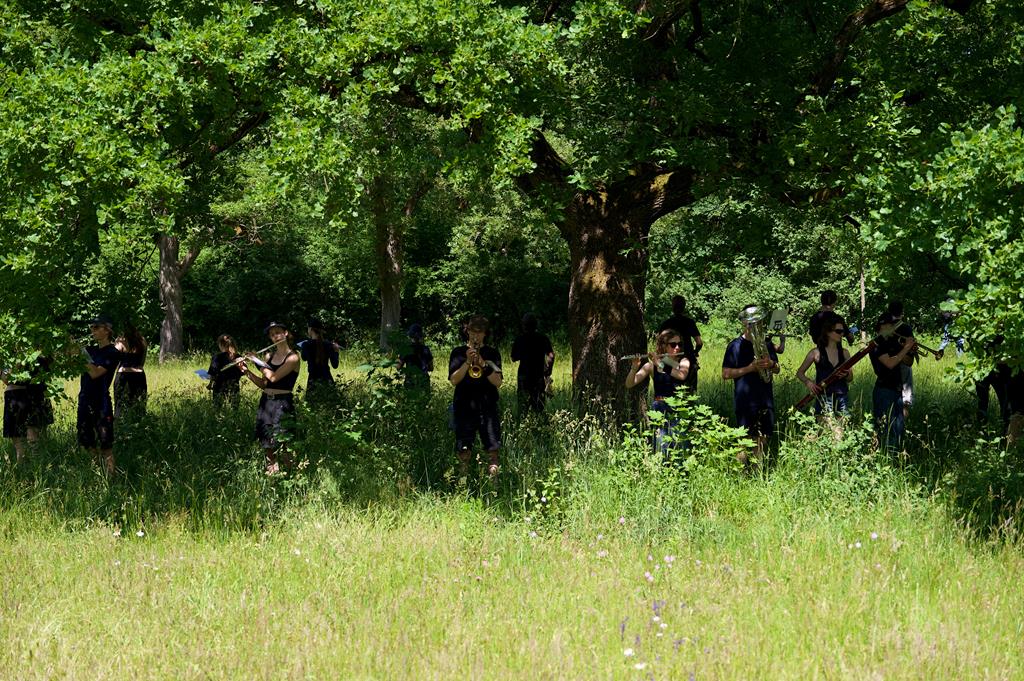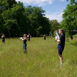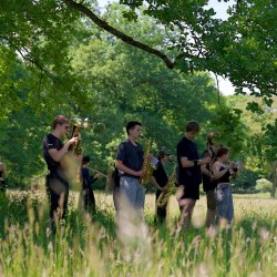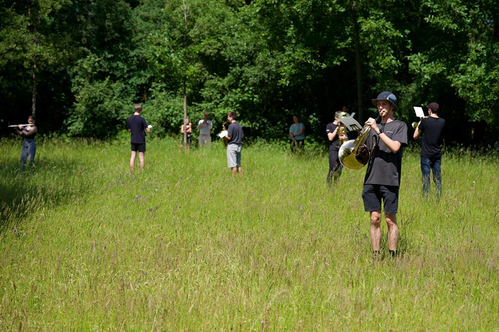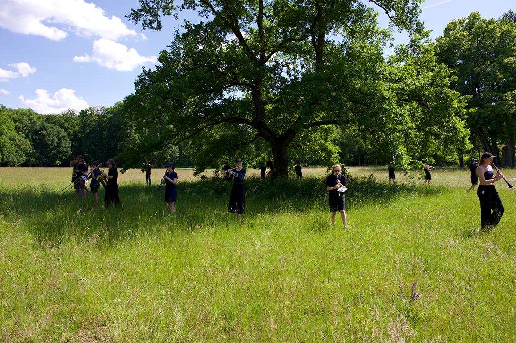 Am Samstag, den 31. Mai 2025, fand auf der Schillerwiese im Hain ein besonderes Konzert des Blasorchesters unserer Schule statt. Zwischen 15 und 17 Uhr erklang bei strahlendem Sonnenschein mehrfach die Uraufführung eines neuen Werkes des Komponisten Jochen Neurath, der das Stück auch persönlich mit dem Orchester einstudiert hatte. Die Komposition zeichnete sich durch dissonante Klänge, flächige Strukturen und lange ausgehaltene Töne aus, die die Weite und Stille der Wiese eindrucksvoll musikalisch aufgriffen. Die Zuhörer erlebten ein ungewöhnliches Hörerlebnis, bei dem sich Musik und Natur zu einem kontemplativen Ganzen verbanden. Das Konzert war Teil eines offenen Formats, das Spaziergänger und Interessierte gleichermaßen zum Verweilen einlud.