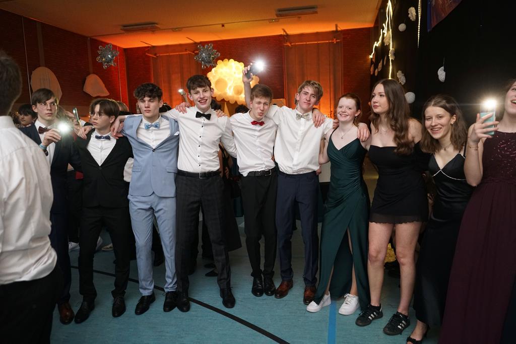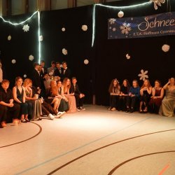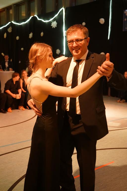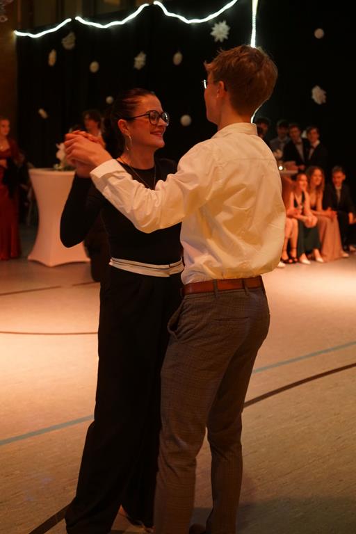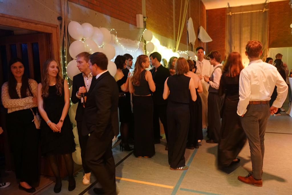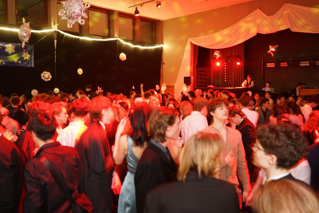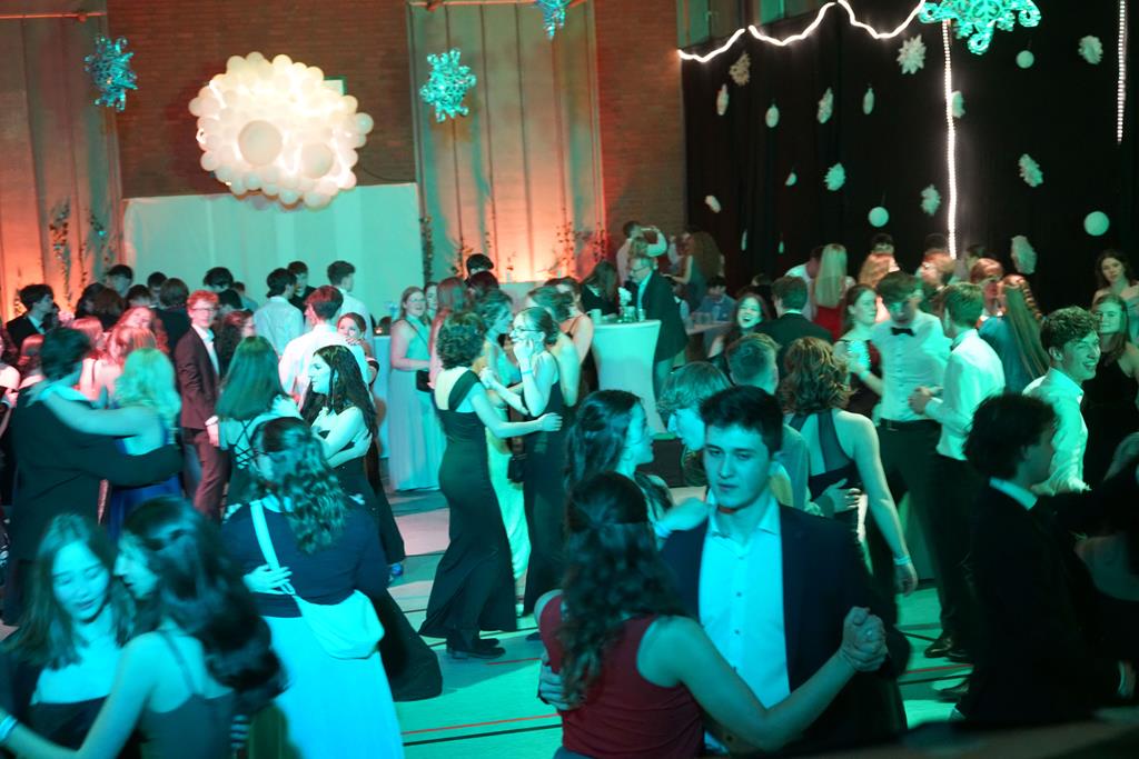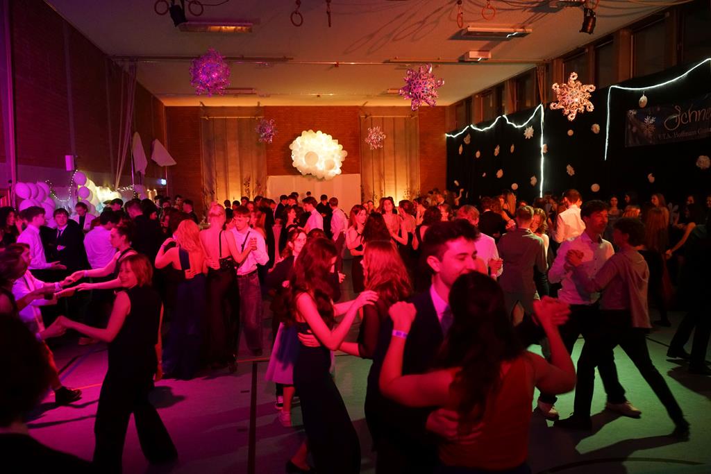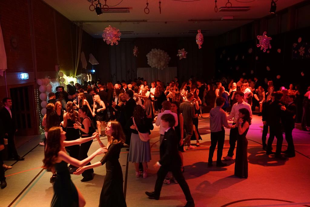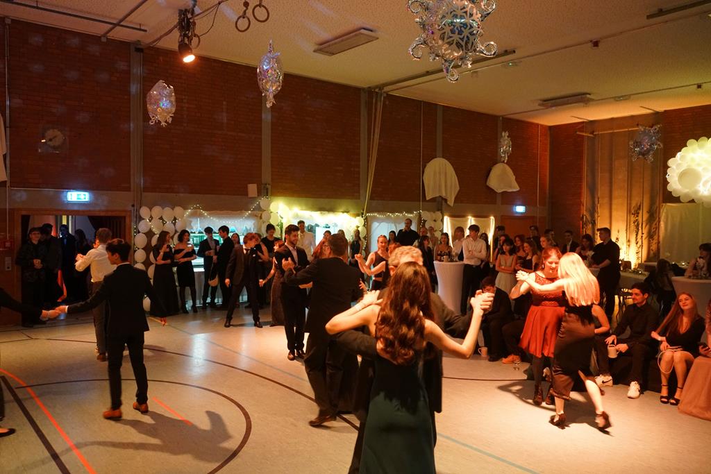 Am Samstag, den 9. März 2024 verwandelte sich die Untere Turnhalle einmal mehr in einen Ballsaal - geschmückt mit weißen Luftballons, silber glitzernden Sternen, warmweißen Lichtern und stimmungsvoll dekorierten Tischen. Nach der Eröffnung des Balls durch Emma Müller von der SMV, Dr. Michael Grimm vom Elternbeirat und Johannes Klehr, Mitglied der erweiterten Schulleitung, unterhielt zunächst die Jazz-Combo die ankommenden Gäste. An die 450 Personen in festlicher Abendgarderobe, auch aus den benachbarten Schulen, zeigten anschließend entweder, was sie in den Tanzkursen gelernt hatten, oder bewegten sich einfach "freestyle" zur Musik, die DJ Kai-Uwe Scholz nach den Wünschen der Schülerinnen und Schüler auflegte.