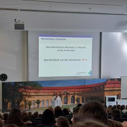 Nach den Oberärzten betrat Kilian Weidner, der bei der Deutschen Stiftung Organtransplantation ein Koordinator ist, den Hörsaal. Er zeigte, dass sehr wenige Menschen Organe nach dem Tod spenden. So gab es im letzten Jahr in Bayern 158 Spender, das sind rund zehn Spender pro 1.000.000 Einwohnern. Trotzdem warten etwa 12.000 Menschen auf Organe, davon 8.000 auf eine Niere, berichtete er. Als Organspender muss in Deutschland zwangsläufig der Hirntod vorliegen, trotzdem ist die Todesursache meist egal. Kilian Weidner machte deutlich: „Es gibt auch keine Altersbeschränkung für die Organspende.“ Eine Einwilligung zu Lebzeiten oder eine der Angehörigen ist allerdings zwingend erforderlich. Er rät deshalb, um die Angehörigen in einer schweren Zeit nicht zusätzlich zu belasten, seinen Willen klarzumachen. Entweder mündlich oder mittels eines Organspendeausweises. Bei Zustimmung können dann Herz, Lunge, Leber, Bauchspeicheldrüse, Nieren und Gewebe wie Augengewebe entnommen werden.