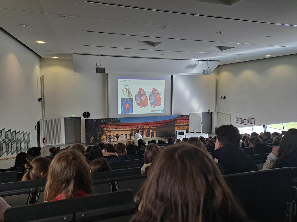 Als nächster Referent kam der Herzchirurg Dr. med. Markus Kondruweit zu den Schülerinnen und Schülern, der zuerst die Lage und Bedeutung des Herzens als sehr wichtiges Organ veranschaulichte. Denn das Herz schlägt im gesamten Leben ca. 3,4 Milliarden mal. Der Arzt zeigte die Therapiemöglichkeiten am Beispiel von Herzschwäche und machte deutlich, dass ein Spenderherz, welches eine komplizierte und möglicherweise problematische OP nach sich zieht, das letzte Mittel der Wahl ist. Trotzdem wurde die erste Herzverpflanzung bereits im Jahr 1967 in Kapstadt erfolgreich durchgeführt. Wie die Herzverpflanzungen in Erlangen funktionieren zeigte und erklärte Dr. Kondruweit unter anderem an Bildern und Videos, die zu Demonstrationszwecken im Uniklinikum erstellt wurden, sehr anschaulich. Dabei war auch unter anderem ein schlagendes Herz in der Brust zu sehen, das nach einer Herzverpflanzung zu schlagen begann. Zu den Gründen, warum Menschen ein neues Herz brauchen, zählen unter anderem koronare Herzerkrankungen, die zum Beispiel durch Rauchen verursacht werden können. Dazu bemerkte Dr. Markus Kondruweit: „Raucher finanzieren den Laden hier.“, und weiter: „Rauchen ist Selbstmord auf Raten.“ Egal aus welchen Gründen, es brauchen viele Menschen ein menschliches Spenderherz. Doch wegen Organmangel, berichtet der Mediziner, könne man erst in der höchsten Dringlichkeitsstufe ein Herz bekommen. Mit diesen Eindrücken und einer Menge an neuem Wissen verließen die 10. Klassen Erlangen und den dortigen kleinen Kosmos der Universitätsklinik.