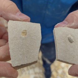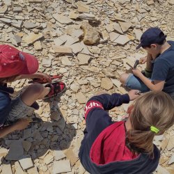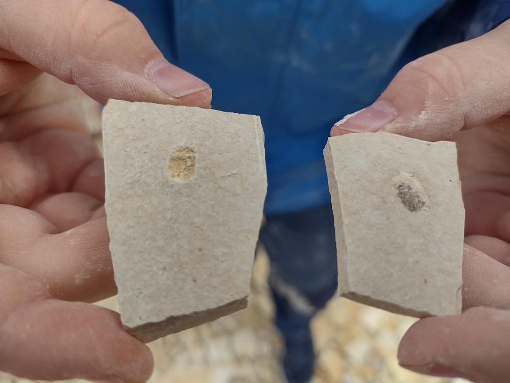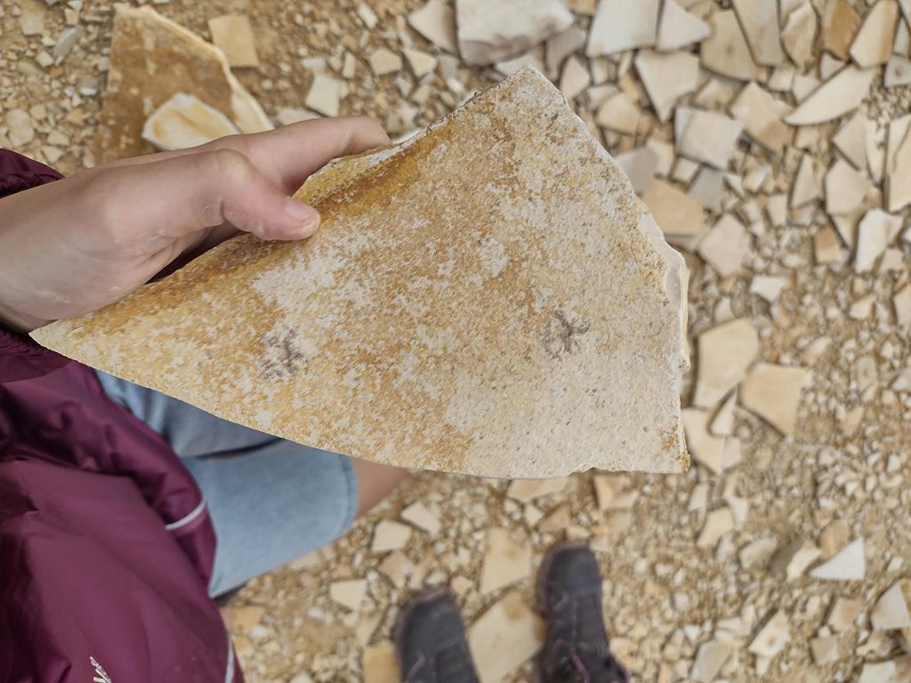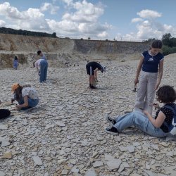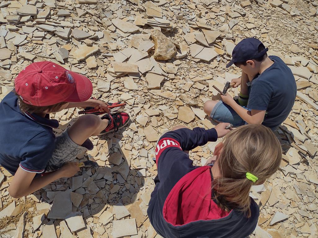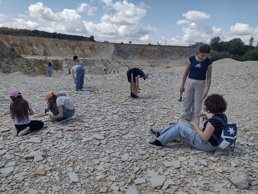 Nach einer kurzen Einweisung durch eine Mitarbeiterin im Steinbruch durften wir unsere Suche nach einzigartigen Fossilen mit Hammer und Meißel beginnen. Neben kleineren Funden, wie Haarsterne und Ammoniten, gab es auch einen größeren Fund: eine Kalzit-Ader, die aber im Steinbruch bleiben musste.