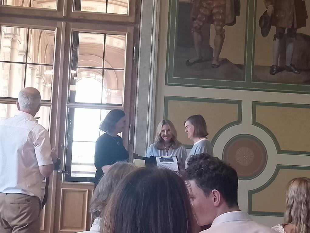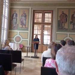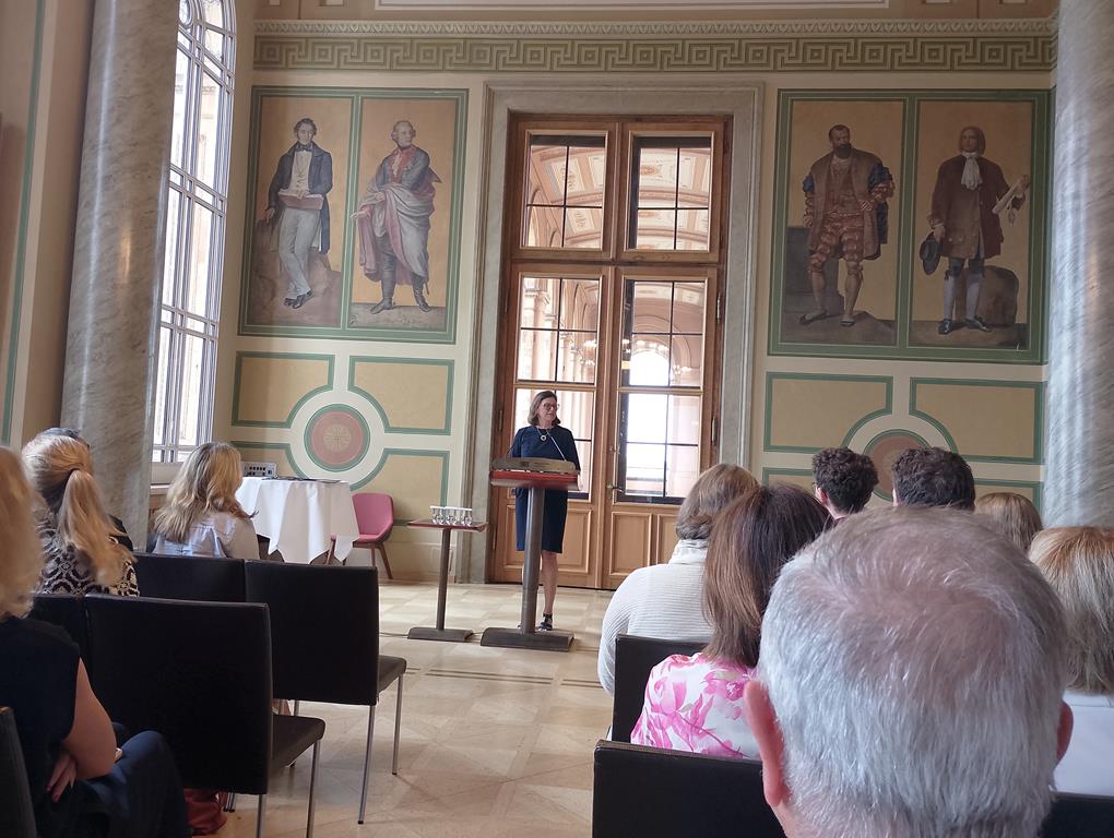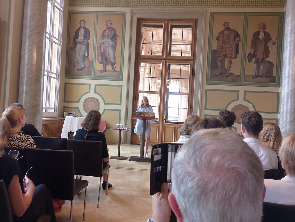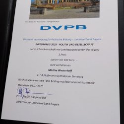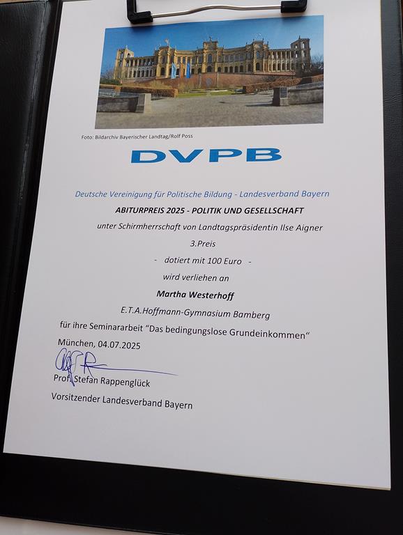 Der Bayerische Landesverband der Deutschen Vereinigung für Politische Bildung lobte auch in diesem Jahr einen W-Seminarpreis für hervorragende Arbeiten aus dem Themenfeld der politischen Diskussion aus. Bei der Siegerehrung im Akademiesaal des Maximilianeums sprachen zunächst die Schirmherrin, Landtagspräsidentin Ilse Aigner sowie die Staatsministerin für Unterricht und Kultus Anna Stolz über die Bedeutung des politischen Engagements junger Menschen und würdigten die Preisträger. Im Anschluss sprach Prof. Dr. Stefan Rappenglück über die drei prämierten Arbeiten und hob die hohe Fachlichkeit, die umfassende Darstellung sowie die Relevanz der Fragestellung hervor. Im Anschluss erfolgte die eigentliche Preisverleihung, bei der Martha Westerhoff für ihre Arbeit „Das bedingungslose Grundeinkommen – Wunsch und Wirklichkeit“ (Leitfach: Wirtschaft und Recht) den dritten Platz belegte. Die Urkunde, den Geldpreis und den Gutschein für eine Teilnahme an einem Seminar der Politischen Akademie in Tutzing nahm in Vertretung ihre Mutter entgegen.