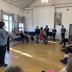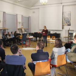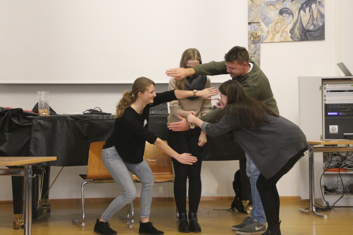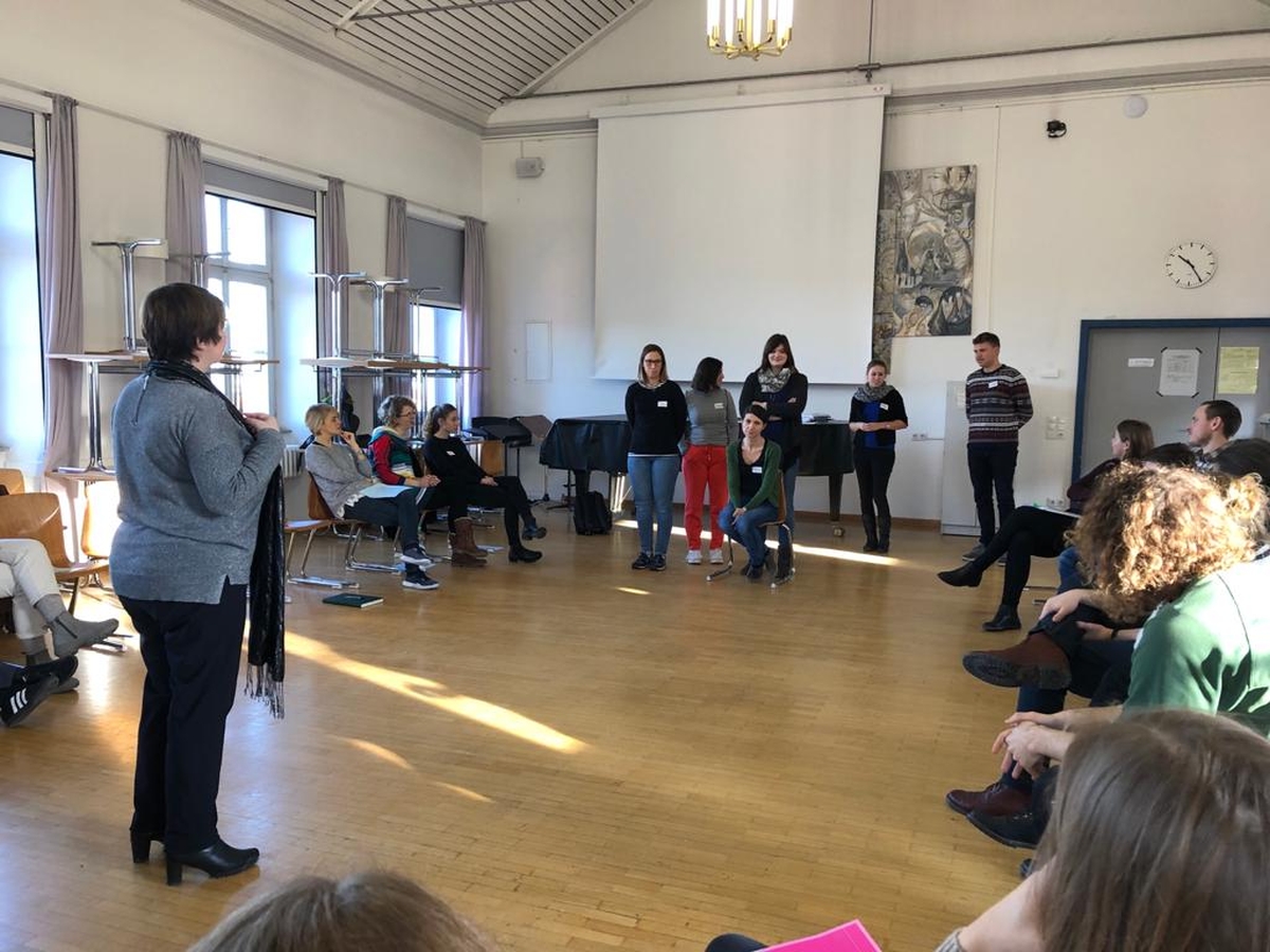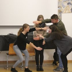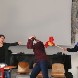Erneut konnten 27 Studienreferendarinnen und –referendare an der zweitägigen Fortbildung zum Szenischen Lernen teilnehmen, die seit vielen Jahren bereits am E.T.A. angeboten wird. Ziel dieses Lehrgangs ist es, den angehenden Lehrkräften Impulse zu geben, szenische Elemente als bereichernde Inhalte in den Unterricht einzubinden. Dabei geht es natürlich auch um Freude am Spielen, aber vor allem um die Vermittlung, Festigung und Übung von Lernstoff durch szenisches Spielen. Am 17. und 18.12. waren diesmal Teilnehmer/innen von Studienseminaren aus Bamberg, Bayreuth und Kronach dabei.