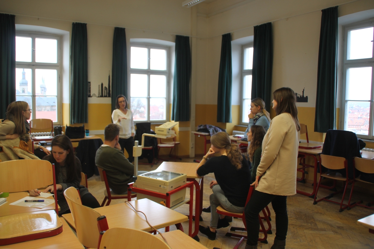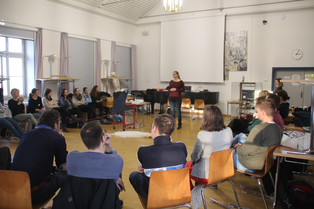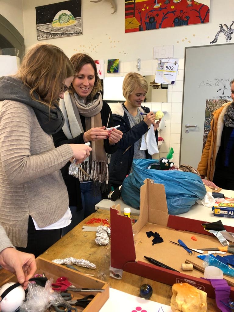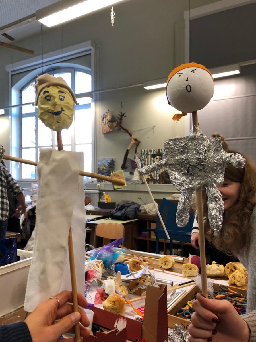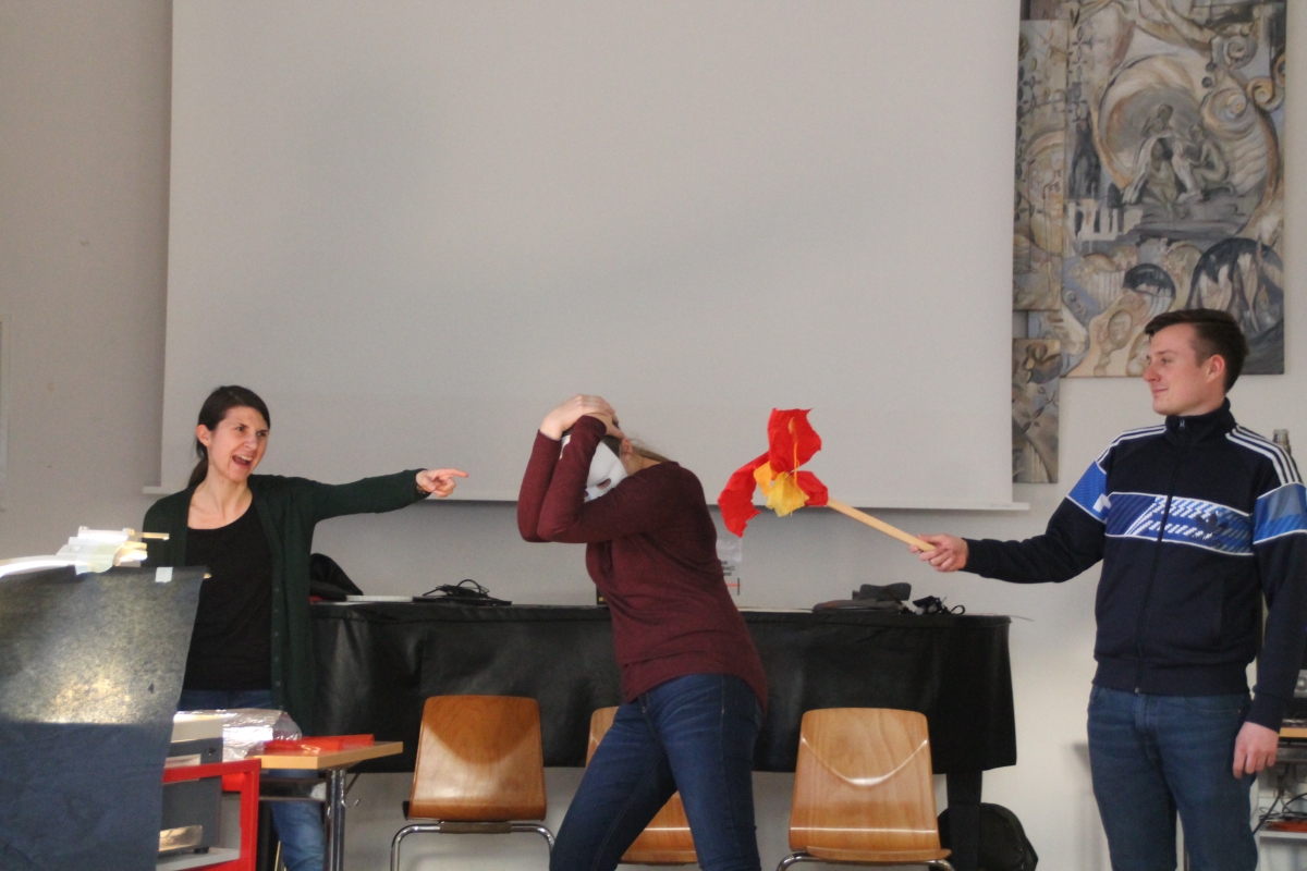 Nach der Begrüßung durch den Schulleiter, Markus Knebel, führte Ulrike Endres, Schulleiterin am CVG Kulmbach und Multiplikatorin für "Szenisches Lernen" in der regionalen und überregionalen Lehrerfortbildung die Teilnehmer/innen in Grundelemente des personalen Spiels und der Körpersignale durch praktische Übungen ein. Derartig aufgewärmt durfte ans Basteln gegangen werden, denn bei Tina Morcinek wurden Einsatzmöglichkeiten für optische und haptische Spielträger erprobt – es entstanden Puppen, Schattenformen und Requisiten, die im Unterricht schnell und unkompliziert zur szenischen Bereicherung einsetzbar sind.