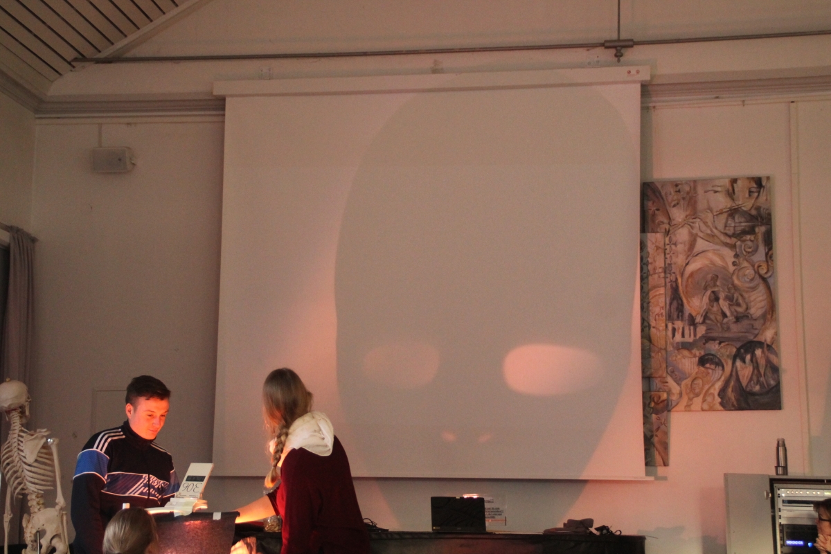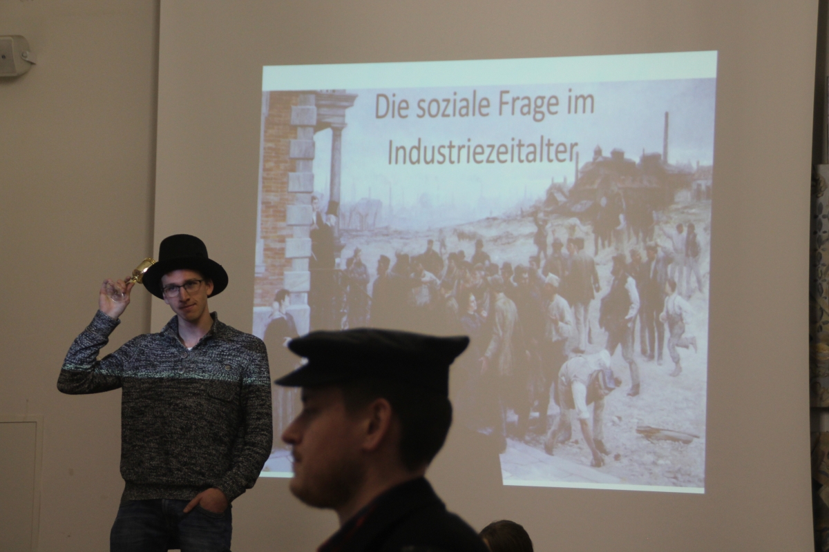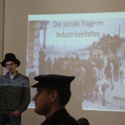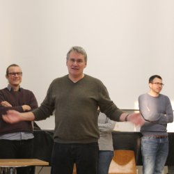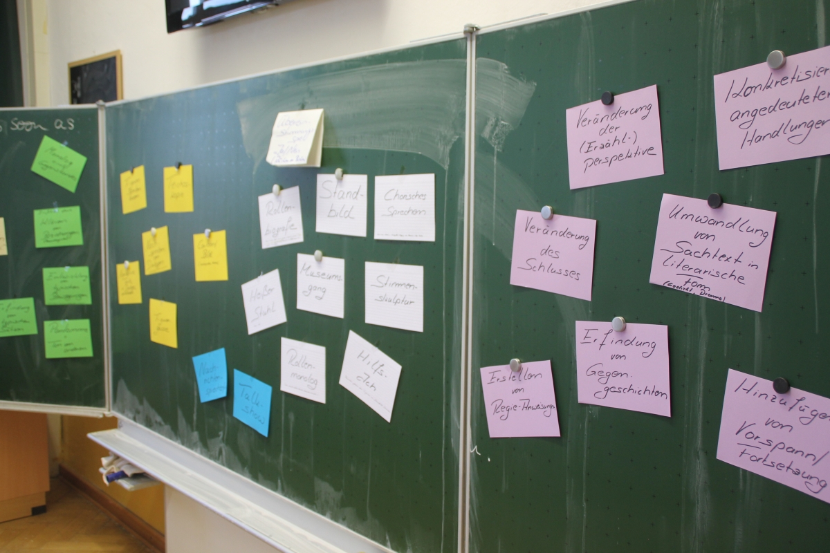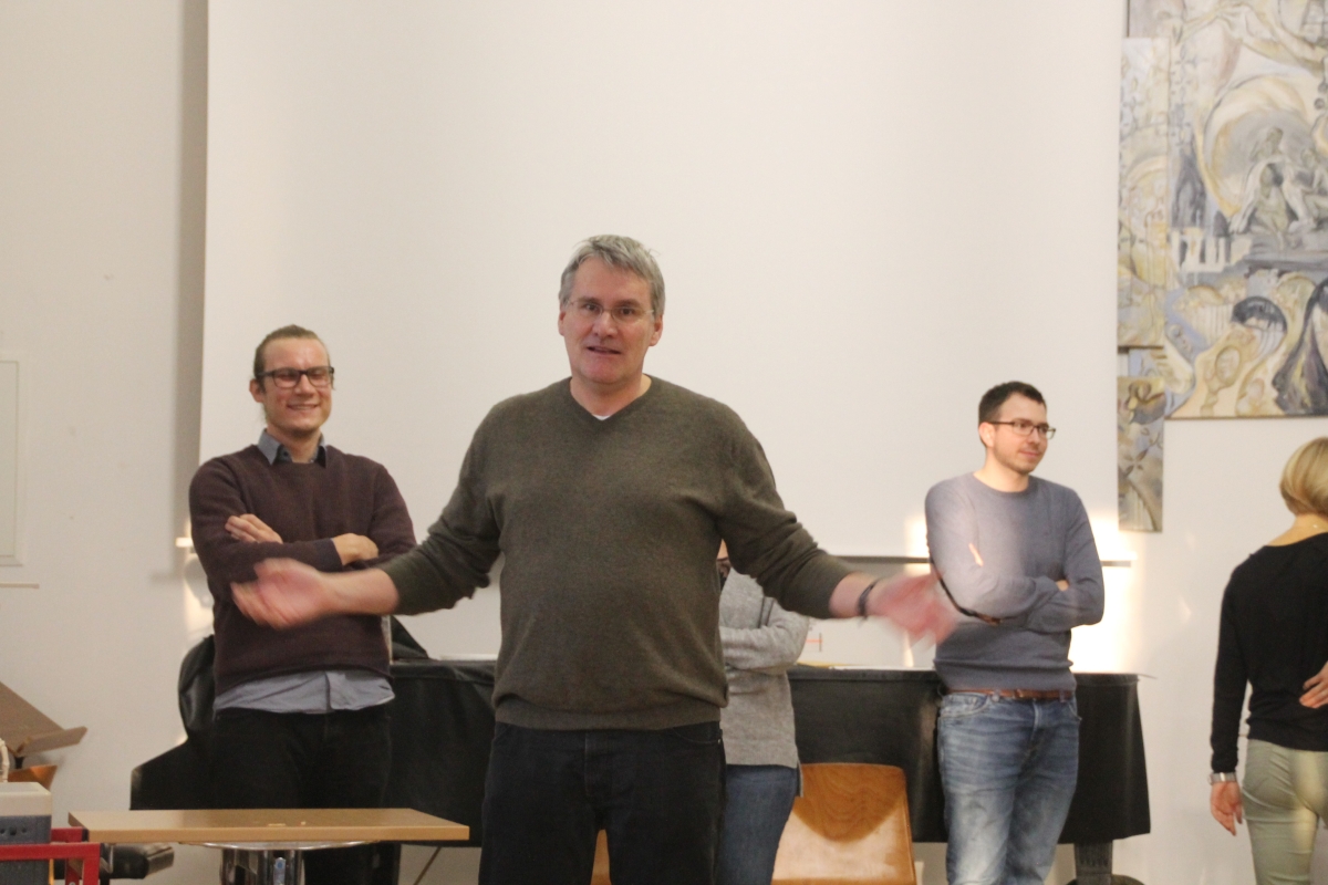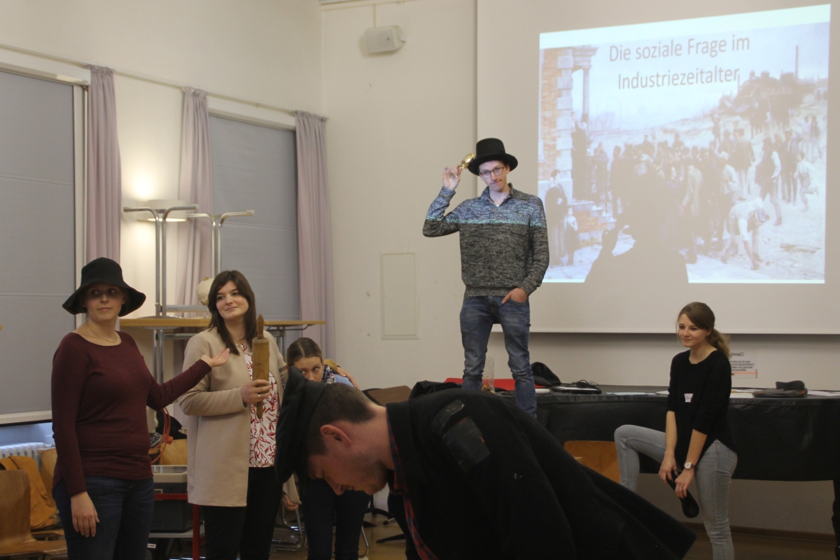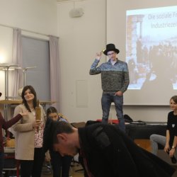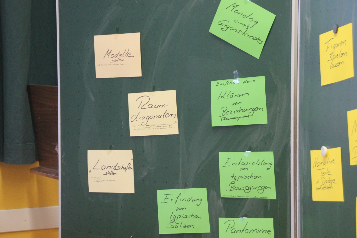 Derartig vorinformiert teilten sich die Referendar/innen schließlich in Facharbeitskreise auf, die am zweiten Tag ganztägig an der Umsetzung in bestimmten Projekten arbeiteten. Zu den bereits genannten Workshop-Leitern Tina Morcinek (Englisch/Sprachen) und Holger Landgraf (Video) kamen nun noch Ulrich Steckelberg (Geschichte) und Anja Kießling (Deutsch) hinzu. Die Ergebnisse der Gruppen wurden am Ende den anderen Kursteilnehmer/innen vorgestellt, wobei stets der Schwerpunkt auf der Umsetzbarkeit im Unterricht lag. So wurde ein Lehrbuchtext für eine 8. Englischklasse mittels Schattenspiel und Standbildern erlebbar gemacht, worauf ein Märchen für eine 5. Klasse Deutsch durch das Versetzen der Personen ins „Freeze“ zunächst inhaltlich strukturiert, dann durch ein Polizeiverhör mit Charakteren des Märchens szenisch ergänzt wurde. Für das Fach Geschichte wurde gezeigt, wie eine ganze Lerngruppe durch die szenische Umsetzung eines Bildes über die Konflikte während der Industrialisierung aktiviert werden kann, wodurch der Lerneffekt sicherlich erhöht wird. Und schließlich präsentierte die Videogruppe ein durchaus humorvolles Erklärvideo zu den Sicherheitsregeln beim naturwissenschaftlichen Arbeiten (einsetzbar z.B. in einer 7. Klasse).