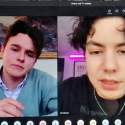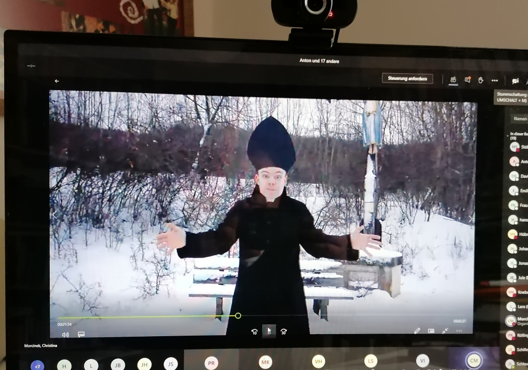 Was an dieser Stelle gesagt werden muss: Die Mitglieder dieses Seminars blieben bis zum Schluss bewundernswert dabei. Irgendwann hatten alle schon so viel Arbeit in dieses Projekt gesteckt, dass jetzt auch – allen Widrigkeiten zum Trotz – eine Aufführung stehen musste. Und die gab es dann am 15.1.2021 in einer Videokonferenz, an der auch interessierte Lehrkräfte und die Schulleitung teilnahmen. Dafür wurden Szenen noch ein letztes Mal umgeschrieben, in eine völlig neue Umgebung gesetzt (die Schule durfte ja nicht mehr betreten werden) oder sogar live aufgeführt. Die „Wege“ wurden noch ein letztes Mal abgegangen, und der Applaus erfolgte über die Mikrofone der Teilnehmer der Videokonferenz.