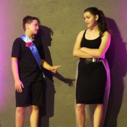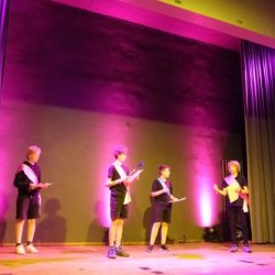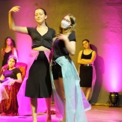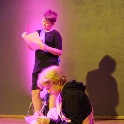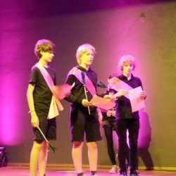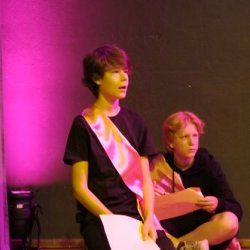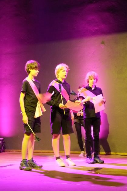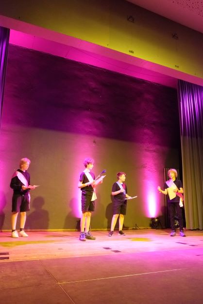 Kein Wunder, dass die Ritter den Damen daher zu Füßen liegen – Jesaja Weissenhorn (7b), Hannes Nordmann (8c), Daniel Wrieden (7e), Leopold Krapp (7e) sowie Linda Klaumünzer (7b) stellen diese Ritter auf gelungen witzige und charmante Weise dar. Es ist eine Freude, dem unbeholfenen Ritter Mum (gelassen präsentiert von Jesaja Weissenhorn), dem tolpatschigen Ritter Deinhard (Daniel Wrieden gefällt in der witzigen Darstellung durch und durch) sowie dem etwas naiv anmutenden Ritter Kupferberg (überzeugend umgesetzt von Hannes Nordmann) zuzusehen, wie sie mit Schwimmnudeln ihr Rittertraining absolvieren oder gemeinsam versuchen, möglichst kreative Liebesbriefe an die Hofdamen zu verfassen. Zum Glück haben sie ihren Chef-Ritter Delorges, der tatsächlich Ahnung von ritterlichem Gebaren hat und unglücklicherweise in die widerborstige Kunigunde verliebt ist. Sowohl Leopold Krapp als auch Linda Klaumünzer brillieren in dieser Rolle, nicht nur als sie der Königstochter Kunigunde ihren Liebe gestehen oder ihren Handschuh zurückbringen. Vor allem, wenn sie am Ende des Geschehens die ganze Ballade „Der Handschuh“ vor dem versammelten Hofstaat und dem Publikum darbieten, versetzen sie den Zuschauer in Staunen: mit eindrücklicher Intonation hauchen sie Schillers Ballade Leben ein und ziehen das gesamte Publikum in ihren Bann. So kann, wie man an der gelungenen, abwechslungsreichen Inszenierung erlebt, Lyrik auch im 21. Jahrhundert noch Spaß machen. Bleibt zuletzt die Frage – warum wurde der Handschuh geworfen und wie ergeht es Ritter Delorges?