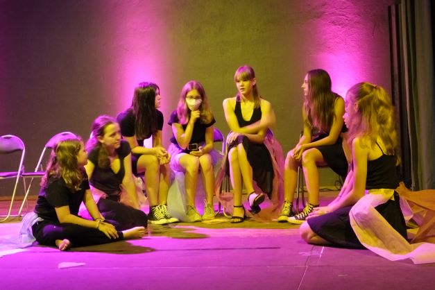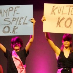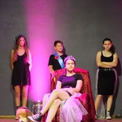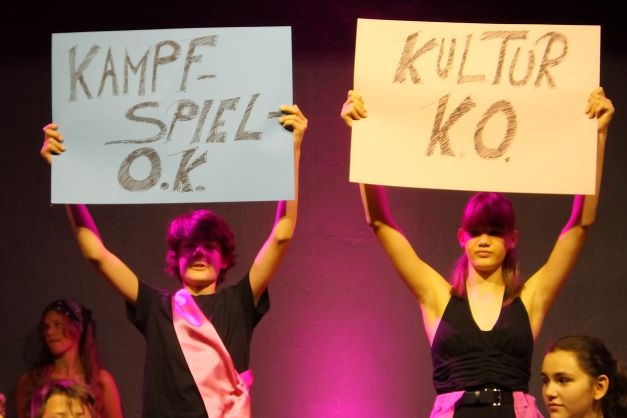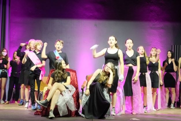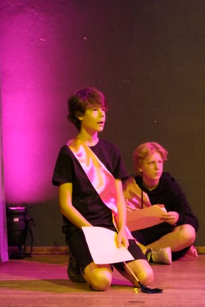 Die Bühne ist in herrschaftliches Licht getaucht, mit nur wenigen Requisiten ausgestattet, wird man dennoch sogleich durch Licht und herrschaftliches Kostüm der Protagonisten in ein Leben am Hof eingeführt, das – nach Ansicht des Königs Franz, der in Doppelbesetzung sowohl von Lotte Pachl (7b) sowie Lola Loskarn (7b) herrschaftlich gelangweilt dargestellt wird, ein wenig Aufregung vertragen könnte. Sogleich lässt sich seine Königin Josefa dazu hinreißen, Abwechslung am Hof zu propagieren. Sowohl Luise Müller -Kuller (7b) als auch Sarah Brander (8d) stellen die Umtriebigkeit der Königin angeregt dar, denn diese möchte ihrer Tochter Kunigunde das Wesen von Kultur und Bildung vermitteln. Bravourös wandeln die jeweiligen Königinnen überzeugt und klar im Sprachduktus über die Bühne und geben den Ton an. So werden Lyrik-Stunden und Theaterspiel anberaumt, obwohl der König lieber Kampfspiele hätte. Ebenso wie im Übrigen die Königstochter Kunigunde lieber Action statt Lyrik hätte. Kunigunde entspricht nun nämlich so gar nicht dem Typus der braven königlichen Tochter. Lucine Schmitz und Anna Rothmann stellen die rebellische Königstochter, die lieber Ritter geworden wäre, auf souveräne Weise dar. Unterstützen muss deren abwegigen Ideen die Hofdame Roswitha, die selbst eher darunter leidet, Schwertkampf zu trainieren und das unschickliche Verhalten Kunigundes auszubaden. Es ist eine Freude sowohl Janina Kilger (8c) als auch Ida Palatzky (8d) in dieser Rolle der protestierenden Freundin spielen zu sehen.