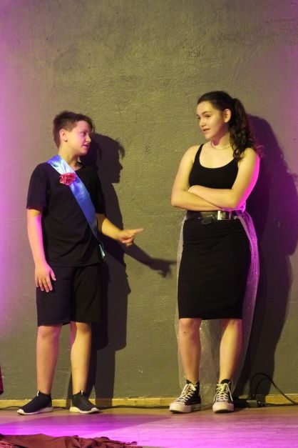 Zum Glück hat sich seiner schon während des ganzen Geschehens Haumeisterin Hildegard angenommen – diese witzige Nebenfigur ist es, die am Ende den Ritter tröstet, der von Kunigundes auf so schmähliche Weise zurückgewiesen wurde. Auf sehr smarte Art und Weise setzten sowohl Mila Patowari (7b) als auch Anna Lou Winkler (8d) die burschikose Hausmeisterin ins rechte Licht.
