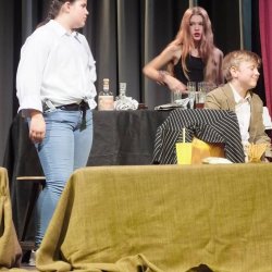 Die Zuschauer sind gezwungen ihre Vermutungen anzustellen und tappen ebenso im Dunkel wie der ambitionierte Reporter (Anton Franz). Alle Hoffnungen liegen auf den Polizisten. Doch vergebens, denn diese schrulligen Kriminalbeamten (ein gutes Team: Maria Hespelein und Laura Postler) sind von dem Mordfall und der Vielzahl der Motive eindeutig überfordert. Es kristallisiert sich immer mehr heraus, dass die Bardamen wohl am Ehesten die Möglichkeit hatten, dem Frauenheld die tödliche Dosis Zyankali unterzuschieben. Als der Boss diesen Zusammenhang begreift, zieht er die Waffe und es fällt ein Schuss im Dunkel.