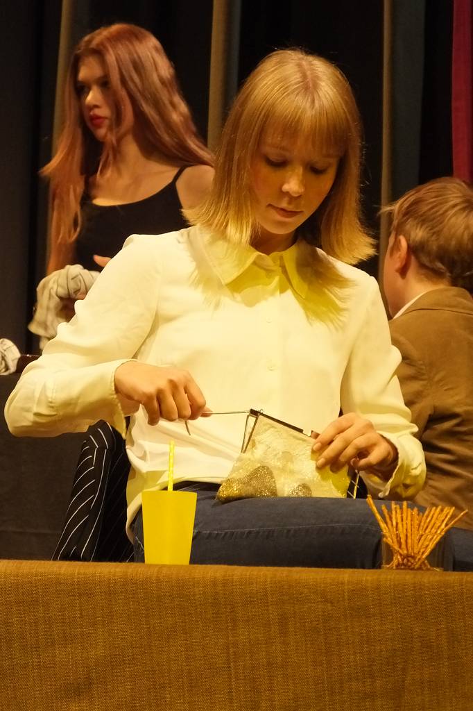 Ein Unschuldslamm war dieser Adriano nicht, eher ein Playboy und ein Mafioso. Für den Boss war er sein bester Mann. Stets konnte er sich auf ihn verlassen, seine Aufträge führte er mit Präzision aus. Frederick Schwarzenberger lässt die Verzweiflung über den Verlust deutlich erkennen und gestaltet den zwielichtigen Boss durchaus sympathisch. Auch seine Assistentin (sehr distinguiert Elisa Rudat) kann bestätigen, dass Adriano für die Firma äußerst wichtig gewesen ist. Vielleicht verbindet sie ja auch mehr als berufliche Zusammenarbeit? Vorstellbar wäre es durchaus, denn warum sollte sie die einzige Frau auf der Bühne sein, mit der Adriano kein Verhältnis gehabt hat? Ein Romantiker war er jedenfalls gewesen, was die Künstlerin (schön verträumt Licinio Ferreiro Machado) bestätigt. Außerdem zogen ihn gutaussehende Damen an, wie man an seiner Beziehung zum Model erkennen kann. Dessen Starallüren werden von Hanna Wolf herrlich überspitzt dargestellt. Eine Beziehung unterhielt er auch einst mit der Staatsanwältin (professionell verkörpert von Laura Burek) nicht ohne daraus eigene Vorteile für seinen Prozess zu ziehen, sowie mit der Ärztin, die aufgrund ihres Berufs Zugang zu diversen eigentlichen verbotenen Substanzen besitzt. Ada Müller spielt die Ärztin mit feinem Minenspiel und sehr klarer Sprache, sodass im Zuschauer kein Zweifel an ihrer Souveränität aufkommt. Keine Liebesbeziehung zu Adriano hatte hingegen der Stammgast, der gerne mit Adriano Schach spielte und sich weniger gerne von ihm darin schlagen ließ. Aber reicht das für ein Motiv? Wohl eher weniger. Dennoch weiß dieser Stammgast (verschmitzt und sprachlich schön modulierend dargestellt von Conrad Morcinek) genau Bescheid und kennt die Verstrickungen Adrianos mit den diversen Damen genau, denn als Privatdetektiv ist es nun mal seine Aufgabe, den Durchblick zu haben. Daher weiß er auch davon, dass die beiden Damen hinter der Bar, die Chefin und ihre Schwester (sicher verkörpert von Emilia Stadlmayr und Leonie Lewin) ebenso ein Motiv wie die anderen Damen im Raum haben, denn auch hier brach Adriano Herzen.