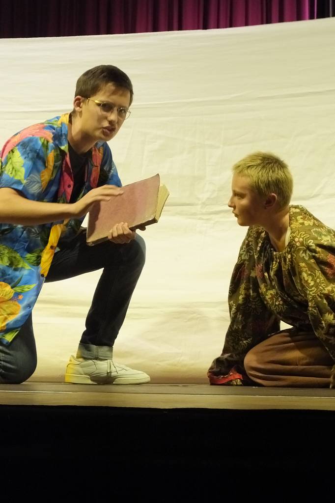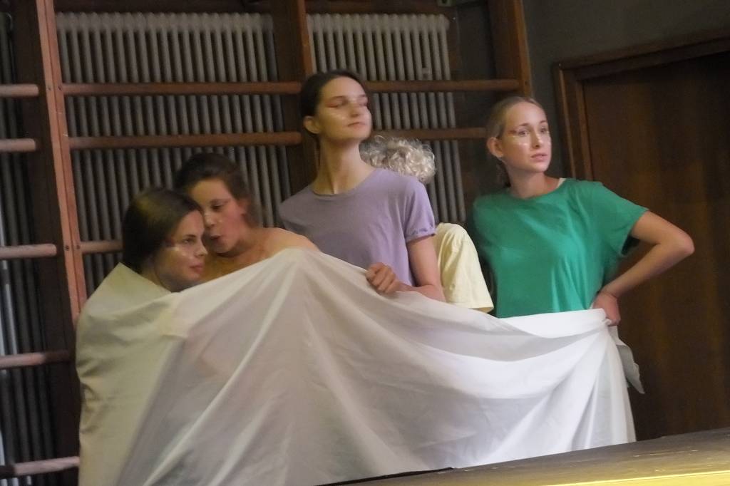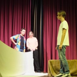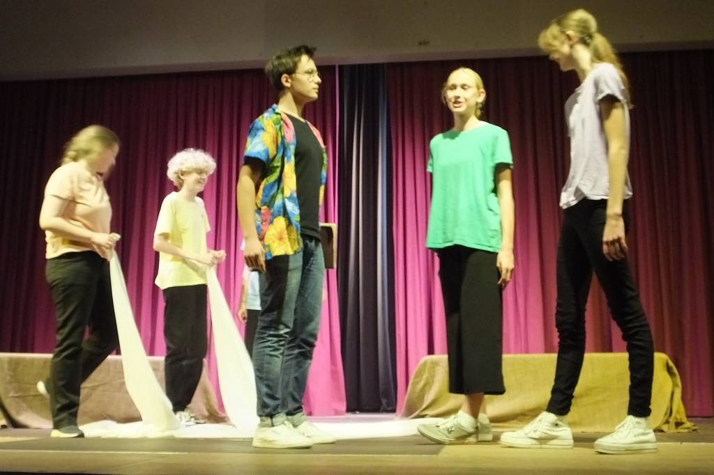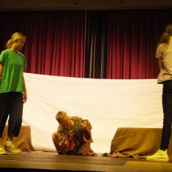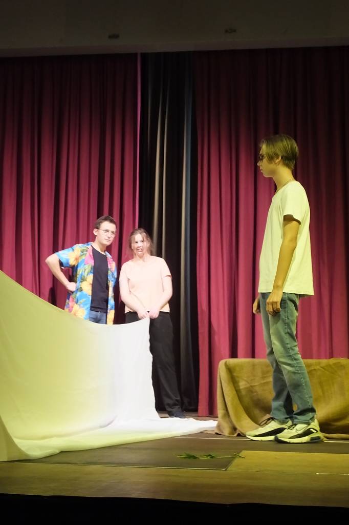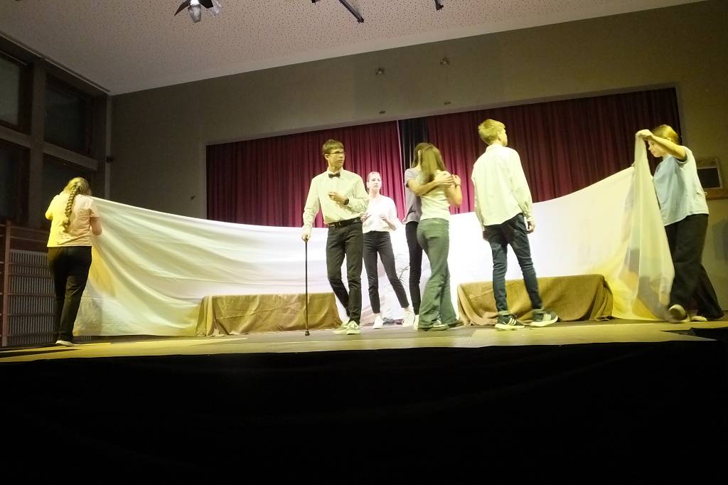 Nun denn – man ahnt – allein mit dem Schiffbruch ist es nicht getan. Auf der Insel wird das Treiben dann erst so richtig wild – und das liegt nicht nur an den Geistern, die das Umherirren der einzelnen Figuren auf der Insel szenisch geschickt mittels seidiger Tücher verdeutlichen. Mittels dieser führen sie die Gestrandeten sichtbar an der Nase herum und Ruta Bauernschmitt (9b), Charlotte Guhl (9c), Magdalena Hahn (9b), Max Müller (9b) sowie Ida Schwarzenberger (9c) haben sichtlich ihren Spaß in der Umsetzung der Geisterrollen – sie stupsen gelassen an der einen und feixen gekonnt an so manch anderer Stelle – immer präsent und ganz stimmig in ihrer Rolle als Nebelgeister – klasse!