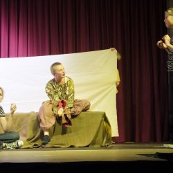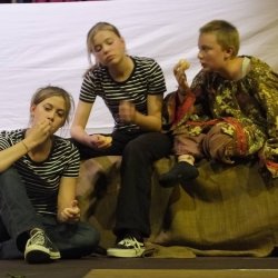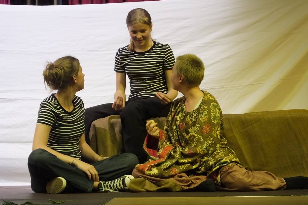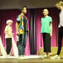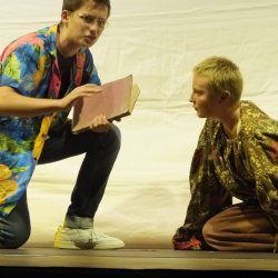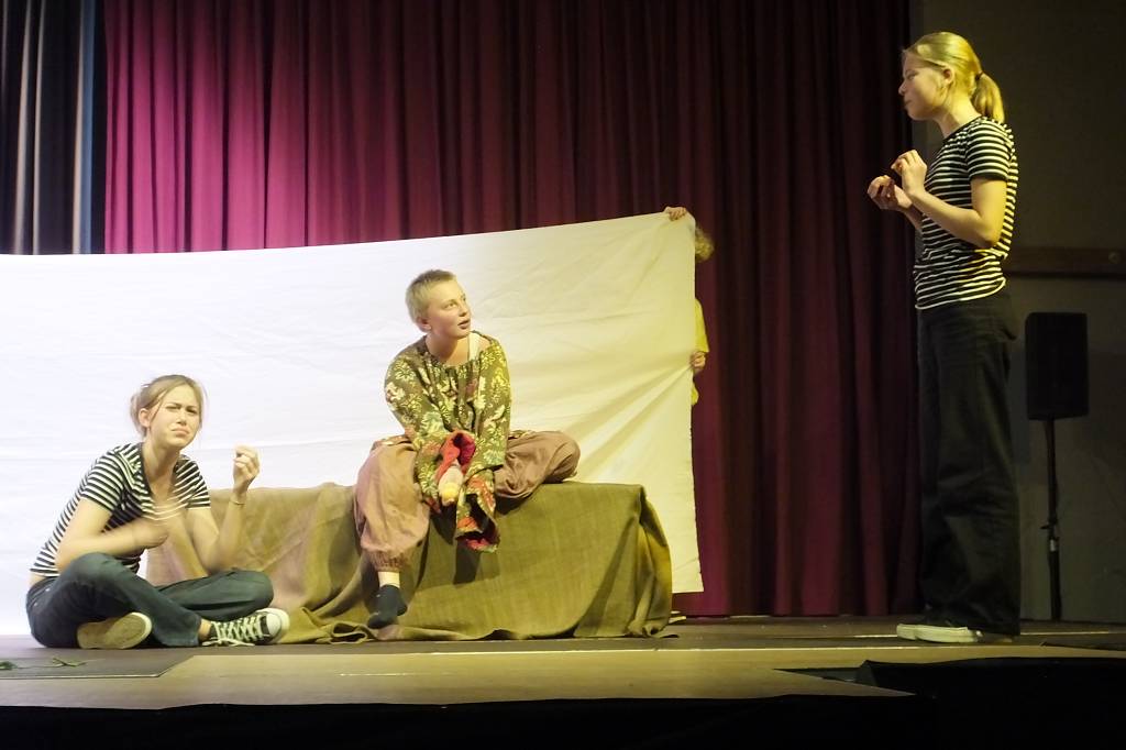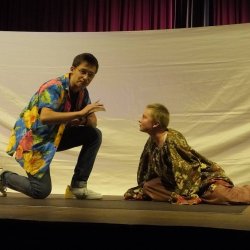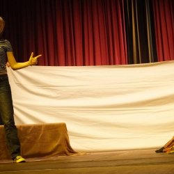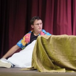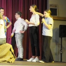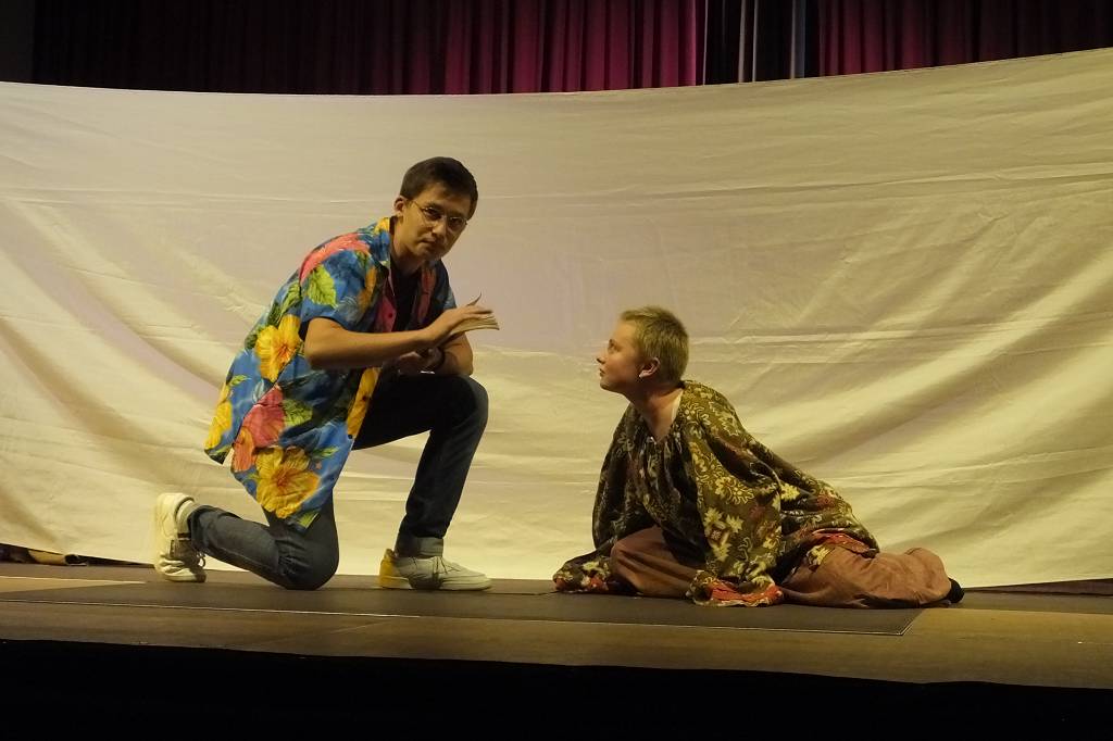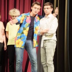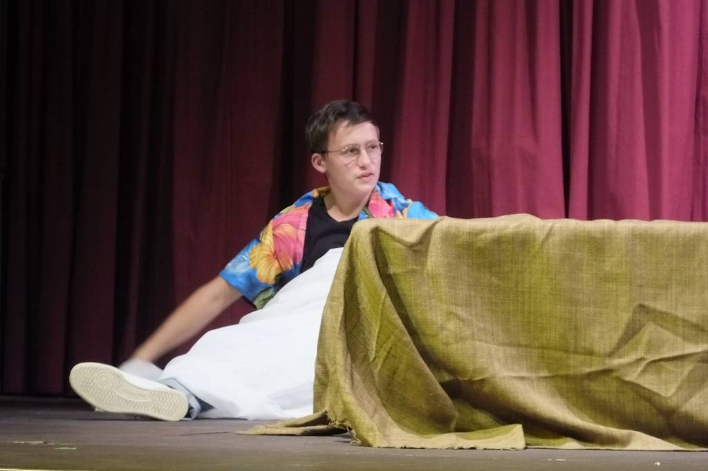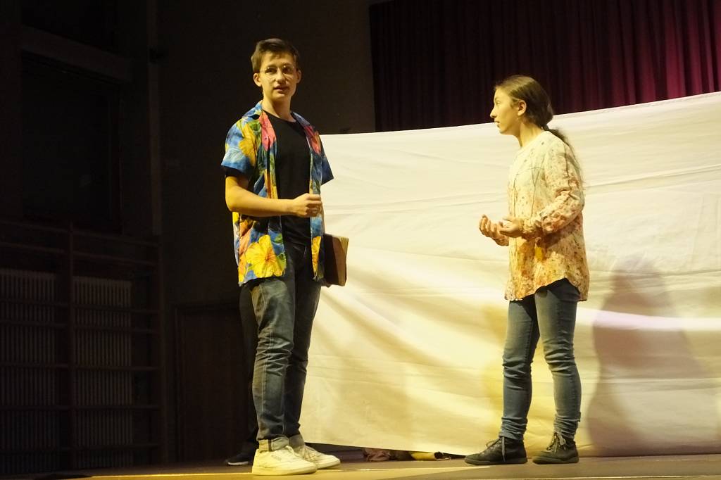 Nun denn – man ahnt – allein mit dem Schiffbruch ist es nicht getan. Auf der Insel wird das Treiben dann erst so richtig wild – und das liegt nicht nur an den Geistern, die das Umherirren der einzelnen Figuren auf der Insel szenisch geschickt mittels seidiger Tücher verdeutlichen. Mittels dieser führen sie die Gestrandeten sichtbar an der Nase herum und Ruta Bauernschmitt (9b), Charlotte Guhl (9c), Magdalena Hahn (9b), Max Müller (9b) sowie Ida Schwarzenberger (9c) haben sichtlich ihren Spaß in der Umsetzung der Geisterrollen – sie stupsen gelassen an der einen und feixen gekonnt an so manch anderer Stelle – immer präsent und ganz stimmig in ihrer Rolle als Nebelgeister – klasse!