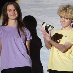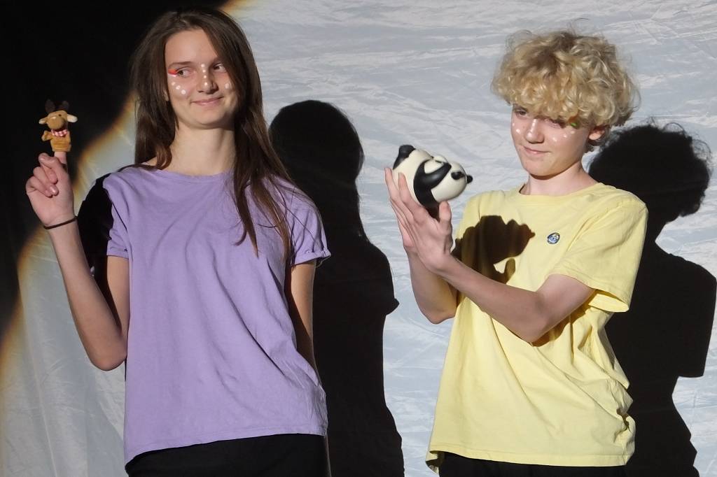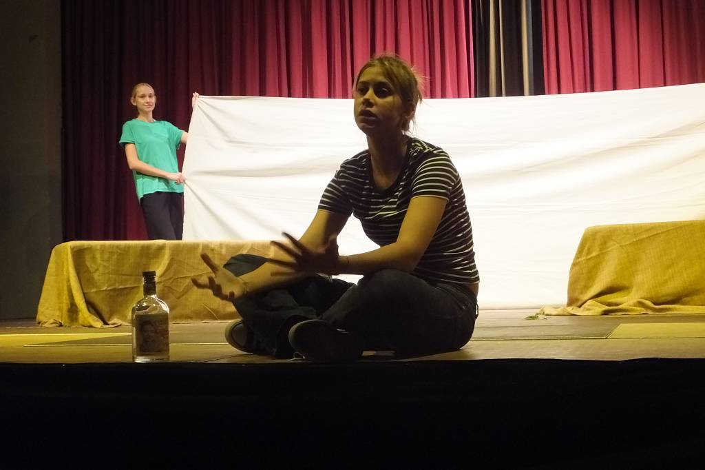 Gleich zu Beginn überbringt ein Team lebendiger Geister mit einem gelungenen Schattenspiel die wesentlichen Hintergrundinformationen ins Licht – begleitet von eindrucksvoller Musik und einer sicheren Erzählerstimme (Magdalena Hahn). So erfährt man sogleich, dass der von seinem Bruder aus einem Handelsimperium verstoßene Prosper (smart von Elias Maximtschuk 10d verkörpert) mit seiner Tochter Mira, die in ihrer Naivität überzeugend von Lina Runschke (10d) dargestellt wird, auf einer Insel Schutz gefunden hat und sich dort zum Herrscher über das Zauberwesen Caliban erhoben hat. Johanna Losgar (Q11) gelingt es wirklich gekonnt, dieses vielschichtige Doppelwesen Caliban verspielt und intensiv aus dem Gros bekannter Wesen herauszuheben und ihm eine eigene Sprache zu verleihen, die kontrastiv die Handlungen der Menschen immer wieder hinterfragt und entlarvt.