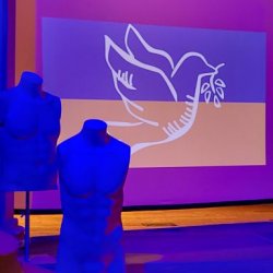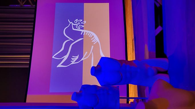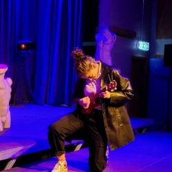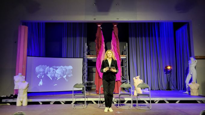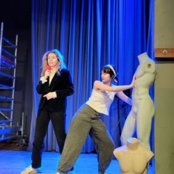 Diese Verweigerung ist den Medien natürlich eine Pressekonferenz wert, die Maja Wenker souverän und mit grandioser Mimik durchführt, wobei Amelie Eberth bewundernswert variabel und unterhaltsam zwischen den unterschiedlichen Charakteren der fragenden Journalisten wechselt. Die Antwort, nämlich dass sich die Frauen ignoriert und diskriminiert fühlen, wird ihnen mit dem Originaltext von Aristophanes, nachdrücklich genervt vorgetragen von Jana Peterson, Zoe Rigopolous und Anna Ulbricht, präsentiert. Natürlich versuchen die Männer das Tor einzunehmen, insbesondere Muskuloss, von Johanna Krug herrlich macho-mäßig verkörpert, will den Frauen Feuer machen, doch eine vorwitzige Lilly Beyer, eine schnippische Mia Loskarn und eine energische Sophia Gräbner als weitere Athenerin wehren sich erfolgreich. Lysistrata erhöht den Druck, indem sie sich der Staatskasse bemächtigt und in einem eindrucksvollen Monolog die Rolle der Frau in Kriegszeiten emotional und sarkastisch auf den Punkt bringt: „Ich hielt den Mund.“ Vehementer und radikaler geht dann Anna Ulbricht vor, die sich – ganz an aktuellen Beispielen orientiert – an einem Männertorso festklebt, wo sie in einem tollen Solo die Auswirkungen des Krieges auf die Frauen herausstellt: „Seit Kriegsbeginn ist mein Uterus Staatsgebiet.“ Sie prangert an, dass Liebe so zum politischen Mittel in militärischen Auseinandersetzungen wird – der selbst verfasste Text und ihr Schauspiel beeindrucken das Publikum sichtlich.