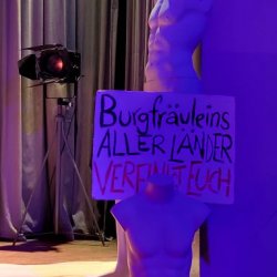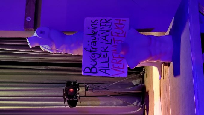 So langsam werden die auf Entzug befindlichen Männer aber verzweifelt: Ein liebestoller Kinesias (Merle Bruha) bringt seiner Liebsten ein herrlich schräges Ständchen, was Myrrhine (schön hin- und hergerissen von Mia Loskarn gespielt) beinahe überzeugt, wäre da nicht das weibliche Korrektiv, resolut und überzeugend von Sophia Gräbner gegeben. Doch auch die Frauen-Front bröckelt, Auswege werden in Sexspielzeug und Onlineangeboten gesucht, und Myrrhine bringt Kinesias beinahe dazu, für den Frieden zu stimmen – aber nur beinahe. Da bleibt den Frauen nichts anderes übrig, als die Kriegskasse zu vershoppen – auch hier darf die daraufhin ausbrechende Hysterie durchaus selbstironisch gewertet werden, wenn auch die Szene durch ihre Dynamik einen Höhepunkt darstellt. Ein letztes Mal darf Maja Wenker als Reporterin von der „Front“ berichten, wo den Männern die Waffen ausgehen und sie sich mit Pinienzapfen behelfen müssen wegen der Aktivitäten der „radikal-pazifistischen Widerstandsgruppe“. Erneut gibt es für das tolle Spiel von Maja Szenenapplaus, bevor die Männer aufgeben. Die Erkenntnis, dass Krieg auch nur eine perverse Art des Konsumierens sei, lässt am Ende keine Sieger zu – Männer wie Frauen müssen ihre Rollen hinterfragen, was in einer Filmeinspielung, die mit dem Text „Pack deine Sachen“ von Paul B. Preciado unterlegt ist, deutlich gesagt wird. Während man sieht, wie Büstenhalter verbrannt und – auch hier wieder mit einem Augenzwinkern, befindet man sich nicht schon wieder in einem Klischee? - Tofuwürstchen gegrillt werden und sich die Schauspielerinnen auf einen ungewissen Weg machen, fordert der Text, auf diesem Weg mit allen Konventionen des Menschseins zu brechen, wenn eine Veränderung der Situation möglich sein soll – denn sonst, um zurück zum Eingang zu kommen, hört es nie auf. Ein beeindruckendes Ende, das zum Nachdenken anregt.