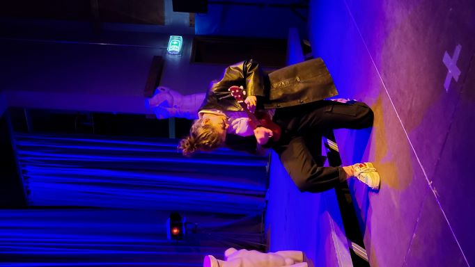 Die Männer kommen allerdings nicht besonders sympathisch daher. Betont schniefend und ihre männlichen Attribute in den Vordergrund rückend betreten zwei Wachen die Bühne. Das ist nur die erste Szene, in der Merle Bruha als Mann derartig glänzend und facettenreich schauspielert, dass es zugleich entlarvend und höchst amüsant ist. Und Maja Wenker wird nicht nur an dieser Stelle ihre grandiose Mimik, Komik und Schauspielfreude unter Beweis stellen. Natürlich darf der Schw..ertvergleich nicht fehlen. Als die Spartanerinnen, keck, selbstbewusst und mit viel Witz dargestellt von Anna Ulbricht, Amelie Eberth und Johanna Krug, auf ihre plumpe Anmache eingehen, sind die Männer doch etwas verunsichert. Schlussendlich sind die Frauen der verfeindeten Lager versammelt und beschnuppern sich misstrauisch in einer sehr schönen Choreographie zum „Pink Panther Theme“. Nun beginnt Lysistratas Überzeugungsarbeit: Nach anfänglichem Widerstand vereinbaren alle Frauen, sich den Männern so lange in Sachen sexueller Begegnung zu versagen, bis das Kämpfen beendet ist. Die Enthaltsamkeit schreckt durchaus auch die Frauen ab, weswegen sie ihren Schwur auf ein die Männer zumindest im Lustgewinn ersetzendes Gerät ablegen, bevor sie das Tor zur Burg verschließen. Ein genialer doppelbödiger Kniff, dass dieses Tor den entsprechend verschlossenen Teil der weiblichen Anatomie darstellt – no entry.