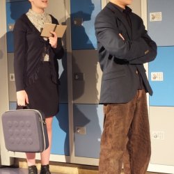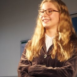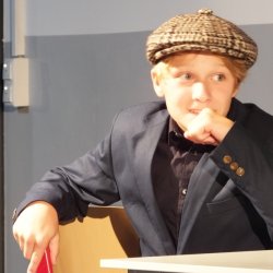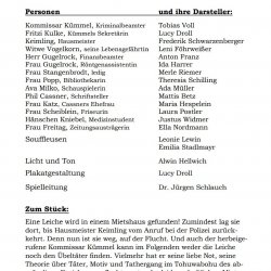 Gut 80 Minuten spielte die Theatergruppe hoch konzentriert und engagiert, sodass die Aufführung beste Unterhaltung bot. Besonders beeindruckend war die Teamleistung – in allen Szenen merkte man, wie die Schauspieler:innen miteinander agierten, aufeinander eingingen und so dem Stück die nötige Schnelligkeit und Spannung verliehen. Die Kostüme waren mit besonderer Sorgfalt gewählt und wirklich stimmig – von der Krawatte des Finanzbeamten über die Schiebermütze des Kommissars bis hin zur Brille seiner Sekretärin. Leonie Lewin (???) und Emilia Stadlmayr waren als Souffleusen stets zur Stelle, wurden aber so gut wie nicht gebraucht. Für das passende Licht und den richtigen Ton sorgte in gewohnter Zuverlässigkeit Alwin Hellwich. Jürgen Schlauch ist mit seiner Truppe ein wirklich beeindruckender Theaterabend in ungewöhnlicher Kulisse gelungen, der weit über ein „Unterstufentheater“ hinausgeht. Großer Applaus belohnte die Truppe am Ende.