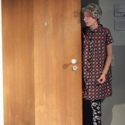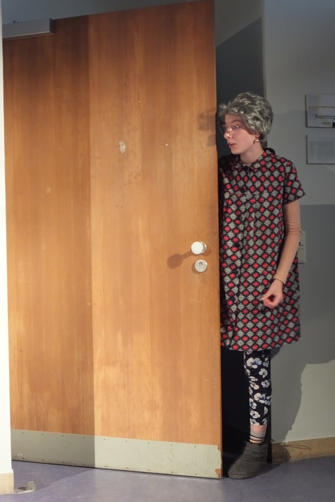 Wobei: „Bühne“ trifft es nicht wirklich – spielte die Truppe doch im Foyer des E.T.A., was, wie der Spielleiter in seiner Begrüßung erklärte, durchaus für Probenprobleme sorgte, da eigentlich nie geprobt werden konnte, ohne dass passierende Schüler durchs Bühnenbild liefen. Dennoch war die Wahl des Ortes gelungen, denn das Foyer eignete sich aufgrund seiner Treppen und Türen hervorragend für das Stück, das in einem Mietshaus spielt.