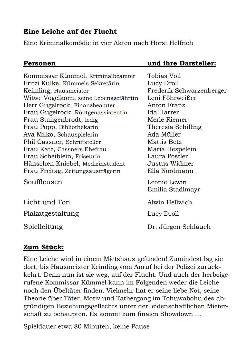 Dass im Krimi eine Leiche gefunden wird, gehört zu den üblichen Bausteinen dieses Genres. Dass die Leiche dann wieder verschwindet, ist eher ungewöhnlich. Aber mit genau diesem Problem beschäftigte sich die Theatergruppe der Klasse 7 in der Krimikomödie „Eine Leiche auf der Flucht“ von Horst Helfrich, die unter der Leitung von Jürgen Schlauch in einer witzigen und unterhaltsamen Art auf die Bühne gebracht wurde.